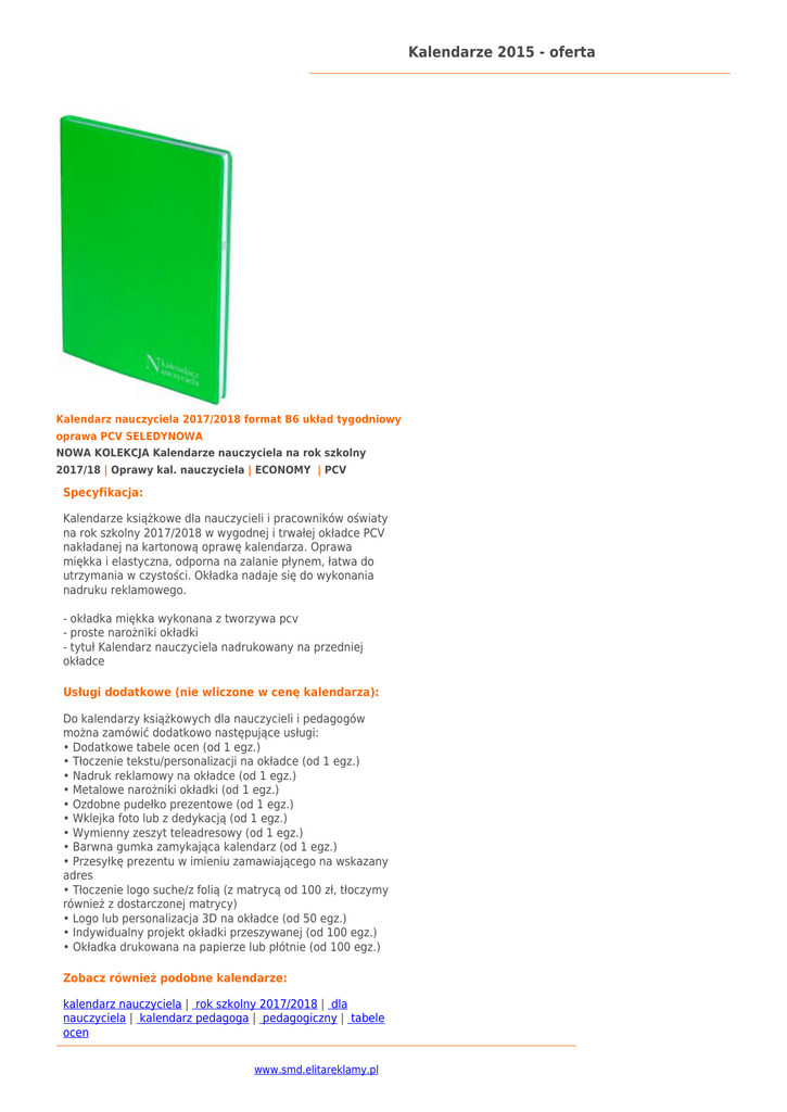 Kalendarze 2015 - oferta Kalendarz nauczyciela 2017/2018 format B6 układ tygodniowy oprawa PCV SELEDYNOWA NOWA KOLEKCJA Kalendarze nauczyciela na rok szkolny 2017/18 | Oprawy kal. nauczyciela | ECONOMY | PCV Specyfikacja: Kalendarze książkowe dla nauczycieli i pracowników oświaty na rok szkolny 2017/2018 w wygodnej i trwałej okładce PCV nakładanej na kartonową oprawę kalendarza. Oprawa miękka i elastyczna, odporna na zalanie płynem, łatwa do utrzymania w czystości. Okładka nadaje się do wykonania nadruku reklamowego. - okładka miękka wykonana z tworzywa pcv - proste narożniki okładki - tytuł Kalendarz nauczyciela nadrukowany na przedniej okładce Usługi dodatkowe (nie wliczone w cenę kalendarza): Do kalendarzy książkowych dla nauczycieli i pedagogów można zamówić dodatkowo następujące usługi: • Dodatkowe tabele ocen (od 1 egz.) • Tłoczenie tekstu/personalizacji na okładce (od 1 egz.) • Nadruk reklamowy na okładce (od 1 egz.) • Metalowe narożniki okładki (od 1 egz.) • Ozdobne pudełko prezentowe (od 1 egz.) • Wklejka foto lub z dedykacją (od 1 egz.) • Wymienny zeszyt teleadresowy (od 1 egz.) • Barwna gumka zamykająca kalendarz (od 1 egz.) • Przesyłkę prezentu w imieniu zamawiającego na wskazany adres • Tłoczenie logo suche/z folią (z matrycą od 100 zł, tłoczymy również z dostarczonej matrycy) • Logo lub personalizacja 3D na okładce (od 50 egz.) • Indywidualny projekt okładki przeszywanej (od 100 egz.) • Okładka drukowana na papierze lub płótnie (od 100 egz.) Zobacz również podobne kalendarze: kalendarz nauczyciela | rok szkolny 2017/2018 | dla nauczyciela | kalendarz pedagoga | pedagogiczny | tabele ocen www.smd.elitareklamy.pl Kalendarze 2015 - oferta www.smd.elitareklamy.pl Kalendarz nauczyciela 2017/2018 format B6 układ tygodniowy Kalendarz nauczyciela 2017/2018 format B6 układ tygodniowy Kalendarz nauczyciela 2017/2018 format B6 układ tygodniowy Specyfikacja: Kalendarz nauczyciela: Specyfikacja: Kalendarz nauczyciela: Specyfikacja: Kalendarz nauczyciela: Objętość: 176 stron Papier biały 70g Wymiary bloku: Format B6 – kartki o wym. 112 x 158 mm Objętość: 176 stron Papier biały 70g Wymiary bloku: Format B6 – kartki o wym. 112 x 158 mm Objętość: 176 stron Papier biały 70g Wymiary bloku: Format B6 – kartki o wym. 112 x 158 mm Dodatek informacyjny dla nauczyciela zawiera tabele: - miejsce na wpisanie danych personalnych - organizacja roku szkolnego 2017/2018 - tabela - terminy posiedzeń Rady Pedagogicznej - tabela - ważne terminy - tabela - wycieczki, wyjazdy, imprezy tabela - zebrania z rodzicami - tabela - plan lekcji nauczyciela na I i II semestr - tabela - plan dyżurów nauczyciela na I i II semestr - tabela - informacje o uczniach - 2 tabele - finanse klasowe – 2 tabele - tabele ocen na I i II semestr – 3 tabele - istnieje możliwość dodania dodatkowych tabel ocen Dodatek informacyjny dla nauczyciela zawiera tabele: - miejsce na wpisanie danych personalnych - organizacja roku szkolnego 2017/2018 - tabela - terminy posiedzeń Rady Pedagogicznej - tabela - ważne terminy - tabela - wycieczki, wyjazdy, imprezy tabela - zebrania z rodzicami - tabela - plan lekcji nauczyciela na I i II semestr - tabela - plan dyżurów nauczyciela na I i II semestr - tabela - informacje o uczniach - 2 tabele - finanse klasowe – 2 tabele - tabele ocen na I i II semestr – 3 tabele - istnieje możliwość dodania dodatkowych tabel ocen Dodatek informacyjny dla nauczyciela zawiera tabele: - miejsce na wpisanie danych personalnych - organizacja roku szkolnego 2017/2018 - tabela - terminy posiedzeń Rady Pedagogicznej - tabela - ważne terminy - tabela - wycieczki, wyjazdy, imprezy tabela - zebrania z rodzicami - tabela - plan lekcji nauczyciela na I i II semestr - tabela - plan dyżurów nauczyciela na I i II semestr - tabela - informacje o uczniach - 2 tabele - finanse klasowe – 2 tabele - tabele ocen na I i II semestr – 3 tabele - istnieje możliwość dodania dodatkowych tabel ocen Kalendarium dla nauczyciela na rok szkolny 2017/2018 zawiera: - kalendarium w układzie tygodniowym od 27.06.2017 do 03.09.2018 - plan roku szkolnego 2017/2018 - skrócone kalendarium na rok 2017 - skrócone kalendarium na rok 2018 - na każdej karcie skrócone kalendarium bieżącego miesiąca Kalendarium dla nauczyciela na rok szkolny 2017/2018 zawiera: - kalendarium w układzie tygodniowym od 27.06.2017 do 03.09.2018 - plan roku szkolnego 2017/2018 - skrócone kalendarium na rok 2017 - skrócone kalendarium na rok 2018 - na każdej karcie skrócone kalendarium bieżącego miesiąca Kalendarium dla nauczyciela na rok szkolny 2017/2018 zawiera: - kalendarium w układzie tygodniowym od 27.06.2017 do 03.09.2018 - plan roku szkolnego 2017/2018 - skrócone kalendarium na rok 2017 - skrócone kalendarium na rok 2018 - na każdej karcie skrócone kalendarium bieżącego miesiąca Część informacyjna kalendarza dla nauczyciela zawiera: - alfabetyczny skorowidz teleadresowy - adresy Kuratoriów Oświaty - numery telefonów do komórek organizacyjnych MEN - numery telefonów do Ośrodka Rozwoju Edukacji - dni wolne od pracy w wybranych krajach - tabela świąt ruchomych - przeliczniki miar długości, odległości, prędkości i temperatury - przedrostki i symbole do tworzenia jednostek wielokrotnych i podwielokrotnych - jednostki podstawowe układu SI - formaty papieru - poprawne nakrycie stołu, naczynia do alkoholi - dobór win i napojów - wartości kaloryczne produktów - dzienne zapotrzebowanie kalorii - liczba spalanych kalorii - daty imienin, znaki zodiaku Część informacyjna kalendarza dla nauczyciela zawiera: - alfabetyczny skorowidz teleadresowy - adresy Kuratoriów Oświaty - numery telefonów do komórek organizacyjnych MEN - numery telefonów do Ośrodka Rozwoju Edukacji - dni wolne od pracy w wybranych krajach - tabela świąt ruchomych - przeliczniki miar długości, odległości, prędkości i temper