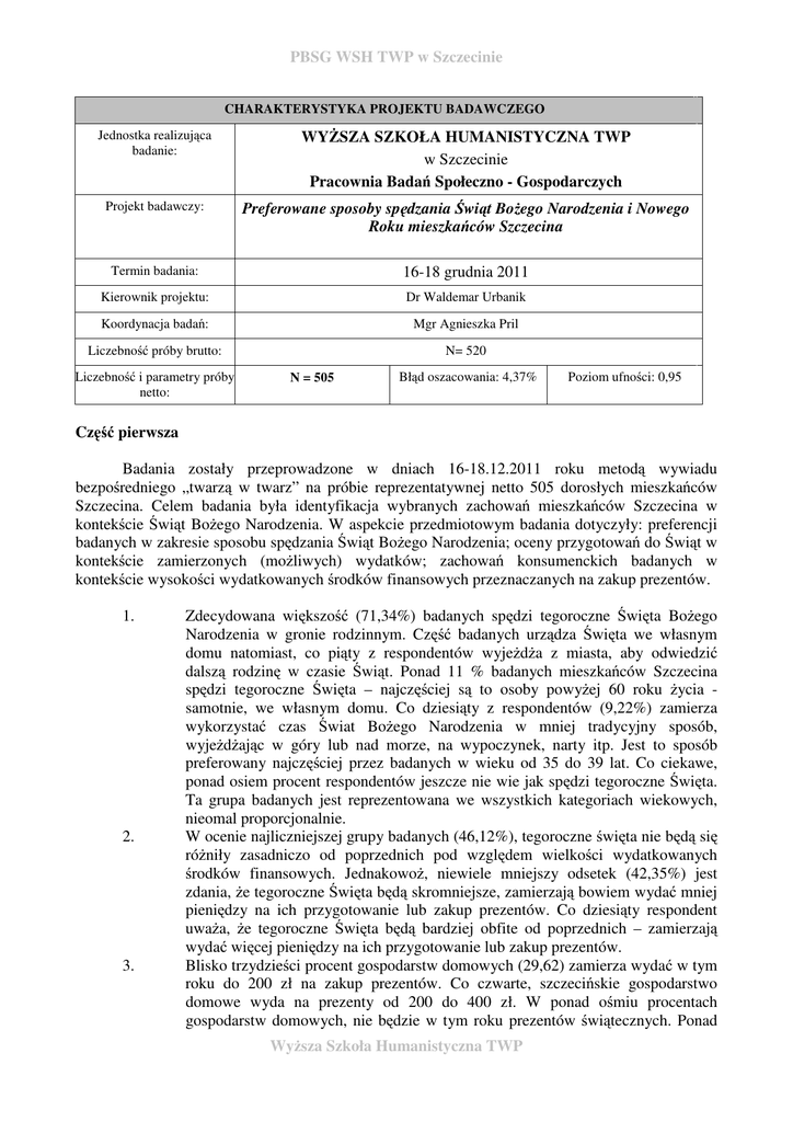 PBSG WSH TWP w Szczecinie CHARAKTERYSTYKA PROJEKTU BADAWCZEGO Jednostka realizująca badanie: WYŻSZA SZKOŁA HUMANISTYCZNA TWP w Szczecinie Pracownia Badań Społeczno - Gospodarczych Projekt badawczy: Preferowane sposoby spędzania Świąt Bożego Narodzenia i Nowego Roku mieszkańców Szczecina Termin badania: 16-18 grudnia 2011 Kierownik projektu: Dr Waldemar Urbanik Koordynacja badań: Mgr Agnieszka Pril Liczebność próby brutto: N= 520 Liczebność i parametry próby netto: N = 505 Błąd oszacowania: 4,37% Poziom ufności: 0,95 Część pierwsza Badania zostały przeprowadzone w dniach 16-18.12.2011 roku metodą wywiadu bezpośredniego „twarzą w twarz” na próbie reprezentatywnej netto 505 dorosłych mieszkańców Szczecina. Celem badania była identyfikacja wybranych zachowań mieszkańców Szczecina w kontekście Świąt Bożego Narodzenia. W aspekcie przedmiotowym badania dotyczyły: preferencji badanych w zakresie sposobu spędzania Świąt Bożego Narodzenia; oceny przygotowań do Świąt w kontekście zamierzonych (możliwych) wydatków; zachowań konsumenckich badanych w kontekście wysokości wydatkowanych środków finansowych przeznaczanych na zakup prezentów. 1. 2. 3. Zdecydowana większość (71,34%) badanych spędzi tegoroczne Święta Bożego Narodzenia w gronie rodzinnym. Część badanych urządza Święta we własnym domu natomiast, co piąty z respondentów wyjeżdża z miasta, aby odwiedzić dalszą rodzinę w czasie Świąt. Ponad 11 % badanych mieszkańców Szczecina spędzi tegoroczne Święta – najczęściej są to osoby powyżej 60 roku życia samotnie, we własnym domu. Co dziesiąty z respondentów (9,22%) zamierza wykorzystać czas Świat Bożego Narodzenia w mniej tradycyjny sposób, wyjeżdżając w góry lub nad morze, na wypoczynek, narty itp. Jest to sposób preferowany najczęściej przez badanych w wieku od 35 do 39 lat. Co ciekawe, ponad osiem procent respondentów jeszcze nie wie jak spędzi tegoroczne Święta. Ta grupa badanych jest reprezentowana we wszystkich kategoriach wiekowych, nieomal proporcjonalnie. W ocenie najliczniejszej grupy badanych (46,12%), tegoroczne święta nie będą się różniły zasadniczo od poprzednich pod względem wielkości wydatkowanych środków finansowych. Jednakowoż, niewiele mniejszy odsetek (42,35%) jest zdania, że tegoroczne Święta będą skromniejsze, zamierzają bowiem wydać mniej pieniędzy na ich przygotowanie lub zakup prezentów. Co dziesiąty respondent uważa, że tegoroczne Święta będą bardziej obfite od poprzednich – zamierzają wydać więcej pieniędzy na ich przygotowanie lub zakup prezentów. Blisko trzydzieści procent gospodarstw domowych (29,62) zamierza wydać w tym roku do 200 zł na zakup prezentów. Co czwarte, szczecińskie gospodarstwo domowe wyda na prezenty od 200 do 400 zł. W ponad ośmiu procentach gospodarstw domowych, nie będzie w tym roku prezentów świątecznych. Ponad Wyższa Szkoła Humanistyczna TWP PBSG WSH TWP w Szczecinie jeden procent badanych gospodarstw domowych wyda na prezenty świąteczne w tym roku ponad 1400 zł. Łącznie, mieszkańcy Szczecina zamierzają wydać na zakup prezentów świątecznych w tym roku kwotę od 39 mln zł do 55,5 mln zł. Statystyczne gospodarstwo domowe zamierza wydać od 290 zł do 420 zł na zakup prezentów. Opracowanie: dr Waldemar Urbanik PYTANIE 11 Treść pytania: Jak zamierza Pan/Pani spędzić w tym roku Święta Bożego Narodzenia ? Rodzaj pytania: łączone - półotwarte jednoodpowiedziowe Liczba respondentów: 499 Rozkład (%) odpowiedzi i estymacja wskaźników struktury 1 odpowiedź (%) błąd oszacowania poziom ufności (1-a) Zostaję w domu, spędzam święta z rodziną 49,70 % 4,39 % 0,95 Wyjeżdżam na święta do rodziny mieszkającej w innym mieście 21,64 % 3,61 % 0,95 Zostaję w domu, spędzam święta samotnie 11,02 % 2,75 % 0,95 Wyjeżdżam na święta ze Szczecina, ale nie do rodziny (np. w góry, nad morze, na narty, za granicę na wypoczynek itp.) 9,22 % 2,54 % 0,95 Jeszcze nie wiem, jak spędzę tegoroczne święta 8,22 % 2,41 % 0,95 w szpitalu 0,20 % 0,39 % 0,95 Suma: 100 % - - Uwaga: wiersze w tabeli zaznaczone na kolorem – swobodnie wypowiedzi badanych. Wyższa Szkoła Humanistyczna TWP PBSG WSH TWP w Szczecinie PYTANIE 2 Treść pytania: Jak ocenia Pan/Pani przygotowania do tegorocznych Świąt Bożego Narodzenia w kontekście wydatków. które zamierza Pan/Pani ponieść? Rodzaj pytania: zamknięte jednoodpowiedziowe Liczba respondentów: 503 ozkład (%) odpowiedzi i estymacja wskaźników struktury odpowiedź (%) błąd oszacowania poziom ufności (1-a) Tegoroczne święta nie będą się w tym wglądzie różniły od poprzednich 46,12 % 4,36 % 0,95 Tegoroczne święta będą skromniejsze od poprzednich zamierzam wydać mniej pieniędzy na prezenty 22,27 % 3,64 % 0,95 Tegoroczne święta będą skromniejsze od poprzednich zamierzam wydać mniej pieniędzy na przygotowania do nich (żywność, ozdoby itp.) 20,08 % 3,50 % 0,95 Tegoroczne święta będą bardziej obfite od poprzednich zamierzam wydać więcej pieniędzy na przygotowania do nich (żywność, ozdoby itp.) 5,96 % 2,07 % 0,95 Tegoroczne święta będą bardziej obfite od poprzednich zamierzam wydać więcej pieniędzy na prezenty 5,57 % 2,00 % 0,95 Suma: 100 % - - PYTANIE 3 Treść pytania: Ile pieniędzy zamierza Pana/Pani rodzina (gospodarstwo domowe) wydać na zakup lub przygotowanie prezentów świątecznych w tym roku? Rodzaj pytania: zamknięte jednoodpowiedziowe Liczba respondentów: 503 Rozkład (%) odpowiedzi i estymacja wskaźników struktury odpowiedź (%) błąd oszacowania poziom ufności (1-a) do 200 zł 29,62 % 3,99 % 0,95 do 201 do 400 zł 25,45 % 3,81 % 0,95 od 401 do 600 zł 16,10 % 3,21 % 0,95 nie zamierzamy robić sobie żadnych prezentów 8,55 % 2,44 % 0,95 od 601 do 800 zł 8,35 % 2,42 % 0,95 od 801 do 1000 zł 5,57 % 2,00 % 0,95 od 1001 do 1200 zł 2,58 % 1,39 % 0,95 od 1201 do 1400 zł 2,39 % 