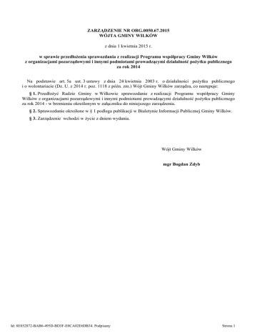 ZARZĄDZENIE NR ORG.0050.67.2015 WÓJTA GMINY WILKÓW z dnia 1 kwietnia 2015 r. w sprawie przedłożenia sprawozdania z realizacji Programu współpracy Gminy Wilków z organizacjami pozarządowymi i innymi podmiotami prowadzącymi działalność pożytku publicznego za rok 2014 Na podstawie art. 5a ust. 3 ustawy z dnia 24 kwietnia 2003 r. o działalności pożytku publicznego i o wolontariacie (Dz. U. z 2014 r. poz. 1118 z późn. zm.) Wójt Gminy Wilków zarządza, co następuje: § 1. Przedłożyć Radzie Gminy w Wilkowie sprawozdanie z realizacji Programu współpracy Gminy Wilków z organizacjami pozarządowymi i innymi podmiotami prowadzącymi działalność pożytku publicznego za rok 2014 - w brzmieniu określonym w załączniku do niniejszego zarządzenia. § 2. Sprawozdanie określone w § 1 podlega publikacji w Biuletynie Informacji Publicznej Gminy Wilków. § 3. Zarządzenie wchodzi w życie z dniem wydania. Wójt Gminy Wilków mgr Bogdan Zdyb Id: 8E852872-BAB6-495D-BD3F-E0CA02E6DB34. Podpisany Strona 1 Załącznik do Zarządzenia Nr ORG.0050.67.2015 Wójta Gminy Wilków z dnia 1 kwietnia 2015 r. Sprawozdanie z realizacji Programu współpracy Gminy Wilków z organizacjami pozarządowymi i innymi podmiotami prowadzącymi działalność pożytku publicznego za rok 2014 Zgodnie z art. 5a ust. 3 ustawy z dnia 24 kwietnia 2003 r. o działalności pożytku publicznego i o wolontariacie (Dz.U. z 2014 r. poz. 1118 z późn.zm.) Wójt Gminy Wilków w terminie do 30 kwietnia każdego roku zobowiązany jest przedłożyć Radzie Gminy sprawozdanie z realizacji programu współpracy z organizacjami pozarządowymi oraz podmiotami prowadzącymi działalność pożytku publicznego za rok poprzedni. Program współpracy Gminy Wilków z organizacjami pozarządowymi oraz podmiotami wymienionymi w art 3 ust. 3 ustawy o działalności pożytku publicznego i o wolontariacie przyjęty został przez Radę Gminy w Wilkowie uchwałą Nr XXX/233/13 z dnia 19 listopada 2013 r. w sprawie uchwalenia Programu współpracy Gminy Wilków z organizacjami pozarządowymi i innymi podmiotami prowadzącymi działalność pożytku publicznego na rok 2014. Realizacja programu wiązała się z szeroko rozumianą promocją i upowszechnianiem działalności dla dobra wspólnoty samorządowej. Sprawozdanie zostało przygotowane w oparciu o bieżący monitoring współpracy i analizę sprawozdań organizacji z realizacji poszczególnych zadań publicznych, zleconych i dofinansowanych przez Gminę Wilków w 2014 roku. Głównym celem programu jest kształtowanie demokratycznego ładu społecznego w środowisku lokalnym, poprzez budowanie partnerstwa między administracją publiczną i organizacjami pozarządowymi oraz innymi podmiotami. Cele szczegółowe programu obejmowały: 1) rozwijanie aktywności społecznej i budowanie społeczeństwa obywatelskiego; 2) stwarzanie warunków do zwiększenia aktywności społecznej mieszkańców Gminy; 3) umacnianie w świadomości społecznej poczucia odpowiedzialności za swoje otoczenie, wspólnotę lokalną oraz jej tradycje; 4) zwiększenie efektywności realizowanych zadań publicznych. 1. Współpraca finansowa (otwarte konkursy ofert). W programie określono przede wszystkim priorytetowe obszary współpracy i zadania publiczne w oparciu o przeprowadzone konsultacje społeczne i zdiagnozowane potrzeby społeczne - adekwatne do potencjału osobowego, organizacyjnego i rzeczowego lokalnego sektora społecznego, jak również finansowych możliwości naszej Gminy. Jedną z form współpracy Gminy Wilków z organizacjami pozarządowymi w 2014 roku, obok współpracy pozafinansowej, była współpraca finansowa. Polegała ona na zlecaniu organizacjom pozarządowym realizacji zadań publicznych należących do Gminy Wilków w zakresie określonym w art. 4 ust. 1 ustawy. Zlecanie zadań może mieć charakter wsparcia, czyli dofinansowania realizacji zadania lub powierzenia, czyli finansowania realizacji zadania. Na realizację zadań publicznych przez organizacje pozarządowe oraz podmioty, o których mowa w art. 3 ust 3 ustawy z dnia 24 kwietnia 2003 r., w budżecie Gminy Wilków na 2014 rok przeznaczono kwotę 35 000,00 zł. W 2014 roku ogłoszono konkurs ofert na realizację zadań publicznych przez organizacje pozarządowe. Konkurs został ogłoszony zarządzeniem Wójta Gminy Wilków Nr ORG.0050.489.2014 z dnia 3 lutego 2014 r., a nabór ofert trwał do 25.02.2014 r. Id: 8E852872-BAB6-495D-BD3F-E0CA02E6DB34. Podpisany Strona 1 W tym czasie wpłynęły dwie oferty. Konkurs dotyczył realizacji zadań publicznych w obszarze rozwijania kultury fizycznej, sportu i rekreacji i podzielony był na dwa zadania: 1. Propagowanie i rozwijanie kultury fizycznej, sportu i rekreacji na terenie Gminy Wilków z wyłączeniem sportu dla dzieci i młodzieży do lat 17. 2. Propagowanie i rozwijanie kultury fizycznej, sportu i rekreacji na terenie Gminy Wilków w sporcie szkolnym wśród dzieci i młodzieży do lat 17. Do konkursu przystąpiły dwa podmioty, z których każdy złożył po jednej ofercie na poszczególne zadania. - Propagowanie i rozwijanie kultury fizycznej, sportu i rekreacji na terenie Gminy z wyłączeniem sportu dla dzieci i młodzieży do lat 17 - podpisano umowę na kwotę 30.000,00 zł; Wilków - Propagowanie i rozwijanie kultury fizycznej, sportu i rekreacji na terenie Gminy Wilków w sporcie szkolnym wśród dzieci i młodzieży do lat 17- podpisano umowę na kwotę 5.000,00 zł. Zgodnie z procedurą konkursową określoną w Programie współpracy oferty zostały zweryfikowane pod względem formalnym przez komisję konkursową. W wyniku rozstrzygnięcia konkursu podpisano umowy z 2 podmiotami na realizację 2 zadań. W konkursie rozdysponowano łącznie kwotę 35 000,00 zł, tj. w podziale na poszczególne zadania: Komisja konkursowa zaproponowała przyznać: - Gminnemu Zrzeszeniu „Ludowe Zespoły Sportowe” w Wilkowie na realizację zadania - Propagowanie i rozwij