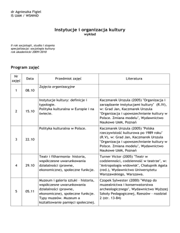 dr Agnieszka Figiel IS UAM / WSNHiD Instytucje i organizacja kultury wykład II rok socjologii, studia I stopnia specjalizacja: socjologia kultury rok akademicki 2009/2010 Program zajęć Nr zajęć Data 1 08.10 2 3 4 5 15.10 Przedmiot zajęć Zajęcia organizacyjne Instytucje kultury: definicje i typologie. Polityka kulturalna w Europie i na świecie. Kaczmarek Urszula (2005) "Organizacja i zarządzanie instytucjami kultury" (R.IV), w: Grad Jan, Kaczmarek Urszula "Organizacja i upowszechnianie kultury w Polsce. Zmiana modelu", Wydawnictwo Naukowe UAM, Poznań Polityka kulturalna w Polsce. Kaczmarek Urszula (2005) "Polska rzeczywistość kulturowa po 1989 roku" (R.V), w: Grad Jan, Kaczmarek Urszula "Organizacja i upowszechnianie kultury w Polsce. Zmiana modelu", Wydawnictwo Naukowe UAM, Poznań Teatr i filharmonia– historia, współczesne uwarunkowania działalności (prawne, ekonomiczne), społeczne funkcje. Turner Victor (2005) "Teatr w codzienności, codzienność w teatrze", w: "Antropologia widowisk", Chałupnik Agata (red.), Wydawnictwo Uniwersytetu Warszawskiego, Warszawa. Muzeum i galeria sztuki – historia, współczesne uwarunkowania działalności (prawne, ekonomiczne), społeczne funkcje. Typy muzeów. Muzeum a kształtowanie pamięci społecznej. Czopek Sylwester (2000) "Wstęp do muzealnictwa i konserwatorstwa archeologicznego", Wydawnictwo Wyższej Szkoły Pedagogicznej, Rzeszów - rozdział 2 (str. 13-84) 22.10 29.10 05.11 Literatura 6 7 8 12.11 19.11 Biblioteki i archiwa – historia, współczesne uwarunkowania działalności (prawne, ekonomiczne), społeczne funkcje. Typy bibliotek i archiwów. Rola biblioteki w społeczeństwie wiedzy. Archiwum a kształtowanie pamięci społecznej. Wołosz Jan (2007) "Biblioteki publiczne czyj przedmiot troski?", w: "Od księgoznawstwa przez bibliotekoznawstwo do nauki o informacji XXI w.", Jan Leończuk (red.), Książnica Podlaska im. Łukasza Górnickiego, Białystok Instytucje kultury a wymagania współczesności: marketing, zarządzanie, promocja, sponsoring. Internet w kulturze, czyli „wirtualne” instytucje kultury. Kuprel Barbara (2007) "Internet na usługach promocji książki dziecięcej", w: "Od księgoznawstwa przez bibliotekoznawstwo do nauki o informacji XXI w.", Jan Leończuk (red.), Książnica Podlaska im. Łukasza Górnickiego, Białystok Uczestnictwo w kulturze: uwarunkowania i wzory. Grad Jan (2005) "Kultura - uczestnictwo w kulturze - upowszechnienie kultury (rozumienie pojęć)" (R.I) w: Grad Jan, Kaczmarek Urszula "Organizacja i upowszechnianie kultury w Polsce. Zmiana modelu", Wydawnictwo Naukowe UAM, Poznań 26.11 Grad Jan (2005) "Uczestnictwo w kulturze artystycznej społeczeństwa polskiego i jego uwarunkowania" (R.II) w: Grad Jan, Kaczmarek Urszula "Organizacja i upowszechnianie kultury w Polsce. Zmiana modelu", Wydawnictwo Naukowe UAM, Poznań Lektury uzupełniające – według sylabusu.