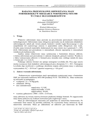 VII KONFERENCJA ODLEWNICZA TECHNICAL 2004 BADANIA PRZEMYSŁOWE ODŚWIEŻANIA MASY FORMIERSKIEJ W MIESZARCE WIRNIKOWEJ MTI-500 W CYKLU DŁUGOOKRESOWYM BADANIA PRZEMYSŁOWE ODŚWIEŻANIA MASY FORMIERSKIEJ W MIESZARCE WIRNIKOWEJ MTI-500 W CYKLU DŁUGOOKRESOWYM Józef DAŃKO 1 Aleksander FEDORYSZYN 2 Rafał DAŃKO3 Wydział Odlewnictwa Akademia Górniczo-Hutnicza im. Stanisława Staszica 1. Wstęp. Właściwe odświeżanie masy pozwala na przywrócenie pierwotnych właściwości technologicznych. Odświeżanie masy obiegowej sprowadza się do dodawania składników odświeżających, takich jak: świeży piasek, bentonit i nośnik węgla błyszczącego w celu uzupełnienia ich częściowego zużycia w poprzednim cyklu obiegowym oraz wody. Zwykle suma świeżych materiałów dodawanych do masy mieści się w granicach 5 20% [6,8]. Odświeżanie jest prowadzone w mieszarkach, obecnie najczęściej w mieszarkach wirnikowych (turbinowych). Analiza zmian właściwości masy syntetycznej z bentonitem dotyczy odlewni, w której odświeżanie jest prowadzone w zakresie skrajnych, górnych wartości. Wynika to z faktu wykonywania odlewów w formach przy stosunku mas: ciekłego metalu do masy w formie jak 1: (≤ 1) [2,3]. Podanego zakresu również nie ujmuje nomogram Levelinka [8]. Przy jego użyciu można wyznaczyć ilość dodatków odświeżających przy obciążeniu 3:1 20:1. Nomogram Levelinka daje możliwość o szybkiego określenia stopnia odświeżenia masy o założonej wytrzymałości R cw = 20 N/cm2 i gęstości usypowej = 0,8 g/cm3. 2. Zakres i warunki odświeżania. Podstawowym wyposażeniem stacji sporządzania syntetycznej masy z bentonitem SMF jest mieszarka turbinowa MTI-500 produkcji P.P.P. TECHNICAL. Dane techniczne tej mieszarki są następujące: wydajność: 15 18 Mg/godz, załadunek: 500 kg, moc zainstalowana: napęd misy: 5,5 kW, napęd mieszadła: 15 kW, napęd turbiny: 30 kW, wymiary gabarytowe: 2900 1630 2110 mm, masę odświeża się świeżą osnową (świeżym piaskiem) dodając bentonit. Po zagęszczeniu masy formy pokrywa się wodnym roztworem pyłu węglowego i suszy. Masa po odświeżającym mieszaniu jest podawana na stanowiska formowania. Po wykonaniu form nanosi się powłokę ochronną. Po wysuszeniu formy umieszcza się na stanowisku zalewania. Masa po oddzieleniu od odlewów jest kierowana do SMF 1 prof. dr hab. inż. [email protected] dr hab. inż., prof nadzw. [email protected] 3 mgr inż[email protected] 2 103 VII KONFERENCJA ODLEWNICZA TECHNICAL 2004 Odlewnictwo XXI wieku technologie, maszyny i urządzenia odlewnicze przenośnikami. Ma miejsce oddzielanie zanieczyszczeń przy użyciu sita obrotowego oraz oddzielaczy elektromagnetycznych: taśmowego i bębnowego. W celu wyznaczenia stopnia utraty właściwości masy przeprowadzono analizę rozkładu temperatury masy w formie po zalaniu metalem. Zainstalowano czujniki do pomiaru temperatury połączone z komputerowym układem rejestrującym. Oprzyrządowanie do pomiaru temperatury masy w formie przedstawiono na rysunku 1 (rys. 24/2 a i b). Na rysunku 2 przedstawiono rozkład temperatury w czasie 24-godzinnych badań. a) b) Rys.1. Oprzyrządowanie do pomiaru temperatury masy w formie oraz w rdzeniu wlewnicy. a- układ rejestracji, b- termopary. Rys.2. Schemat rozmieszczenia termopar w formie wykonanej z masy klasycznej z bentonitem. Z danych wynika, że warstwy masy z bentonitem oddalone od powierzchni odlewu na odległość ≥ 135 mm nie nagrzewają się powyżej 4600C. Jest to zakres poniżej temperatury dehydratacji bentonitu. Jedynie warstwy masy rdzenia, w odległości ok. 75 mm od powierzchni wewnętrznej wlewnicy oraz masa w odległości ok. 70 mm od powierzchni zewnętrznej odlewu wlewnicy uzyskują temperaturę powyżej 6000C. Na podstawie tych badań ustalono, że po każdym cyklu wytwarzania 70÷80% masy będzie kierowane do odświeżenia dodatkiem piasku świeżego oraz bentonitu BENTOMAK. 104 Nowa Sól 3-4.06.2004 r. VII KONFERENCJA ODLEWNICZA TECHNICAL 2004 BADANIA PRZEMYSŁOWE ODŚWIEŻANIA MASY FORMIERSKIEJ W MIESZARCE WIRNIKOWEJ MTI-500 W CYKLU DŁUGOOKRESOWYM termopara 200 mm termnopara 135 mm termopara 100 mm termopara 65 mm termopara 30 mm rdzeń 800 700 Temperatura formy, 0C 600 500 400 300 200 100 0 0 5 10 15 20 Czas wytrzymania odlewu w formie, h Rys.3. Rozkład temperatury masy w formie w funkcji czasu wytrzymania odlewu w formie. Ilość dodawanego bentonitu i wilgotnego piasku kwarcowego przedstawiono na rysunkach 3 i 4. Ilość piasku świeżego, % 30 25 20 śr. 23,0 % (16,0 - 28,0) 15 1-01 21-01 10-02 1-03 21-03 10-04 30-04 20-05 9-06 29-06 19-07 8-08 28-08 17-09 7-10 Data, 2003 Rys.4. Ilość dodawanego piasku kwarcowego podczas odświeżania. 105 Odlewnictwo XXI wieku technologie, maszyny i urządzenia odlewnicze VII KONFERENCJA ODLEWNICZA TECHNICAL 2004 6 Ilość dodawanego bentonitu, % 5,5 5 4,5 4 3,5 śr. 4,2 % (3,6 - 5,6) 3 1-01 21-01 10-02 1-03 21-03 10-04 30-04 20-05 9-06 29-06 19-07 8-08 28-08 17-09 7-10 Data, 2003 Rys.5. Ilość dodawanego materiału wiążącego podczas odświeżającego mieszania. Ilość dodawanej wody podczas odświeżającego mieszania była wyznaczana na podstawie pomiaru średniej wilgotności i temperatury w podajniki masy zwrotnej i wilgotnego piasku świeżego. Wilgotność masy zwrotnej i piasku kwarcowego przedstawiono na rysunku 5. 5 4,5 śr. 3,44 (1,99 - 4,82) piasek świeży 4 Wilgotność w, % 3,5 3 2,5 2 1,5 1 masa obiegowa śr. 0,26 (0,02 - 1,50) 0,5 0 1-01 21-01 10-02 1-03 21-03 10-04 30-04 20-05 9-06 29-06 19-07 8-08 28-08 17-09 7-10 Data, 2003 Rys. 6. Zmiany wilgotności masy zwrotnej oraz piasku odświeżającego. Wilgotność masy po odświeżającym mieszaniu przedstawiała się jak na rysunku 6; kwadratami oznaczono wartości zadane. 106 Nowa Sól 3-4.06.2004 r. VII KONFERENCJA ODLEWNICZA TECHNICAL 2004 BADANIA PRZEMYSŁOWE ODŚWIEŻANIA MASY FORMIERSKIEJ W MIESZARCE WIRNIKOWEJ MTI-500 W CYKLU DŁUGOOKRESOWYM 4,4 Wilgotność w,