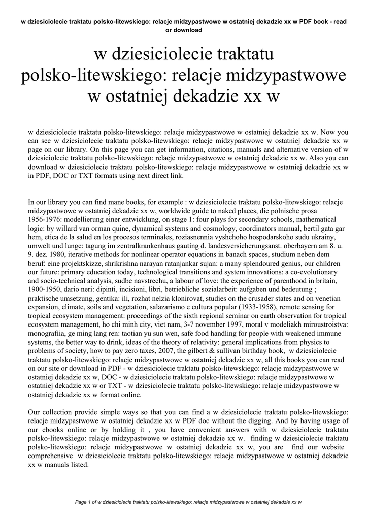 w dziesiciolecie traktatu polsko-litewskiego: relacje midzypastwowe w ostatniej dekadzie xx w PDF book - read or download w dziesiciolecie traktatu polsko-litewskiego: relacje midzypastwowe w ostatniej dekadzie xx w w dziesiciolecie traktatu polsko-litewskiego: relacje midzypastwowe w ostatniej dekadzie xx w. Now you can see w dziesiciolecie traktatu polsko-litewskiego: relacje midzypastwowe w ostatniej dekadzie xx w page on our library. On this page you can get information, citations, manuals and alternative version of w dziesiciolecie traktatu polsko-litewskiego: relacje midzypastwowe w ostatniej dekadzie xx w. Also you can download w dziesiciolecie traktatu polsko-litewskiego: relacje midzypastwowe w ostatniej dekadzie xx w in PDF, DOC or TXT formats using next direct link. In our library you can find mane books, for example : w dziesiciolecie traktatu polsko-litewskiego: relacje midzypastwowe w ostatniej dekadzie xx w, worldwide guide to naked places, die polnische prosa 1956-1976: modellierung einer entwicklung, on stage 1: four plays for secondary schools, mathematical logic: by willard van orman quine, dynamical systems and cosmology, coordinators manual, bertil gata gar hem, etica de la salud en los procesos terminales, roziasnennia vyshchoho hospodarskoho sudu ukrainy, umwelt und lunge: tagung im zentralkrankenhaus gauting d. landesversicherungsanst. oberbayern am 8. u. 9. dez. 1980, iterative methods for nonlinear operator equations in banach spaces, studium neben dem beruf: eine projektskizze, shrikrishna narayan ratanjankar sujan: a many splendoured genius, our children our future: primary education today, technological transitions and system innovations: a co-evolutionary and socio-technical analysis, sudbe navstrechu, a labour of love: the experience of parenthood in britain, 1900-1950, dario neri: dipinti, incisioni, libri, betriebliche sozialarbeit: aufgaben und bedeutung ; praktische umsetzung, gentika: ili, rozhat nelzia klonirovat, studies on the crusader states and on venetian expansion, climate, soils and vegetation, salazarismo e cultura popular (1933-1958), remote sensing for tropical ecosystem management: proceedings of the sixth regional seminar on earth observation for tropical ecosystem management, ho chi minh city, viet nam, 3-7 november 1997, moral v modeliakh miroustroistva: monografiia, ge ming lang ren: taotian yu sun wen, safe food handling for people with weakened immune systems, the better way to drink, ideas of the theory of relativity: general implications from physics to problems of society, how to pay zero taxes, 2007, the gilbert & sullivan birthday book, w dziesiciolecie traktatu polsko-litewskiego: relacje midzypastwowe w ostatniej dekadzie xx w, all this books you can read on our site or download in PDF - w dziesiciolecie traktatu polsko-litewskiego: relacje midzypastwowe w ostatniej dekadzie xx w, DOC - w dziesiciolecie traktatu polsko-litewskiego: relacje midzypastwowe w ostatniej dekadzie xx w or TXT - w dziesiciolecie traktatu polsko-litewskiego: relacje midzypastwowe w ostatniej dekadzie xx w format online. Our collection provide simple ways so that you can find a w dziesiciolecie traktatu polsko-litewskiego: relacje midzypastwowe w ostatniej dekadzie xx w PDF doc without the digging. And by having usage of our ebooks online or by holding it , you have convenient answers with w dziesiciolecie traktatu polsko-litewskiego: relacje midzypastwowe w ostatniej dekadzie xx w. finding w dziesiciolecie traktatu polsko-litewskiego: relacje midzypastwowe w ostatniej dekadzie xx w, you are find our website comprehensive w dziesiciolecie traktatu polsko-litewskiego: relacje midzypastwowe w ostatniej dekadzie xx w manuals listed. Page 1 of w dziesiciolecie traktatu polsko-litewskiego: relacje midzypastwowe w ostatniej dekadzie xx w w dziesiciolecie traktatu polsko-litewskiego: relacje midzypastwowe w ostatniej dekadzie xx w PDF book read or download These review site is the biggest of these which may have hundreds of thousands of different literally products represented. You will also see that there are specific sites catered to different product categories or types, brands or niche categories related to w dziesiciolecie traktatu polsko-litewskiego: relacje midzypastwowe w ostatniej dekadzie xx w. So depending on just what you are searching, you'll be able to choose ebooks w dziesiciolecie traktatu polsko-litewskiego: relacje midzypastwowe w ostatniej dekadzie xx w to fit your own needs, w dziesiciolecie traktatu polsko-litewskiego: relacje midzypastwowe w ostatniej dekadzie xx w. Page 2 of w dziesiciolecie traktatu polsko-litewskiego: relacje midzypastwowe w ostatniej dekadzie xx w