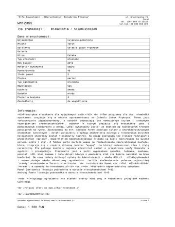 'Alfa Investment - Nieruchomości Doradztwo Finanse' WM12399 Typ transakcji: ul. Grudziądzka 79 Toruń tel. (56) 664 10 25/26 tel.kom +48 888 658 303 mieszkania / najem/wynajem Dane nieruchomości: Województwo kujawsko-pomorskie Miasto Toruń Dzielnica Osiedle Sztuk Pięknych Osiedle Ulica Fałata Typ własności własność Rok budowy 2012 Materiał wykonania cegła Powierzchnia 45 Ilość pokoi 2 Piętro parter Typ ogrzewania miejskie Rozkładowe tak Kuchnia aneks Dodatki winda Pięter w budynku 4 Zasiedlenie do uzgodnienia Informacje: <h2>Przepiękne mieszkanie dla wyjątkowych osób.</h2> <br />Ten przyjemny dla oka, niewielki apartament znajduje się w niskim apartamentowcu na Osiedlu Sztuk Pięknych. Teren jest fantastycznie zagospodarowany, a budynki odznaczają się nowoczesnym stylem i ciekawymi rozwiązaniami architektonicznymi. Budynek w którym znajduje się mieszkanie jest o podwyższonym standardzie z windą. Lokal wykończony został ze smakiem wg najnowszych trendów panujących na rynku. Zastosowano tu min. ciekawe formy zdobiące ściany z charakterystycznymi elementami świetlnymi - dzięki połączeniu ciepłego oświetlenia nocnego z intensywnym światłem halogenowym stworzony został niesamowity nastrój. Na uwagę zasługują też ciekawe rozwiązania przestronnej łazienki. Dopełnieniem modernistycznego klimatu są meble lakierowane na wysoki połysk, szkło i stal. Z faktów warto zwrócić uwagę na fantastycznie zaprojektowaną kuchnię, która integruje się z częścią dzienną poprzez "wyspę", na której umieszczono zlew i płytę ceramiczną. Dla pełnego komfortu najemcy właściciel zadbał o przestronne szafy Komandor w sypialni i przedpokoju. Mieszkanie jest w pełni wyposażone (pralka, lodówka, zastawa, pościel, LCD, kino domowe i inne dzięki którym z pewnością nikt nie będzie narzekał na brak komfortu). Do ceny należy doliczyć opłatę do Administracji - około 400 zł. <h2>Wyjątkowości i uroku dodaje około 40-metrowy ogródek!<br /></h2> <b>Serdecznie polecam najbardziej "trendy" mieszkanie w Toruniu!<i></i></b> <br /><b>Martika Szewa <br />Tel. 603-641-025<br />e-mail: [email protected]</b> <br /><br />Pośrednik odpowiedzialny zawodowo: Paweł Dawidowicz licencja pośrednika w obrocie nieruchomościami 7432 Andrzej Pamin licencja pośrednika w obrocie nieruchomościami 1145 Treść niniejszego ogłoszenia nie stanowi oferty handlowej w rozumieniu przepisów Kodeksu Cywilnego. <br />Więcej ofert na www.alfa-investment.pl <br />ZAPRASZAMY<b></b> Dokument wygenerowany ze strony www.alfa-investment.pl Cena: 1 500 PLN Strona 1