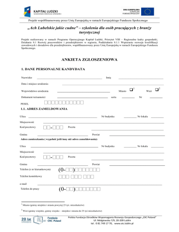 Projekt współfinansowany przez Unię Europejską w ramach Europejskiego Funduszu Społecznego „Ach Lubelskie jakie cudne” – szkolenia dla osób pracujących z branŜy turystycznej Projekt realizowany w ramach Programu Operacyjnego Kapitał Ludzki, Priorytet VIII – Regionalne kadry gospodarki, Działanie 8.1 Rozwój pracowników i przedsiębiorstw w regionie, Poddziałanie 8.1.1 Wspieranie rozwoju kwalifikacji zawodowych i doradztwo dla przedsiębiorstw, współfinansowany przez Unię Europejską w ramach Europejskiego Funduszu Społecznego. ANKIETA ZGŁOSZENIOWA 1. DANE PERSONALNE KANDYDATA Nazwisko ________________________________________________ Data i miejsce urodzenia Imię _________________________________ ___________________________________________________________________________ _________________________ ________________________ seria Województwo urodzenia Dokument toŜsamości Miasto 1 ______ Wieś Nr 2 ______ PESEL 1.1. ADRES ZAMELDOWANIA Ulica ______________________________________ _______ Nr lokalu _______ ___________________________________________________________________ Miejscowość - Kod pocztowy Poczta ____________________________ Gmina Nr budynku ________________________________________ _______________________ Powiat Adres zamieszkania ( wypełnić jeśli inny niŜ adres zameldowania): Ulica ____________________________ _______ Nr lokalu _______ ___________________________________________________________________ Miejscowość - Kod pocztowy Gmina Nr budynku Poczta ____________________________ Telefon (z nr kierunkowym) (0- ________________________________________ Powiat _______________________ ) Telefon komórkowy e-mail _____________________________________________________________________ Telefon do pracy 1 2 (0- ) Miasto (gminy miejskie i miasta powyŜej 25 tyś. mieszkańców) Wieś (gminy wiejskie, gminy wiejsko – miejskie i miasta do 25 tyś mieszkańców) Polska Fundacja Ośrodków Wspomagania Rozwoju Gospodarczego „OIC Poland” Ul. Mełgiewska 7/9, 20-209 Lublin tel. 0 81 749 17 70, www.oic.lublin.pl Projekt współfinansowany przez Unię Europejską w ramach Europejskiego Funduszu Społecznego 1.2 WYKSZTAŁCENIE brak Ponadgimnazjalne Podstawowe Pomaturalne Gimnazjalne WyŜsze Nazwa wykształcenia __________________________________ Zawód _____________________________ Pracuję zawodowo w _______________________________________________________________________ 1.3 SYTUACJA BENEFICJENTA Oświadczam, Ŝe jestem pracownikiem zatrudnionym w branŜy turystycznej (zaznaczyć właściwe): w mikroprzedsiębiorstwie w duŜym przedsiębiorstwie w małym przedsiębiorstwie w instytucji administracji publicznej w średnim przedsiębiorstwie w organizacji pozarządowej umowa o pracę na czas określony do _______________________ Forma zatrudnienia: umowa o pracę na czas nieokreślony inne (jakie?)___________________________________________ Stanowisko Zakres obowiązków _______________________________________________________ _______________________________________________________ _____________________________________________________________ 1.4 DANE DOTYCZĄCE PRACODAWCY Nazwa firmy (w przypadku osób fizycznych prowadzących działalność gospodarczą- imię i nazwisko przedsiębiorcy) ______________________________________________________ _ - NIP Adres firmy - - ______________________________________________________ ______________________________________________________ - Nr telefonu E-mail: Poczta ________________________ _________________ Nr faksu ________________________ ______________________________________________________ Klasa PKD / EKD (oznaczenie czterocyfrowe) BranŜa Hotelarstwo Agroturystyka Biuro podróŜy Ośrodek Informacji Turystycznej Inna (jaka?) ___________________________________________________ Polska Fundacja Ośrodków Wspomagania Rozwoju Gospodarczego „OIC Poland” Ul. Mełgiewska 7/9, 20-209 Lublin tel. 0 81 749 17 70, www.oic.lublin.pl Projekt współfinansowany przez Unię Europejską w ramach Europejskiego Funduszu Społecznego 1.5 OŚWIADCZENIE I PREFERENCJE UCZESTNIKA Imię i Nazwisko _______________________________________________________________________ Adres _______________________________________________________________________ PESEL Niniejszym oświadczam, Ŝe decyduję się na udział w projekcie „Ach Lubelskie jakie cudne” – szkolenia dla osób pracujących z branŜy turystycznej realizowanym w ramach Programu Operacyjnego Kapitał Ludzki, Priorytet VIII, Poddziałanie 8.1.1 oraz akceptuję regulamin projektu. Projekt obejmuje udział w następujących formach wsparcia: 1) Szkolenia językowe Deklaruję swój udział w szkoleniu z języka angielskiego (120 godz., dla wszystkich uczestników) na poziomie: podstawowym (2 razy w tygodniu po 3 godziny na terenie woj. lubelskiego, przewidziany zwrot kosztów dojazdów), średniozaawansowanym (raz w miesiącu, piątek – niedziela, zajęcia w Lublinie, uczestnikom zostanie zagwarantowany nocleg i zwrot kosztów dojazdu) 2) Szkolenia profilowane Po zapoznaniu się z tytułami szkoleń proszę zaznaczyć jedno szkolenie profilowane, którym Pan/Pani jest zainteresowany(a). Chcę być uczestnikiem szkolenia: 1. Obsługa systemów rezerwacyjnych (60 godz., zajęcia w weekendy w Nałęczowie, zapewniony nocleg i wyŜywienie) 2. Animator turystyczny (60 godz., zajęcia w weekendy w Zwierzyńcu, zapewniony nocleg i wyŜywienie) 3. Marketing i promocja usług turystycznych (40 godz. zajęcia w weekendy w Kazimierzu Dolnym, zapewniony nocleg i wyŜywienie) 4. Sporządzanie wniosków o dotacje z UE z zakresu turystyki (120 godz. zajęcia w weekendy w Lublinie, zapewniony nocleg i wyŜywienie) W przypadku braku miejsc na w/w szkolenie jako rezerwowe wybieram: 1. Obsługa systemów rezerwacyjnych 3. Marketing i promocja usług turystycznych 2. Animator turystyczny 4. Sporządzanie wniosków o dotacje z UE z zakresu turystyki 3) Szkolenie z zakresu pracy z klientem (60 godz., dla 