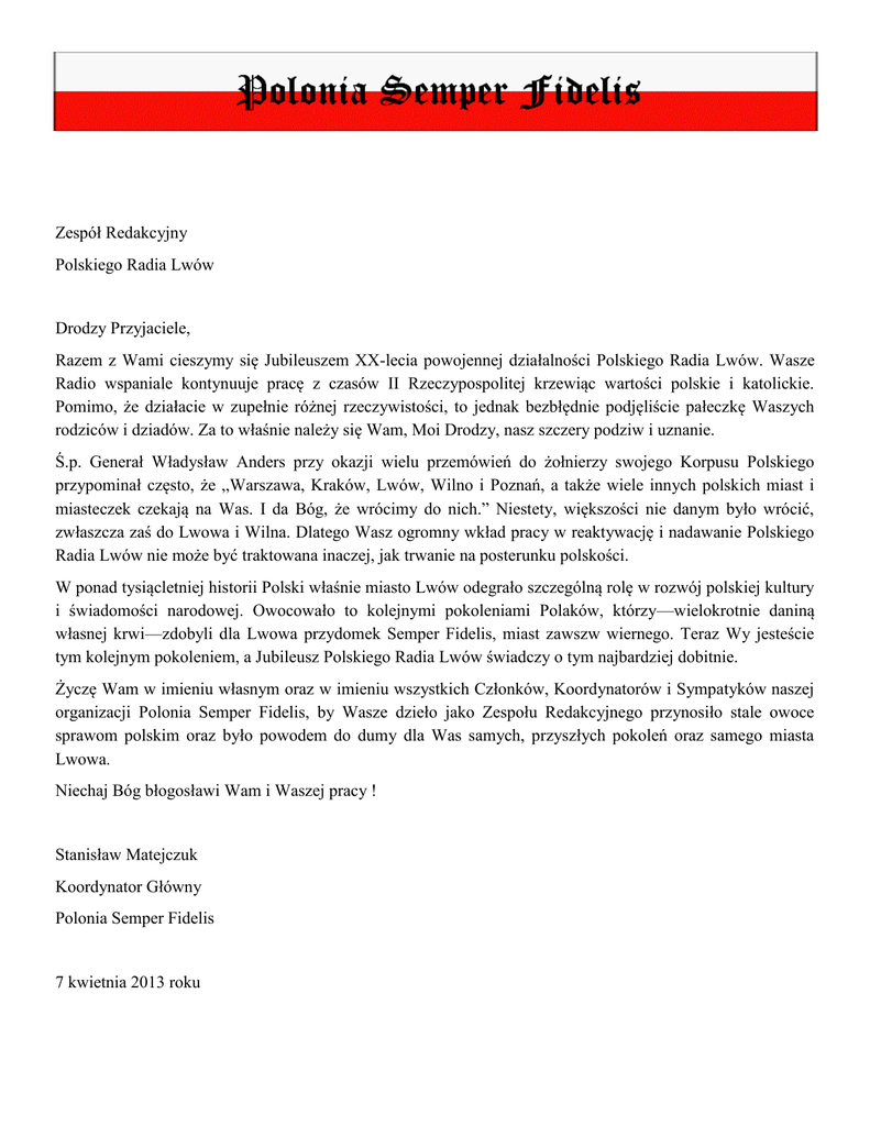 Zespół Redakcyjny Polskiego Radia Lwów Drodzy Przyjaciele, Razem z Wami cieszymy się Jubileuszem XX-lecia powojennej działalności Polskiego Radia Lwów. Wasze Radio wspaniale kontynuuje pracę z czasów II Rzeczypospolitej krzewiąc wartości polskie i katolickie. Pomimo, że działacie w zupełnie różnej rzeczywistości, to jednak bezbłędnie podjęliście pałeczkę Waszych rodziców i dziadów. Za to właśnie należy się Wam, Moi Drodzy, nasz szczery podziw i uznanie. Ś.p. Generał Władysław Anders przy okazji wielu przemówień do żołnierzy swojego Korpusu Polskiego przypominał często, że „Warszawa, Kraków, Lwów, Wilno i Poznań, a także wiele innych polskich miast i miasteczek czekają na Was. I da Bóg, że wrócimy do nich.” Niestety, większości nie danym było wrócić, zwłaszcza zaś do Lwowa i Wilna. Dlatego Wasz ogromny wkład pracy w reaktywację i nadawanie Polskiego Radia Lwów nie może być traktowana inaczej, jak trwanie na posterunku polskości. W ponad tysiącletniej historii Polski właśnie miasto Lwów odegrało szczególną rolę w rozwój polskiej kultury i świadomości narodowej. Owocowało to kolejnymi pokoleniami Polaków, którzy—wielokrotnie daniną własnej krwi—zdobyli dla Lwowa przydomek Semper Fidelis, miast zawszw wiernego. Teraz Wy jesteście tym kolejnym pokoleniem, a Jubileusz Polskiego Radia Lwów świadczy o tym najbardziej dobitnie. Życzę Wam w imieniu własnym oraz w imieniu wszystkich Członków, Koordynatorów i Sympatyków naszej organizacji Polonia Semper Fidelis, by Wasze dzieło jako Zespołu Redakcyjnego przynosiło stale owoce sprawom polskim oraz było powodem do dumy dla Was samych, przyszłych pokoleń oraz samego miasta Lwowa. Niechaj Bóg błogosławi Wam i Waszej pracy ! Stanisław Matejczuk Koordynator Główny Polonia Semper Fidelis 7 kwietnia 2013 roku