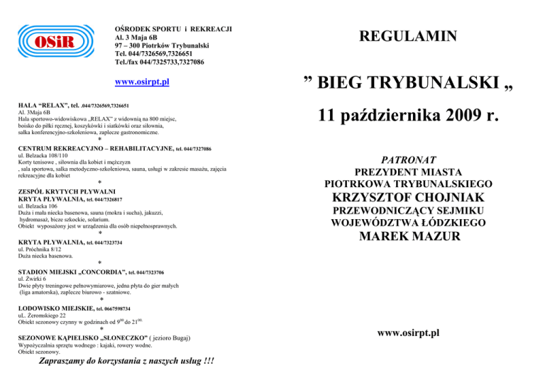OŚRODEK SPORTU i REKREACJI Al. 3 Maja 6B 97 – 300 Piotrków Trybunalski Tel. 044/7326569,7326651 Tel./fax 044/7325733,7327086 www.osirpt.pl HALA “RELAX”, tel. .044/7326569,7326651 Al. 3Maja 6B Hala sportowo-widowiskowa „RELAX” z widownią na 800 miejsc, boisko do piłki ręcznej, koszykówki i siatkówki oraz siłownia, salka konferencyjno-szkoleniowa, zaplecze gastronomiczne. REGULAMIN ” BIEG TRYBUNALSKI „ 11 października 2009 r. * CENTRUM REKREACYJNO – REHABILITACYJNE, tel. 044/7327086 ul. Belzacka 108/110 Korty tenisowe , siłownia dla kobiet i męŜczyzn , sala sportowa, salka metodyczno-szkoleniowa, sauna, usługi w zakresie masaŜu, zajęcia rekreacyjne dla kobiet * ZESPÓŁ KRYTYCH PŁYWALNI KRYTA PŁYWALNIA, tel. 044/7326817 ul. Belzacka 106 DuŜa i mała niecka basenowa, sauna (mokra i sucha), jakuzzi, hydromasaŜ, bicze szkockie, solarium. Obiekt wyposaŜony jest w urządzenia dla osób niepełnosprawnych. * KRYTA PŁYWALNIA, tel. 044/7323734 PATRONAT PREZYDENT MIASTA PIOTRKOWA TRYBUNALSKIEGO KRZYSZTOF CHOJNIAK PRZEWODNICZĄCY SEJMIKU WOJEWÓDZTWA ŁÓDZKIEGO MAREK MAZUR ul. Próchnika 8/12 DuŜa niecka basenowa. * STADION MIEJSKI „CONCORDIA”, tel. 044/7323706 ul. świrki 6 Dwie płyty treningowe pełnowymiarowe, jedna płyta do gier małych (liga amatorska), zaplecze biurowo - szatniowe. * LODOWISKO MIEJSKIE, tel. 0667598734 uL. śeromskiego 22 Obiekt sezonowy czynny w godzinach od 900 do 2100. * SEZONOWE KĄPIELISKO „SŁONECZKO” ( jezioro Bugaj) WypoŜyczalnia sprzętu wodnego : kajaki, rowery wodne. Obiekt sezonowy. Zapraszamy do korzystania z naszych usług !!! www.osirpt.pl I.CEL IMPREZY : - krzewienie kultury fizycznej i rekreacji wśród dzieci, młodzieŜy oraz osób dorosłych i osób niepełnosprawnych, - integracja społeczeństwa oraz miast zaprzyjaźnionych, - promocja miasta i regionu. II.ORGANIZATOR : OŚRODEK SPORTU i REKREACJI w Piotrkowie Trybunalskim III .WSPÓŁORGANIZATOR: WOJEWÓDZKIE ZRZESZENIE LUDOWYCH ZESPOŁÓW SPORTOWYCH MIEJSKI SZKOLNY ZWIĄZEK SPORTOWY IV.TERMIN i MIEJSCE : 11 października 2009 r. (niedziela), godz.10.00 , ulice Piotrkowa Trybunalskiego Biuro Biegu Trybunalskiego 2009 – weryfikacja- ul. Słowackiego przy pomniku Jana Pawła II. Zapisy przyjmuje Ośrodek Sportu i Rekreacji, Centrum Rekreacyjno-Rehabilitacyjne, ul. Belzacka 108/110 , pok. 15 i 29, Tel. 044/7327086, [email protected] Zapisy do poszczególnych biegów przyjmowane będą równieŜ w czasie weryfikacji. Weryfikacja uczestników biegu dla osób niepełnosprawnych oraz do biegu sportowego – godz. 8.00 – 9.45 . Weryfikacja do biegu masowego – godz.10.00 – 11.15 Rozpoczęcie biegu o godzinie 1000 . 1.Bieg rekreacyjny dla osób niepełnosprawnych – start ok. godziny 10..00, 2.Bieg sportowy (główny) – start godz. 10.15. 3.Bieg masowy start ok. godz. 11.45 V.TRASA i WARUNKI UCZESTNICTWA : Bieg przeprowadzony zostanie na następujących dystansach: Bieg I – rekreacyjny dla osób niepełnosprawnych – 100 m Bieg II – sportowy – kobiety 7.8 km (3 okrąŜenia) i męŜczyźni 10.4 km(4 okrąŜenia). - Kategoria I – OPEN kobiet - Kategoria II – męŜczyźni – wiek od 18 do 29 lat, - Kategoria III – męŜczyźni – wiek od 30 do 39 lat - Kategoria IV – męŜczyźni – wiek 40 lat do 49 lat - Kategoria V – wiek od 50 lat. Bieg III masowy dystans 3 km – bieg rekreacyjny bez ograniczeń wiekowych. VI.NAGRODY : Nagrody otrzymują uczestnicy wszystkich biegów na następujących zasadach: Bieg I rekreacyjny dla osób niepełnosprawnych : 3 pierwszych uczestników otrzymują – puchary + nagrody rzeczowe. Bieg II sportowy : - kobiety /kat I –OPEN /– miejsca od I do III – puchar + nagroda - męŜczyźni / w kat. II-V/ – miejsca od I do III – puchar + nagroda Klasyfikacja generalna : Kat. męŜczyzn – miejsca od I do III - puchar + nagroda. Bieg III masowy : Uczestnicy biegu masowego – miejsca od I do V – puchar +nagroda rzeczowa. Uczestnicy biegu masowego biorą udział w losowaniu nagród rzeczowych. Najmłodszy i najstarszy uczestnik biegu masowego otrzymują nagrodę rzeczową. VII. POSTANOWIENIA KOŃCOWE : 1. Startowe w biegu sportowym wynosi 10 zł. 2. Numery startowe i koszulki będą wydawane podczas weryfikacji. 3. Koszty organizacyjne zawodów ponoszą organizator i sponsorzy. 4. Koszty przyjazdu pokrywają uczestnicy lub instytucje delegujące. 5. Dzieci i młodzieŜ oraz osoby niepełnosprawne do lat 18 zobowiązani są przedstawić zgodę rodziców, opiekunów prawnych bądź opiekunów grup zorganizowanych na udział w biegu na piśmie (oświadczenie). 6. Za grupy zorganizowane odpowiedzialność ponoszą opiekunowie. 7. Za uczestników niepełnoletnich, indywidualnych ponoszą odpowiedzialność opiekunowie. 8. Organizator nie ponosi odpowiedzialności za rzeczy zaginione. 9. Organizatorzy zastrzegają sobie prawo interpretacji i moŜliwość wprowadzenia zmian w niniejszym regulaminu 10. Organizator zapewnia : nagrody, puchary, dyplomy, pamiątkowe koszulki, opiekę medyczną, ubezpieczenie na czas trwania imprezy, napoje. Zapraszamy do udziału !