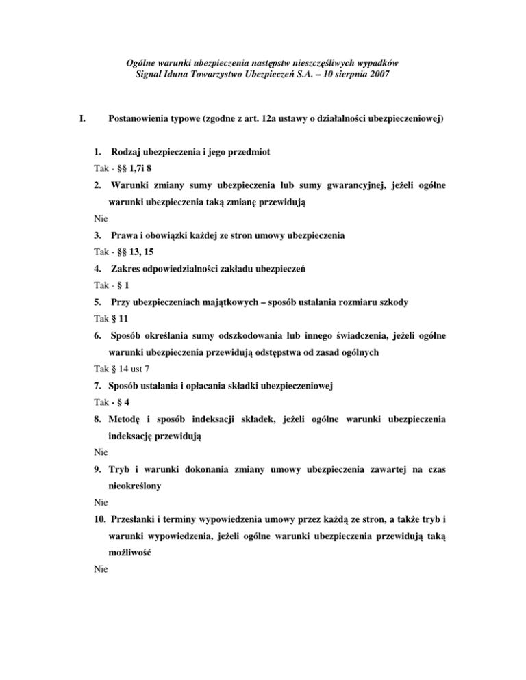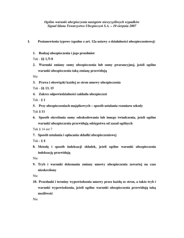 Ogólne warunki ubezpieczenia następstw nieszczęśliwych wypadków Signal Iduna Towarzystwo Ubezpieczeń S.A. – 10 sierpnia 2007 I. Postanowienia typowe (zgodne z art. 12a ustawy o działalności ubezpieczeniowej) 1. Rodzaj ubezpieczenia i jego przedmiot Tak - §§ 1,7i 8 2. Warunki zmiany sumy ubezpieczenia lub sumy gwarancyjnej, jeżeli ogólne warunki ubezpieczenia taką zmianę przewidują Nie 3. Prawa i obowiązki każdej ze stron umowy ubezpieczenia Tak - §§ 13, 15 4. Zakres odpowiedzialności zakładu ubezpieczeń Tak - § 1 5. Przy ubezpieczeniach majątkowych – sposób ustalania rozmiaru szkody Tak § 11 6. Sposób określania sumy odszkodowania lub innego świadczenia, jeżeli ogólne warunki ubezpieczenia przewidują odstępstwa od zasad ogólnych Tak § 14 ust 7 7. Sposób ustalania i opłacania składki ubezpieczeniowej Tak - § 4 8. Metodę i sposób indeksacji składek, jeżeli ogólne warunki ubezpieczenia indeksację przewidują Nie 9. Tryb i warunki dokonania zmiany umowy ubezpieczenia zawartej na czas nieokreślony Nie 10. Przesłanki i terminy wypowiedzenia umowy przez każdą ze stron, a także tryb i warunki wypowiedzenia, jeżeli ogólne warunki ubezpieczenia przewidują taką możliwość Nie II. Przedmiot i zakres odpowiedzialności ubezpieczyciela 1. Na podstawie niniejszych OWU, Signal Iduna Towarzystwo Ubezpieczeń S.A. zawiera umowy ubezpieczenia w zakresie następstw nieszczęśliwych wypadków z osobami fizycznymi mającymi miejsce zamieszkania na terytorium Rzeczpospolitej Polskiej w czasie ich podroży na terenie Rzeczpospolitej Polskiej. Ubezpieczenie może być zawarte w wariancie NWI lub NWI i NWS. 2. Ubezpieczenie w wariancie NWI obejmuje świadczenie na wypadek trwałego uszczerbku na zdrowiu, 3. Ubezpieczenie w wariancie NWI i NWS obejmuje świadczenie na wypadek trwałego uszczerbku na zdrowiu i na wypadek śmierci.(§1 ust 1 i 2 owu) 4. Umowa ubezpieczenia następstw nieszczęśliwych wypadków obejmuje następujące świadczenia: 1) na wypadek trwałego uszczerbku na zdrowiu, 2) na wypadek śmierci 5. Ochroną ubezpieczeniową objęte są wypadki, wydarzyły w czasie trwania umowy ubezpieczenia. 6. Zakres ochrony ubezpieczeniowej obejmuje nieszczęśliwe wypadki na terenie Rzeczpospolitej Polskiej. (§ 7 ust. 1 i 2 owu) 7. Przedmiotem Ubezpieczenia mogą być, po opłaceniu dodatkowej składki następstwa nieszczęśliwych wypadków związane z dodatkowo występującym ryzykiem wynikającym z : 1) uprawiania jazdy konnej, myślistwa, nurkowania, z aparatem tlenowym (kod HR) 2) wyczynowego uprawiania sportu lub brania udziału w zawodach wyścigach, występach i treningach sportowych (kod SP) 3) uprawiania sportów motorowych, powietrznych, wspinaczki wysokogórskiej, speleologii (kod SM) (§8 owu) III. Wyłączenia bądź ograniczania odpowiedzialności ubezpieczyciela Zgodnie z § 10 owu, ochroną ubezpieczeniową nie są objęte wypadki powstałe w przypadku: 1) zaburzenia świadomości oraz umysłu również w przypadku gdy powstały one np. w stanie po spożyciu alkoholu, narkotyków lub innych środków odurzających, ataków apoplektycznych padaczkowych lub innych ataków skurczowych obejmujących cale ciało ubezpieczonego. Ochrona ubezpieczeniowa istnieje jeżeli zaburzenia te lub ataki są wynikiem nie-szczęśliwego wypadku objętego umową ubezpieczenia. 2) popełnienia lub usiłowania popełnienia przez ubezpieczonego przestępstwa lub samobójstwa, 3) prowadzenia przez ubezpieczonego pojazdu lub innych środków lokomocyjnych bez wymaganych uprawnień, 4) zaburzeń psychicznych, depresji, chorób przewlekłych, wad wrodzonych, 5) działań wojennych, stanu wojennego, stanu wyjątko-wego, aktów terroryzmu, aktów sabotażu, oraz udziału ubezpieczonego w zamieszkach, rozruchach, strajkach akcjach protestacyjnych, blokadach dróg bójkach, 6) niewłaściwego leczenia albo niewłaściwie wykonanych zabiegów na ciele. Ochrona ubezpieczeniowa istnieje jeżeli leczenie, w tym również diagnoza oraz zabiegi były następstwem wypadku objętego umową ubezpieczenia 7) infekcji, ochrona ubezpieczeniowa istnieje jeżeli w wyniku ran odniesionych w wypadku ubezpieczony został zakażony wirusem i/lub bakterią chorobotwórczą. Do ran odniesionych w wypadku nie zalicza się nieznacznych otarć naskórka oraz błony śluzowej. Następstwa zakażeń wirusowych i/lub bakteryjnych powstałe w wyniku otarć w czasie wypadku lub w późniejszym okresie nie są objęte ochroną. Ograniczeniu temu nie podlegają wścieklizna i tężec. 8) Zatrucia przewodu pokarmowego w wyniku spożycia płynnych lub stałych substancji, 9) Przepuklin brzusznych lub przepuklin pachwinowych, ochrona ubezpieczeniowa istnieje jeżeli przepuklina brzuszna lub pachwinowa powstała w następstwie wypadku, 10) Uszkodzenia dysków międzykręgowych, krwawienia z organów wewnętrznych, przy czym ochrona ubezpieczeniowa istnieje, jeżeli przyczyną powstania ww uszkodzę był nieszczęśliwy wypadek zdefiniowany w § 2 ust. 5 owu Wylewów krwi do mózgu, zawało, udarów. IV. Warto zwrócić uwagę 1. W § 13 ust. 1 pkt.1 owu zawiera nieprecyzyjne postanowienie dotyczące terminu zgłoszenia szkody, które w praktyce może powodować trudności interpretacyjne: "Ubezpieczony zobowiązany jest: po wypadku, który może doprowadzić do wypłaty świadczenia do natychmiastowego wezwania lekarza oraz powiadomienia SIGNAL IDUNA S.A.". Brak precyzyjnego określenia terminu do zgłoszenia wypadu ubezpieczeniowego może w konsekwencji spowodować zmniejszenie świadczenia. 2. Treść § 13 ust. 2 owu zawiera postanowienie: "Jeżeli w wyniku wypadku nastąpił zgon, ten fakt należy zgłosić SIGNAL IDUNA S.A. w ciągu 48 godzin, również jeżeli wypadek został już zgłoszony. Zgłoszenie powinno nastąpić w formie pisemnej". 3. W § 14 ust. 8 owu stanowi, że " jeżeli ubezpieczony z winy umyślnej lub rażącego niedbalstwa nie dopełnił któregokolwiek z obowiązków,
