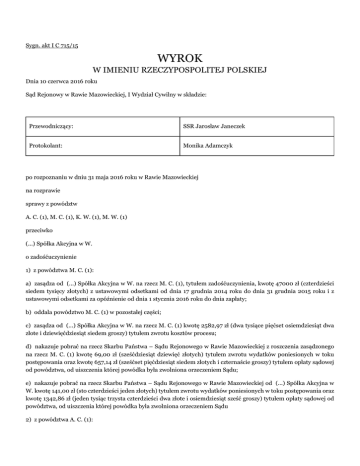 Sygn. akt I C 715/15 WYROK W IMIENIU RZECZYPOSPOLITEJ POLSKIEJ Dnia 10 czerwca 2016 roku Sąd Rejonowy w Rawie Mazowieckiej, I Wydział Cywilny w składzie: Przewodniczący: SSR Jarosław Janeczek Protokolant: Monika Adamczyk po rozpoznaniu w dniu 31 maja 2016 roku w Rawie Mazowieckiej na rozprawie sprawy z powództw A. C. (1), M. C. (1), K. W. (1), M. W. (1) przeciwko (...) Spółka Akcyjna w W. o zadośćuczynienie 1) z powództwa M. C. (1): a) zasądza od (...) Spółka Akcyjna w W. na rzecz M. C. (1), tytułem zadośćuczynienia, kwotę 47000 zł (czterdzieści siedem tysięcy złotych) z ustawowymi odsetkami od dnia 17 grudnia 2014 roku do dnia 31 grudnia 2015 roku i z ustawowymi odsetkami za opóźnienie od dnia 1 stycznia 2016 roku do dnia zapłaty; b) oddala powództwo M. C. (1) w pozostałej części; c) zasądza od (...) Spółka Akcyjna w W. na rzecz M. C. (1) kwotę 2582,97 zł (dwa tysiące pięćset osiemdziesiąt dwa złote i dziewięćdziesiąt siedem groszy) tytułem zwrotu kosztów procesu; d) nakazuje pobrać na rzecz Skarbu Państwa – Sądu Rejonowego w Rawie Mazowieckiej z roszczenia zasądzonego na rzecz M. C. (1) kwotę 69,00 zł (sześćdziesiąt dziewięć złotych) tytułem zwrotu wydatków poniesionych w toku postępowania oraz kwotę 657,14 zł (sześćset pięćdziesiąt siedem złotych i czternaście groszy) tytułem opłaty sądowej od powództwa, od uiszczenia której powódka była zwolniona orzeczeniem Sądu; e) nakazuje pobrać na rzecz Skarbu Państwa – Sądu Rejonowego w Rawie Mazowieckiej od (...) Spółka Akcyjna w W. kwotę 141,00 zł (sto czterdzieści jeden złotych) tytułem zwrotu wydatków poniesionych w toku postępowania oraz kwotę 1342,86 zł (jeden tysiąc trzysta czterdzieści dwa złote i osiemdziesiąt sześć groszy) tytułem opłaty sądowej od powództwa, od uiszczenia której powódka była zwolniona orzeczeniem Sądu 2) z powództwa A. C. (1): a) zasądza od (...) Spółka Akcyjna w W. na rzecz A. C. (1), tytułem zadośćuczynienia, kwotę 12000,00 zł (dwanaście tysięcy złotych) z ustawowymi odsetkami od dnia 10 czerwca 2015 roku do dnia 31 grudnia 2015 roku i z ustawowymi odsetkami za opóźnienie od dnia 1 stycznia 2016 roku do dnia zapłaty; b) oddala powództwo A. C. (1) w pozostałej części; c) zasądza od (...) Spółka Akcyjna w W. na rzecz A. C. (1) kwotę 903,40 zł (dziewięćset trzy złote i czterdzieści groszy) tytułem zwrotu kosztów procesu; d) nakazuje pobrać na rzecz Skarbu Państwa – Sądu Rejonowego w Rawie Mazowieckiej z roszczenia zasądzonego na rzecz A. C. (1) kwotę 84,00 zł (osiemdziesiąt cztery złote) tytułem zwrotu wydatków poniesionych w toku postępowania oraz kwotę 120 zł (sto dwadzieścia złotych) tytułem opłaty sądowej od powództwa, od uiszczenia której powódka była zwolniona orzeczeniem Sądu; e) nakazuje pobrać na rzecz Skarbu Państwa – Sądu Rejonowego w Rawie Mazowieckiej od (...) Spółka Akcyjna w W. kwotę 126,00 zł (sto dwadzieścia sześć złotych) tytułem zwrotu wydatków poniesionych w toku postępowania oraz kwotę 180 zł (sto osiemdziesiąt złotych) tytułem opłaty sądowej od powództwa, od uiszczenia której powódka była zwolniona orzeczeniem Sądu 3) z powództwa K. W. (1): a) zasądza od (...) Spółka Akcyjna w W. na rzecz K. W. (1), tytułem zadośćuczynienia, kwotę 10000,00 zł (dziesięć tysięcy złotych) z ustawowymi odsetkami od dnia 12 lutego 2015 roku do dnia 31 grudnia 2015 roku i z ustawowymi odsetkami za opóźnienie od dnia 1 stycznia 2016 roku do dnia zapłaty; b) oddala powództwo K. W. (1) w pozostałej części; c) zasądza od (...) Spółka Akcyjna w W. na rzecz K. W. (1) kwotę 1305,67 zł (jeden tysiąc trzysta pięć złotych i sześćdziesiąt siedem groszy) tytułem zwrotu kosztów procesu; d) nakazuje pobrać na rzecz Skarbu Państwa – Sądu Rejonowego w Rawie Mazowieckiej z roszczenia zasądzonego na rzecz K. W. (1) kwotę 70,00 zł (siedemdziesiąt złotych) tytułem zwrotu wydatków poniesionych w toku postępowania; e) nakazuje pobrać na rzecz Skarbu Państwa – Sądu Rejonowego w Rawie Mazowieckiej od (...) Spółka Akcyjna w W. kwotę 140,00 zł (sto czterdzieści złotych) tytułem zwrotu wydatków poniesionych w toku postępowania; 4) z powództwa M. W. (1): a) zasądza od (...) Spółka Akcyjna w W. na rzecz M. W. (1), tytułem zadośćuczynienia, kwotę 10000,00 zł (dziesięć tysięcy złotych) z ustawowymi odsetkami od dnia 12 lutego 2015 roku do dnia 31 grudnia 2015 roku i z ustawowymi odsetkami za opóźnienie od dnia 1 stycznia 2016 roku do dnia zapłaty; b) oddala powództwo M. W. (1) w pozostałej części; c) zasądza od (...) Spółka Akcyjna w W. na rzecz M. W. (1) kwotę 1305,67 zł (jeden tysiąc trzysta pięć złotych i sześćdziesiąt siedem groszy) tytułem zwrotu kosztów procesu; d) nakazuje pobrać na rzecz Skarbu Państwa – Sądu Rejonowego w Rawie Mazowieckiej z roszczenia zasądzonego na rzecz M. W. (1) kwotę 70,00 zł (siedemdziesiąt złotych) tytułem zwrotu wydatków poniesionych w toku postępowania; e) nakazuje pobrać na rzecz Skarbu Państwa – Sądu Rejonowego w Rawie Mazowieckiej od (...) Spółka Akcyjna w W. kwotę 140,00 zł (sto czterdzieści złotych) tytułem zwrotu wydatków poniesionych w toku postępowania. SSR Jarosław Janeczek Sygn. Akt I C 715/15 UZASADNIENIE W pozwie, który wpłynął do tutejszego Sądu Rejonowego w dniu 29 kwietnia 2015 roku, a skierowanym przeciwko (...) Spółka Akcyjna w W. powódka M. C. (1) domagała się zasądzenia na jej rzecz kwoty 70000 zł wraz z ustawowymi odsetkami od dnia 17 grudnia 2014 roku do dnia zapłaty oraz kosztami postępowania. W uzasadnieniu pozwu wskazano, iż kwota w nim dochodzona wynika z tytułu zadośćuczynienia przewidzianego w art. 448 k.c. w zw. z art. 24 § 1 k.c. za naruszenie dobra osobistego w postaci utraty więzi rodzinnej, duchowej i emocjonalnej z ojcem S. W., który zginął w wypadku k