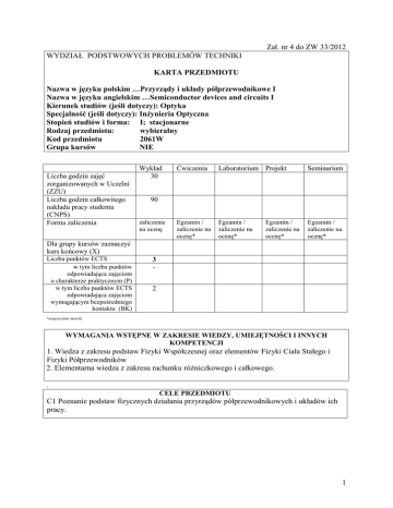 Zał. nr 4 do ZW 33/2012 WYDZIAŁ PODSTWOWYCH PROBLEMÓW TECHNIKI KARTA PRZEDMIOTU Nazwa w języku polskim …Przyrządy i układy półprzewodnikowe I Nazwa w języku angielskim …Semiconductor devices and circuits I Kierunek studiów (jeśli dotyczy): Optyka Specjalność (jeśli dotyczy): Inżynieria Optyczna Stopień studiów i forma: I; stacjonarne Rodzaj przedmiotu: wybieralny Kod przedmiotu 2061W Grupa kursów NIE Liczba godzin zajęć zorganizowanych w Uczelni (ZZU) Liczba godzin całkowitego nakładu pracy studenta (CNPS) Forma zaliczenia Wykład 30 Ćwiczenia Laboratorium Projekt Seminarium Egzamin / zaliczenie na ocenę* Egzamin / zaliczenie na ocenę* Egzamin / zaliczenie na ocenę* 90 zaliczenie na ocenę Egzamin / zaliczenie na ocenę* Dla grupy kursów zaznaczyć kurs końcowy (X) Liczba punktów ECTS w tym liczba punktów odpowiadająca zajęciom o charakterze praktycznym (P) w tym liczba punktów ECTS odpowiadająca zajęciom wymagającym bezpośredniego kontaktu (BK) 3 2 *niepotrzebne skreślić WYMAGANIA WSTĘPNE W ZAKRESIE WIEDZY, UMIEJĘTNOŚCI I INNYCH KOMPETENCJI 1. Wiedza z zakresu podstaw Fizyki Współczesnej oraz elementów Fizyki Ciała Stałego i Fizyki Półprzewodników 2. Elementarna wiedza z zakresu rachunku różniczkowego i całkowego. \ CELE PRZEDMIOTU C1 Poznanie podstaw fizycznych działania przyrządów półprzewodnikowych i układów ich pracy. 1 PRZEDMIOTOWE EFEKTY KSZTAŁCENIA Z zakresu wiedzy: PEK_W01 zna podstawy fizyczne działania wybranych przyrządów półprzewodnikowych PEK_W02 zna podstawowe układy pracy wybranych przyrządów półprzewodnikowych Z zakresu umiejętności: PEK_U01 potrafi korzystać z literatury naukowej, w tym docierać do materiałów źródłowych oraz dokonywać ich przeglądu Z zakresu kompetencji społecznych: PEK_K01 rozumie potrzebę ciągłego dokształcania, w tym samodokształcania; umie i rozumie potrzebę uczenia się samodzielnie i w grupie TREŚCI PROGRAMOWE Wy1, Wy2 Wy3 Wy4 Wy5 Wy6 Wy7 Wy8 Wy9 Wy10 Wy11 Wy12 Wy13 Wy14 Wy15 Forma zajęć - wykład Współczesna technologia półprzewodników i urządzeń półprzewodnikowych. Wzrost kryształów litych i warstw epitaksjalnych. Rodzaje półprzewodników i ich właściwości. Koncentracja równowagowa elektronów i dziur w półprzewodnikach samoistnych i domieszkowanych Nośniki nadmiarowe w półprzewodnikach: ekscytacja optyczna i elektryczna Dyfuzja i dryft nośników. Relacja Einsteina. Równanie ciągłości. Kwazi-poziomy Fermiego. Złącze p-n w stanie równowagi termodynamicznej. Ładunek przestrzenny w złączu p-n. Równanie Poissona i jego rozwiązanie. Pole elektryczne w złączu. Obszar zubożony i potencjał wbudowany. Charakterystyka prądowo-napięciowa złącza p-n. Równanie Schockley’a. Model małosygnałowy diody p-n. Dioda w układach prostowniczych. Pojemność złącza p-n. Waraktory. Transport prądu przez rzeczywiste złącze p-n. Efekt Zenera, jonizacja zderzeniowa. Dioda Zenera i dioda lawinowa. Układy pracy. Złącze metal-półprzewodnik: prostujące i omowe. Charakterystyka I-V diody Schottky’ego. Zastosowania. Test zaliczeniowy Suma godzin Liczba godzin 4 2 2 2 2 2 2 2 2 2 2 2 2 2 30 2 STOSOWANE NARZĘDZIA DYDAKTYCZNE N1 Wykład tradycyjny z prezentacjami multimedialnymi uzupełniony demonstracjami zjawisk fizycznych. N2 E-materiały do wykładu umieszczone w Internecie. N3 Konsultacje i kontakt pocztą elektroniczną. N4 Praca własna – przygotowanie do laboratorium i do testu zaliczeniowego OCENA OSIĄGNIĘCIA PRZEDMIOTOWYCH EFEKTÓW KSZTAŁCENIA Oceny (F – formująca (w trakcie semestru), P – podsumowująca (na koniec semestru) F1 F2 Numer efektu kształcenia Sposób oceny osiągnięcia efektu kształcenia PEK_W01,PEK_W02, Testy i aktywność na wykładzie PEK_U01, PEK_K01 PEK_W01,PEK_W02, Test zaliczeniowy PEK_U01, PEK_K01 P=F2 z uwzględnieniem F1 LITERATURA PODSTAWOWA I UZUPEŁNIAJĄCA LITERATURA PODSTAWOWA: [1] Materiały do wykładu, dostępne poprzez internet : www.if.pwr.wroc.pl\~popko [2] E.Płaczek-Popko, „Fizyka odnawialnych źródeł energii” Skrypt DBC [3] W.Marciniak “Przyrządy półprzewodnikowe i układy scalone” WNT Warszawa 1987 [4] S.Kuta „Elementy i układy elektroniczne” Wyd. AGH, wyd. I 2000 LITERATURA UZUPEŁNIAJĄCA: [1] S.M.Sze „ Physics of Semiconductor Devices” J.Wiley and Sons, NY 1981, dostępna wersja elektroniczna, e-książki, BG P.Wr. [2] M.Rusek, J.Pasierbiński “Elementy i układy elektroniczne w pytaniach i odpowiedziach” WNT Warszawa 1990 OPIEKUN PRZEDMIOTU (IMIĘ, NAZWISKO, ADRES E-MAIL) Ewa Popko [email protected] 3 MACIERZ POWIĄZANIA EFEKTÓW KSZTAŁCENIA DLA PRZEDMIOTU Przyrządy i układy półprzewodnikowe I Z EFEKTAMI KSZTAŁCENIA NA KIERUNKU Optyka I SPECJALNOŚCI Inżynieria Optyczna Przedmiotowy efekt kształcenia Odniesienie przedmiotowego efektu do efektów kształcenia zdefiniowanych dla kierunku studiów i specjalności (o ile dotyczy)** Cele przedmiotu*** Treści programowe*** Numer narzędzia dydaktycznego*** PEK_W01 (wiedza) PEK_W02 PEK_U01 (umiejętności) PEK_K01 K1OPT_W06 C1 Wy1-Wy14 1-4 K1OPT_W06 K1OPT_U01 C1 C1 Wy1-Wy14 Wy1-Wy14 1-4 1-4 K1OPT_K01 C1 Wy1-Wy14 1-4 (kompetencje) ** - wpisać symbole kierunkowych/specjalnościowych efektów kształcenia *** - z tabeli powyżej