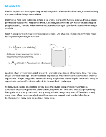 Jak działa BIA? Analiza impedancji (BIA) opiera się na wykorzystaniu wiedzy o ludzkim ciele, które składa się z przewodników i nieprzewodników. Ogólnie 50-70% ciała ludzkiego składa się z wody, która pełni funkcję przewodnika, podczas gdy tkanka tłuszczowa- nieprzewodnika. Cała klasyczna metoda BIA mierzy impedancję na przypuszczeniu, że ciało ludzkie może byd potraktowane jak cylinder dla zastosowania tego modelu. Jeżeli A jest powierzchnią przekroju poprzecznego, L to długośd, impedancja cylindra może byd wyrażona poniższym wzorem: Zgodnie z tym wyrażeniem, jeżeli znamy L i wartośd impedancji, otrzymamy ilośd. Tak więc, znając wzrost badanego i znamy wartośd impedancji, możemy otrzymad zawartośd wody w organizmie. W tym przypadku zawartośd wody w cylindrze odnosi się do zawartości wody w organizmie, a długośd cylindra odnosi się do wysokości badanego. Podstawową zasadą analizatora składu ciała InBodyJ10 jest poniższe stwierdzenie. Zawartośd wody w organizmie, elektrolitów, najpierw jest mierzona wartością impedancji. Następnie za pomocą zawartości wody w organizmie otrzymamy wartośd beztłuszczowej masy ciała. Masa tłuszczowa jest określona poprzez bezpośredni pomiar lub odjęcie beztłuszczowej masy ciała do podanej masy ciała. Rdzeń technologii InBodyJ10, jeden z najbardziej nowoczesnych analizatorów składu ciała, dostarcza bezbłędne i odtwarzalne dane, a także zróżnicowaną analizę składu ciała. 1) 8-punktowy-tetrapolar elektrod dotykowych Pomiary są brane zawsze z tych samych punktów kooczyn górnych i dolnych, gdy prąd i napięcie elektryczne osobno napływają do ciała, co gwarantuje wysoką odtwarzalnośd i precyzyjnośd pomiarów. 2) Nieempiryczne obliczenia Dokładny segmentalny pomiar tułowia sprawia, że żadne obliczenia nie są potrzebne. Płed czy wiek nie wpływają na ocenę rezultatu pomiaru. Odkąd stosuje się nieempiryczne obliczenia, nawet najmniejsze zmiany w składzie ciała mogą zostad wykryte.