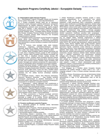 EU-REG-CEG-18042013 Regulamin Programu Certyfikaty Jakości – Europejskie Gwiazdy § 1. Rozporządzenia ogólne dotyczące Programu. Art. 1. Administratorem Programu Europejskie Gwiazdy jest Europejskie Centrum Jakości i Promocji Sp. z o.o., zwane dalej Administratorem. Art. 2. Program Europejskie Gwiazdy oparty jest na najnowszych dyrektywach unijnych dotyczących systemów jakościowych, wymaganiach kategoryzacyjnych dla obiektów hotelarskich, przepisach dot. ochrony przeciwpożarowej, przepisach prawa żywnościowego, ogólnie przyjętych zasad SPA & Wellness, a także dotyczących działalności leczniczorehabilitacyjnej sanatoriów i uzdrowisk. W ramach Programu Administrator przyznaje Certyfikaty Jakości – Europejską Srebrną Gwiazdę, Europejską Złotą Gwiazdę, Europejską Platynową Gwiazdę, Europejską Diamentową Gwiazdę, Europejską Gwiazdę Obiekt Historyczny oraz Europejską Gwiazdę Sanatorium Uzdrowisko. Art. 3. Europejskie Gwiazdy przyznawane są przez Prezydium Europejskiej Kapituły Jakości Usług Hotelarskich i Turystycznych na podstawie przeprowadzonej przez siebie weryfikacji oraz dokumentacji zgromadzonej przez Administratora w procesie weryfikacji na zasadach ściśle określonych w Regulaminie. Art. 4. Do Konkursu może przystąpić każdy obiekt hotelarski, konferencyjno– szkoleniowy, uzdrowiskowo-rekreacyjny, sanatoria, uzdrowiska, obiekty SPA & Wellness, obiekty historyczne, muzea, centra kultury i sztuki, młyny, obiekty zabytkowe, dwory, zamki oraz pałace. Art. 5. Certyfikat Jakości Europejska Srebrna Gwiazda przyznawany jest dla hoteli, które w klasyfikacji końcowej uzyskały do 50% wymaganych punktów. Certyfikat Jakości Europejska Złota Gwiazda przyznawany jest dla hoteli, które w klasyfikacji końcowej uzyskały powyżej 50% wymaganych punktów. Certyfikat Jakości Europejska Platynowa Gwiazda przyznawany jest za podnoszenie najwyższej jakości oferowanych usług dla hoteli, które wcześniej uzyskały Certyfikat Jakości Europejska Złota Gwiazda. Wymagane jest uzyskanie przynajmniej 20% więcej punktów w stosunku do poprzedniego raportu opiniującego do przyznania Certyfikatu. Europejska Diamentowa Gwiazda– Certyfikat Jakości SPA & Wellness – przyznawana jest dla Wnioskodawców spełniających wymogi branży SPA & Wellness. Europejską Gwiazdę obiekt Historyczny mogą uzyskać obiekty historyczne, zamki, pałace dwory, muzea oraz młyny. Certyfikat Jakości Europejska Gwiazda Sanatorium Uzdrowisko mogą otrzymać sanatoria i uzdrowiska oraz inne zakłady lecznicze prowadzące działalność uzdrowiskową. Art. 6. Europejskie Gwiazdy – Srebrna, Złota, Platynowa, Diamentowa, Historyczna, Sanatorium Uzdrowisko – mają charakter wyróżnień promocyjnych przyznawanych na zasadach komercyjnych w celu podnoszenia jakości usług hotelarskich oraz uzdrowiskowo-sanatoryjnych i utrzymywania ich na najwyższym, europejskim poziomie. Art. 7. Wnioskodawca – podmiot zgłaszający chęć uczestniczenia w Programie Europejskie Gwiazdy. Wnioskodawca po pozytywnym przejściu procedur weryfikacyjnych otrzymuje tytuł Laureata. Art. 8. Regulamin – Regulamin Programu Europejskie Gwiazdy. Art. 9. Administratorowi przysługują prawa ochronne na znaki towarowe o których mowa w Regulaminie. Administrator Programu jest właścicielem marki Europejskie Centrum Jakości i Promocji Regionalnej. Art. 10. Prawo uczestniczenia w Programie przysługuje podmiotom prowadzącym działalność gospodarczą w oparciu o przepisy prawa właściwego ze względu na ich siedzibę. Wniosek zgłoszeniowy do Programu traktowany jest jako umowa między stronami – firmą zgłaszającą się do Programu jako Wnioskodawcą a Administratorem. 7. Ankieta Weryfikacyjna uwzględnia standardy przyjęte w branży, wymagania „kategoryzacyjne” co do wyposażenia, oraz zakresu świadczonych usług, w tym usług gastronomicznych w obiektach hotelarskich, a także świadczonych usług w uzdrowiskach i sanatoriach. Podczas audytu weryfikowane są następujące zagadnienia: standard według kategorii obiektu, otoczenie i lokalizacja, wyjątkowy charakter obiektu, oferta SPA & Wellness, zdrowa kuchnia oparta o świeże i lokalne produkty, wysoki komfort pobytu, ochrona niepalących przed palaczami, palety świadczonych usług, jakość świadczonych usług, estetyka i harmonia sprzyjająca wyciszeniu i relaksowi, spójność i konsekwencja koncepcji SPA & Wellness, standard wyposażenia, kwalifikacje zawodowe kadry zarządzającej i wybranej grupy pracowników, kompetencje techniczne, dodatkowe elementy w wyposażeniu i dodatkowe usługi świadczone przez obiekt nie wymagane przy ww. kategorii obiektu, możliwość zorganizowania w obiekcie konferencji/szkoleń, wyposażenie sal konferencyjnych i ich nowoczesność, przystosowanie obiektu dla osób niepełnosprawnych, wdrożone certyfikaty, system HACCP, ISO, standard usług rekreacyjnych, zaplecze sportowe (kort tenisowy, boisko, siłownia, kręgielnia, bilard, wyciąg narciarski), zaplecze rekreacyjne (basen, jacuzzi, sauna, solarium, sala fitness i inne), sukcesy w gastronomii (nagrody, wyróżnienia), analiza reklamacji na wykonywane usługi (liczba, przyczyny i forma rozpatrzenia), rekomendacje, wyposażenie gabinetów, dobór sprzętu, dobór oraz standard wykonywanych zabiegów, dobór personelu, standard usług rekreacyjnych, aranżacja wnętrz, atmosfera, powierzchnia, akustyka, historyczny charakter obiektu. Natomiast podczas audytu w obiektach sanatoryjnych oraz uzdrowiskowych weryfikacji podlegają cechy klimatyczne, uzdrowiskowe leczenie dzieci i dorosłych, rehabilitacja, odnowa biologiczna, programy rekreacyjno-wypoczynkowe, dobór zabiegów np. z użyciem borowiny, leczenie wodne, uzdrowiskowe leczenie różnego rodzaju chorób, schorzeń. Weryfikacji podlega również część związana z wodami o różnych właściwościach oraz wszelkie zagadnienia związane z funkcjonowaniem oraz posiadaną charakt