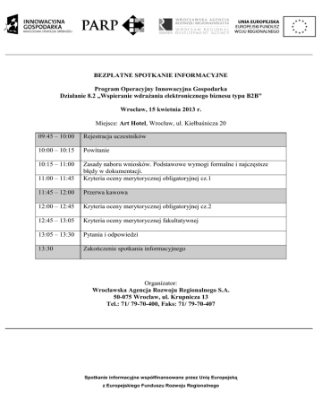 BEZPŁATNE SPOTKANIE INFORMACYJNE Program Operacyjny Innowacyjna Gospodarka Działanie 8.2 „Wspieranie wdrażania elektronicznego biznesu typu B2B” Wrocław, 15 kwietnia 2013 r. Miejsce: Art Hotel, Wrocław, ul. Kiełbaśnicza 20 09:45 – 10:00 Rejestracja uczestników 10:00 – 10:15 Powitanie 10:15 – 11:00 11:00 – 11:45 Zasady naboru wniosków. Podstawowe wymogi formalne i najczęstsze błędy w dokumentacji. Kryteria oceny merytorycznej obligatoryjnej cz.1 11:45 – 12:00 Przerwa kawowa 12:00 – 12:45 Kryteria oceny merytorycznej obligatoryjnej cz.2 12:45 – 13:05 Kryteria oceny merytorycznej fakultatywnej 13:05 – 13:30 Pytania i odpowiedzi 13:30 Zakończenie spotkania informacyjnego Organizator: Wrocławska Agencja Rozwoju Regionalnego S.A. 50-075 Wrocław, ul. Krupnicza 13 Tel.: 71/ 79-70-400, Faks: 71/ 79-70-407 Spotkanie informacyjne współfinansowane przez Unię Europejską z Europejskiego Funduszu Rozwoju Regionalnego