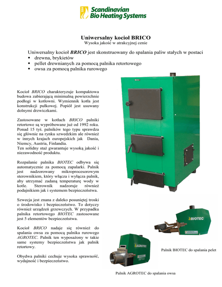 Uniwersalny kocioł BRICO Wysoka jakość w atrakcyjnej cenie Uniwersalny kocioł BRICO jest skonstruowany do spalania paliw stałych w postaci drewna, brykietów pellet drewnianych za pomocą palnika retortowego owsa za pomocą palnika rurowego Kocioł BRICO charakteryzuje kompaktowa budowa zabierającą minimalną powierzchnie podłogi w kotłowni. Wymiennik kotła jest konstrukcji pułkowej. Popiół jest usuwany dolnymi drzwiczkami. Zastosowane w kotłach BRICO palniki retortowe są wypróbowane juŜ od 1992 roku. Ponad 15 tyś. palników tego typu sprawdza się głównie na rynku szwedzkim ale równieŜ w innych krajach europejskich jak Dania, Niemcy, Austria, Finlandia. Ten solidny staŜ gwarantuje wysoką jakość i niezawodność produktu. Rozpalanie palnika BIOTEC odbywa się automatycznie za pomocą zapalarki. Palnik jest nadzorowany mikroprocesorowym sterownikiem, który włącza i wyłącza palnik, aby utrzymać zadaną temperaturę wody w kotle. Sterownik nadzoruje równieŜ podajnikiem jak i systemem bezpieczeństwa. Szwecja jest znana z daleko posuniętej troski o środowisko i bezpieczeństwo. To dotyczy równieŜ urządzeń grzewczych. W przypadku palnika retortowego BIOTEC zastosowane jest 5 elementów bezpieczeństwa. Kocioł BRICO nadaje się równieŜ do spalania owsa za pomocą palnika rurowego AGROTEC. Palnik ten wyposaŜony w takie same systemy bezpieczeństwa jak palnik retortowy. Palnik BIOTEC do spalania pelet Obydwa palniki cechuje wysoka sprawność, wydajność i bezpieczeństwo. Palnik AGROTEC do spalania owsa BRICO 20/40 Przekrój kotła 10 1 9 8 2 3 4 11 7 5 6 1 - Wylot spalin (czopuch) 2 - Grodzie poziome i pionowe* 3 - Komora paleniskowa 4 - Komora popielnikowa 5 - Płaszcz wodny kotła 6 - Drzwi popielnika 7 - Ruszt Ŝeliwny (wymienny) 8 - Drzwi zasypowe 9 - Wyczystka 10 - Izolacja termiczna 11 - Ramka palnika * - Ilość wkładów pionowych uzaleŜniona od mocy kotła: 20 kW - 3 szt.,40 kW - 5 szt. Parametr Wysokość kotła (bez króćców) Szerokość kotła (bez króćców) Głębokość kotła (bez króćców) Wylot spalin Drzwiczki wyczystki Drzwiczki zasypowe Drzwiczki paleniskowe Masa kotła (bez wody) Jednostka mm mm mm mm mm mm mm kg Moc kotła [kW] 20 1265 460 650 130x170 270 x 250 190 x 250 140 x 250 175 40 1360 620 790 150x200 330 x 310 210 x 310 140 x 310 305 Dealer Scanbio sp. z o.o. , Ul. Miejska 10A, 01352 Warszawa, tel.: 022 6660959, 022 6647960 fax.: 022 6647960 www.sbh-systems.com, e-mail [email protected]