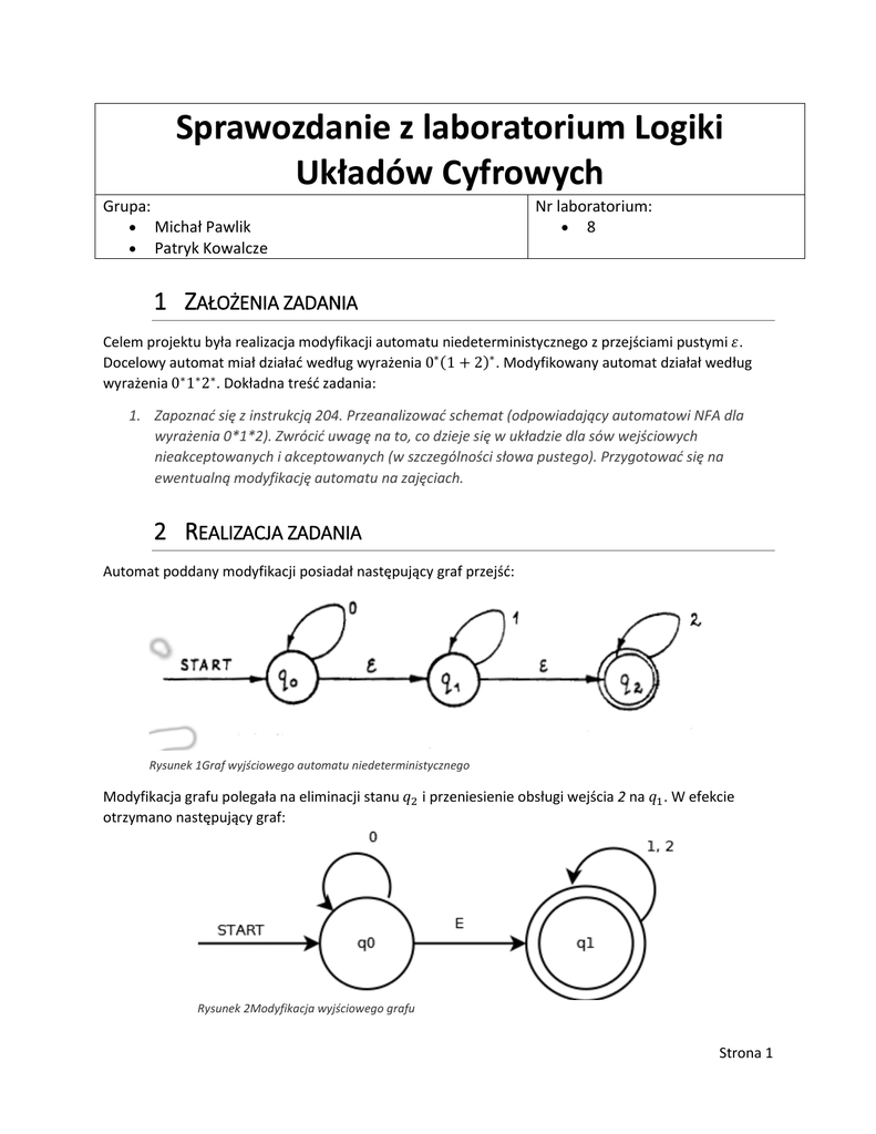 Sprawozdanie z laboratorium Logiki Układów Cyfrowych Grupa: Michał Pawlik Patryk Kowalcze Nr laboratorium: 8 1 ZAŁOŻENIA ZADANIA Celem projektu była realizacja modyfikacji automatu niedeterministycznego z przejściami pustymi 𝜀. Docelowy automat miał działać według wyrażenia 0∗ (1 + 2)∗ . Modyfikowany automat działał według wyrażenia 0∗ 1∗ 2∗. Dokładna treść zadania: 1. Zapoznać się z instrukcją 204. Przeanalizować schemat (odpowiadający automatowi NFA dla wyrażenia 0*1*2). Zwrócić uwagę na to, co dzieje się w układzie dla sów wejściowych nieakceptowanych i akceptowanych (w szczególności słowa pustego). Przygotować się na ewentualną modyfikację automatu na zajęciach. 2 REALIZACJA ZADANIA Automat poddany modyfikacji posiadał następujący graf przejść: Rysunek 1Graf wyjściowego automatu niedeterministycznego Modyfikacja grafu polegała na eliminacji stanu 𝑞2 i przeniesienie obsługi wejścia 2 na 𝑞1 . W efekcie otrzymano następujący graf: Rysunek 2Modyfikacja wyjściowego grafu Strona 1 W dalszej kolejności należało zmodyfikować schemat ideowy przedstawiony w załączonym do zadania dokumencie. Schemat automatu wyjściowego przedstawia się następująco: Strona 2 Modyfikacja polegała na eliminacji obsługi stanu 𝑞2 , którą obejmował obszar wyróżniony na schemacie. Ponadto należało zauważyć, że sygnały tak „1” jak i „2” pełnią tę samą rolę, więc ujęto je w zanegowaną bramkę NOR. Schemat końcowy przedstawia się następująco: Strona 3 3 PODSUMOWANIE I WNIOSKI Automat wykonany na zajęciach nie zupełnie spełniał założenia zadania. Nie działającą funkcjonalnością było przedstawienie stanu końcowego. Układ reagował na sygnały wejściowe 0, 1, 2 oraz sygnał pusty 𝜀. Wnioskiem z błędu popełnionego podczas zajęć laboratoryjnym jest konkluzja, że należy szukać możliwie najprostszego rozwiązania. Takim rozwiązaniem było zastosowanie zanegowanej bramki NOR dla wejść 1,2, które dokonane zbyt późno nie pozwoliło w pełni wykonać zadania w trakcie zajęć. Strona 4