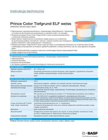 Instrukcja techniczna Prince Color Tiefgrund ELF weiss PREPARAT GRUNTUJĄCY BIAŁY ❚ Pigmentowany, bezrozpuszczalnikowy, niezawierający plastyfikatorów i niskoemisyjny środek do gruntowania do zastosowania w zakresie wnętrz i na zewnątrz. ❚ Preparat gruntujący Prince Color Tiefgrund ELF weiss wzmacnia powierzchnię i wyrównuje chłonność podłoża. ❚ Dzięki dobrym właściwościom przenikania nadaje się przy tym znakomicie do gruntowania podłoży mineralnych i starych, nośnych powłok oraz kredujących powłok malarskich z farb dyspersyjnych i mineralnych. ❚ Preparat gruntujący Tiefgrund ELF weiss może być także z powodzeniem stosowany we wnętrzach jako środek zwiększający przyczepność na trwałych, gładkich podłożach o niskiej chłonności, jak np. płyty gipsowe lub gładki beton. ❚ Zawiera drobnoziartnisty wypełnicz kwarcowy umożliwiający lepsze rozprowadzanie farb. ❚ nadaje wstępne krycie dla podłoża Właściwości produktu ❚ niskoemisyjny produkt bezrozpuszczalnikowy, niezawierający plastyfikatorów ❚ słabozapachowy ❚ wodorozcieńczalny ❚ przyjazny dla środowiska ❚ nie zawiera substancji czynnych powodujących matowienie powierzchni Dane techniczne Gęstość zgodnie DIN 53217 ok. 1,40 g/ cm3 Skład produktu Dyspersja polimerowa na bazie akrylowej, biały pigment, wypełniacze mineralne, woda, dodatki uszlachetniające, środki konserwujące. Kolor biały Dane dotyczące zastosowania Wielkość opakowania 12,5 l Sposób użycia Nanoszenie pędzlem, wałkiem lub metodą natrysku hydrodynamicznego Nanoszenie metodą natrysku Dysza: 0,18 - 0,28 mm (0,072 - 0,112”); ciśnienie natryskiwania: 100 bar hydrodynamicznego rozcieńczenie wodą: ok. 5 - 10% Nie wdychać aerozoli (mgły rozpryskowej). Przestrzegać standardowych przepisów bezpieczeństwa. Temperatura użycia Zużycie (na warstwę) Nie używać przy temperaturze poniżej +5 °C (temperatura powietrza oraz obiektu) ok. 150 - 250 ml/m² na gładkich podłożach o standardowej chłonności Wartość orientacyjna, która nie jest wiążąca, ponieważ każda powierzchnia posiada inne właściwości determinujące ilość zużycia. W celu przeprowadzenia dokładnej kalkulacji należy ustalić ilość zużycia poprzez wykonanie próbnej powłoki na obiekcie. Czasy schnięcia (20 °C/65% wzgl. wilgot. powietrza) możliwość przemalowania po ok. 4 - 5 godzinach. W niższych temperaturach oraz przy wyższej wilgotności powietrza podane czasy ulegają wydłużeniu. Barwienie brak możliwości barwienia Rozcieńczalnik Dostarczany produkt jest gotowy do użycia; w razie potrzeby rozcieńczyć wodą do 20% i dostosować do właściwości chłonności podłoża. Czyszczenie narzędzi Narzędzia oczyścić wodą natychmiast po użyciu Podłoże i struktura powłok: Podłoże musi być mocne, czyste, suche, oczyszczone z tłuszczu, wosku, silikonu i pyłu. Strona 1 z 2 Prince Color Tiefgrund ELF weiss Podłoża: ❚ Tynki mineralne (P II i III), fabryczne zaprawy gipsowe i tynki gipsowe (P IV i P V). ❚ Beton ❚ Powłoki farb dyspersyjnych ❚ Tynki cienkowarstwowe na bazie żywicy syntetycznej ❚ Płyty gipsowe kartonowe ❚ Tynki z fabrycznych zapraw gipsowych (P IV i P V) Przygotowanie podłoża: Informacje na temat przygotowania różnych podłoży nośnych (na zewnątrz i wewnątrz obiektu) przedstawiono w instrukcjach technicznych produktów wybranych do wykonania powłok/powłok malarskich. Gruntowanie: Prince Color Tiefgrund ELF weiss nanosić jednokrotnie lub dwukrotnie w postaci nierozcieńczonej W przypadku konieczności poprawy konsystencji użycia dodać maks. 20% wody. ❚ Należy ochronić przed popryskaniem takie materiały jak glazura, płytki, szkło, szyby, tworzywa sztuczne, kamienie naturalne, metale, ramy okienne itp. ❚ Należy natychmiast zmyć wodą wszystkie miejsca, tj. okapy, boazerie, okna, pasy glazury i ceramiki, które zostałyzabrudzone podczas nakładania powłoki. ❚ Po użyciu narzędzia natychmiast umyć w wodzie. ❚ Produkt stosować tylko zgodnie z podanym zastosowaniem. Kryjąca powłoka malarska: Do wykonania użyć sprawdzonych nawierzchniowych Prince Color Multitop (farby dyspersyjne do wnętrz i na zewnątrz). Przechowywanie i składowanie Okres przechowywania - do 12 miesięcy o daty produkcji. Przechowywać w chłodnym miejscu. Chronić przed mrozem. Napoczęte opakowania należy niezwłocznie zużyć. Chronić przed dziećmi. Wskazówki: ❚ W trakcie oraz po użyciu w pomieszczeniach zapewnić wystarczającą wentylację. ❚ W przypadku zastosowania metody natryskowej: nie wdychać aerozoli (mgły rozpryskowej). ❚ Przechowywać w miejscach niedostępnych dla dzieci. ❚ W razie kontaktu z oczami natychmiast przepłukać dokładnie wodą. ❚ Nie spożywać posiłków ani napojów podczas stosowania produktu. ❚ Nie dopuścić do zrzutu substancji do kanalizacji, wód powierzchniowych lub gruntu. ❚ Bliższe informacje na temat potencjalnych zagrożeń oraz wskazówek bezpieczeństwa: patrz aktualna Karta Charakterystyki Preparatu Niebezpiecznego. Utylizacja: Poddawać utylizacji wyłącznie całkowicie opróżnione opakowania. Płynne resztki materiału można zutylizować w taki sam sposób, jak farby na bazie wody; zaschnięte resztki materiału można zutylizować w taki sam sposób, jak zaschnięte farby lub odpady z gospodarstw domowych lub też jak odpady z placu budowy. Płynne resztki materiału poddać utylizacji w specjalistycznym zakładzie zajmującym się utylizacją starych farb zgodnie z EWC nr 080112. Warunki robocze na budowie i zakresy stosowania naszych produktów są zróżnicowane. W informacjach o produktach możemy podać tylko ogólne wytyczne użycia. Odpowiadają one naszemu dzisiejszemu stanowi wiedzy. Użytkownik jest zobowią zany do sprawdzenia przydatności i możliwości zastosowania w przewidywanym celu. W razie specjalnych wymagań należy zasięgnąć naszej porady. Za niepełne i niewłaś