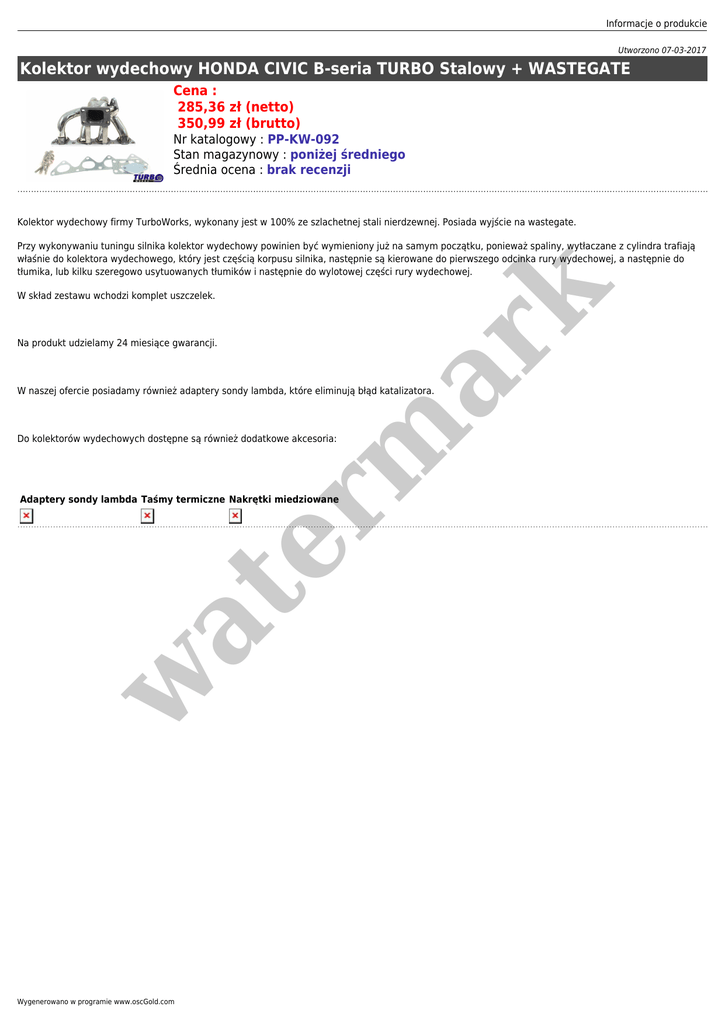 Informacje o produkcie Utworzono 07-03-2017 Kolektor wydechowy HONDA CIVIC B-seria TURBO Stalowy + WASTEGATE Cena : 285,36 zł (netto) 350,99 zł (brutto) Nr katalogowy : PP-KW-092 Stan magazynowy : poniżej średniego Średnia ocena : brak recenzji Kolektor wydechowy firmy TurboWorks, wykonany jest w 100% ze szlachetnej stali nierdzewnej. Posiada wyjście na wastegate. er m ar k Przy wykonywaniu tuningu silnika kolektor wydechowy powinien być wymieniony już na samym początku, ponieważ spaliny, wytłaczane z cylindra trafiają właśnie do kolektora wydechowego, który jest częścią korpusu silnika, następnie są kierowane do pierwszego odcinka rury wydechowej, a następnie do tłumika, lub kilku szeregowo usytuowanych tłumików i następnie do wylotowej części rury wydechowej. W skład zestawu wchodzi komplet uszczelek. Na produkt udzielamy 24 miesiące gwarancji. W naszej ofercie posiadamy również adaptery sondy lambda, które eliminują błąd katalizatora. Do kolektorów wydechowych dostępne są również dodatkowe akcesoria: w at Adaptery sondy lambda Taśmy termiczne Nakrętki miedziowane Wygenerowano w programie www.oscGold.com