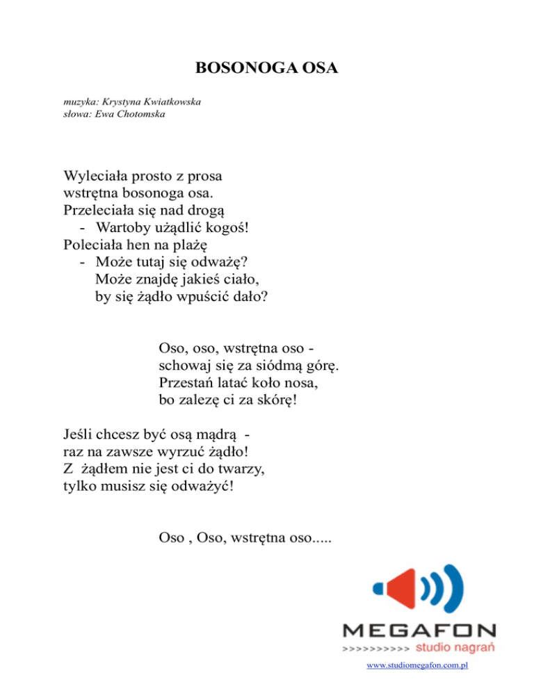 BOSONOGA OSA muzyka: Krystyna Kwiatkowska słowa: Ewa Chotomska Wyleciała prosto z prosa wstrętna bosonoga osa. Przeleciała się nad drogą - Wartoby użądlić kogoś! Poleciała hen na plażę - Może tutaj się odważę? Może znajdę jakieś ciało, by się żądło wpuścić dało? Oso, oso, wstrętna oso schowaj się za siódmą górę. Przestań latać koło nosa, bo zalezę ci za skórę! Jeśli chcesz być osą mądrą raz na zawsze wyrzuć żądło! Z żądłem nie jest ci do twarzy, tylko musisz się odważyć! Oso , Oso, wstrętna oso..... www.studiomegafon.com.pl