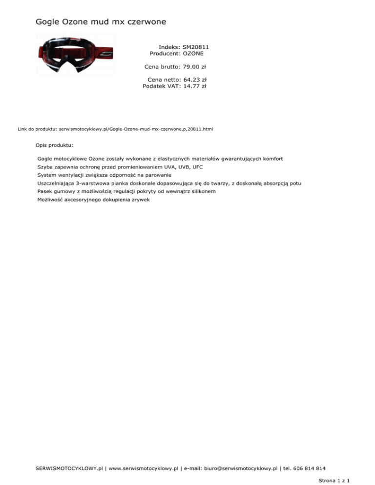 Gogle Ozone mud mx czerwone Indeks: SM20811 Producent: OZONE Cena brutto: 79.00 zł Cena netto: 64.23 zł Podatek VAT: 14.77 zł Link do produktu: serwismotocyklowy.pl/Gogle-Ozone-mud-mx-czerwone,p,20811.html Opis produktu: Gogle motocyklowe Ozone zostały wykonane z elastycznych materiałów gwarantujących komfort Szyba zapewnia ochronę przed promieniowaniem UVA, UVB, UFC System wentylacji zwiększa odporność na parowanie Uszczelniająca 3-warstwowa pianka doskonale dopasowująca się do twarzy, z doskonałą absorpcją potu Pasek gumowy z możliwością regulacji pokryty od wewnątrz silikonem Możliwość akcesoryjnego dokupienia zrywek SERWISMOTOCYKLOWY.pl | www.serwismotocyklowy.pl | e-mail: [email protected] | tel. 606 814 814 Strona 1 z 1