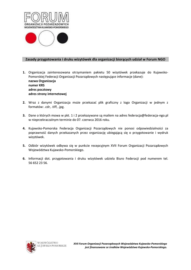 Zasady przygotowania i druku wizytówek dla organizacji biorących udział w Forum NGO 1. Organizacja zainteresowana otrzymaniem pakietu 50 wizytówek przekazuje do KujawskoPomorskiej Federacji Organizacji Pozarządowych następujące informacje (dane): nazwa Organizacja numer KRS adres pocztowy adres strony internetowej 2. Wraz z danymi Organizacja może przekazać plik graficzny z logo Organizacji w jednym z formatów: .cdr, .tiff, .jpg. 3. Dane o których mowa w pkt. 1 i 2 przekazywane są mailem na adres [email protected] w nieprzekraczalnym terminie do 07. czerwca 2016 roku. 4. Kujawsko-Pomorska Federacja Organizacji Pozarządowych nie ponosi odpowiedzialności za poprawność danych przekazanych przez organizację ubiegającą się o przygotowanie i wydruk wizytówek. 5. Odbiór wizytówek odbywa się w punkcie recepcyjnym XVII Forum Organizacji Pozarządowych Województwa Kujawsko-Pomorskiego. 6. Informacji dot. przygotowania i druku wizytówek udziela Biuro Federacji pod numerem tel. 56 652 23 56. XVII Forum Organizacji Pozarządowych Województwa Kujawsko-Pomorskiego jest finansowane ze środków Województwa Kujawsko-Pomorskiego.