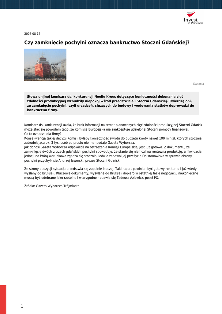 2007-08-17 Czy zamknięcie pochylni oznacza bankructwo Stoczni Gdańskiej? Stocznia Słowa unijnej komisarz ds. konkurencji Neelie Kroes dotyczące konieczności dokonania cięć zdolności produkcyjnej wzbudziły niepokój wśród przedstwicieli Stoczni Gdańskiej. Twierdzą oni, że zamknięcie pochylni, czyli urządzeń, służących do budowy i wodowania statków doprowadzi do bankructwa firmy. Komisarz ds. konkurencji uzała, że brak informacji na temat planowanych cięć zdolności produkcyjnej Stoczni Gdańsk może stać się powodem tego ,że Komiisja Europejska nie zaakceptuje udzielonej Stoczni pomocy finansowej. Co to oznacza dla firmy? Konsekwencją takiej decyzji Komisji byłaby konieczność zwrotu do budżetu kwoty nawet 100 mln zł, których stocznia zatrudniająca ok. 3 tys. osób po prostu nie ma- podaje Gazeta Wyborcza. Jak donosi Gazeta Wyborcza odpowiedź na ostrzeżenia Komisji Europejskiej jest już gotowa. Z dokumentu, że zamknięcie dwóch z trzech gdańskich pochylni spowoduje, że stanie się niemożliwa rentowną produkcję, a likwidacja jednej, na którą warunkowo zgadza się stocznia, ledwie zapewni jej przeżycie.Do stanowiska w sprawie obrony pochylni przychylił się Andrzej Jaworski, prezes Stoczni Gdańsk. Ze strony opozycji sytuacja przedstwia się zupełnie inaczej. Taki raport powinien być gotowy rok temu i już wtedy wysłany do Brukseli. Kluczowe dokumenty, wysyłane do Brukseli dopiero w ostatniej fazie negocjacji, niekonieczne muszą być odebrane jako rzetelne i wiarygodne - obawia się Tadeusz Aziewicz, poseł PO. Żródło: Gazeta Wyborcza Trójmiasto 1
