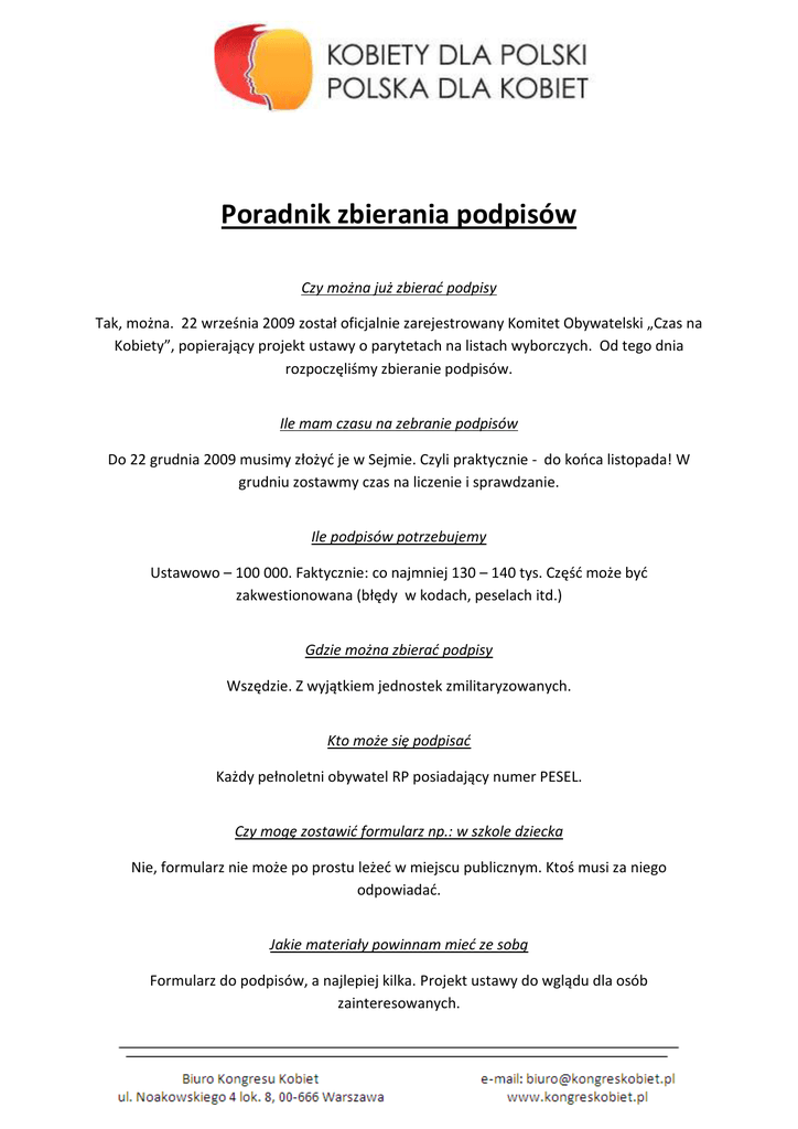Poradnik zbierania podpisów Czy można już zbierać podpisy Tak, można. 22 września 2009 został oficjalnie zarejestrowany Komitet Obywatelski „Czas na Kobiety”, popierający projekt ustawy o parytetach na listach wyborczych. Od tego dnia rozpoczęliśmy zbieranie podpisów. Ile mam czasu na zebranie podpisów Do 22 grudnia 2009 musimy złożyć je w Sejmie. Czyli praktycznie - do końca listopada! W grudniu zostawmy czas na liczenie i sprawdzanie. Ile podpisów potrzebujemy Ustawowo – 100 000. Faktycznie: co najmniej 130 – 140 tys. Część może być zakwestionowana (błędy w kodach, peselach itd.) Gdzie można zbierać podpisy Wszędzie. Z wyjątkiem jednostek zmilitaryzowanych. Kto może się podpisać Każdy pełnoletni obywatel RP posiadający numer PESEL. Czy mogę zostawić formularz np.: w szkole dziecka Nie, formularz nie może po prostu leżeć w miejscu publicznym. Ktoś musi za niego odpowiadać. Jakie materiały powinnam mieć ze sobą Formularz do podpisów, a najlepiej kilka. Projekt ustawy do wglądu dla osób zainteresowanych. Co zrobić z wypełnionym formularzem Wysłać do Biura Kongresu Kobiet: ul. Noakowskiego 4 lok.8, 00-666 Warszawa z dopiskiem: PODPISY Czy można wysłać wypełniony formularz faxem Nie, formularze, które do nas trafiają, muszą być z osobistymi podpisami. Czy warto wysyłać formularze z kilkoma tylko podpisami Tak! Każdy podpis jest na wagę złota. Czy istnieją terenowe jednostki Kongresu Kobiet w których można zostawić formularz W niektórych miastach tak, w innych powstaną. Informacje będą na www.kongreskobiet.pl Czy ilość zebranych podpisów wpływa na procedurę zbierania Nie, niezależnie od tego ile podpisów planujesz zebrać, sposób jest zawsze ten sam. Jeśli mam pomysł na zebranie większej ilości podpisów Poinformuj nas o tym: [email protected] Co mam zrobić w przypadku dalszych pytań Kontaktować się z nami: [email protected] lub zajrzeć na stronę internetową www.kongreskobiet.pl