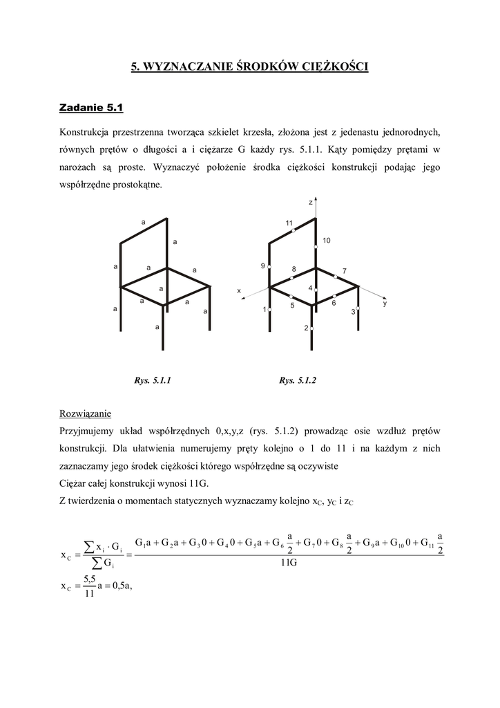 5. WYZNACZANIE ŚRODKÓW CIĘŻKOŚCI Zadanie 5.1 Konstrukcja przestrzenna tworząca szkielet krzesła, złożona jest z jedenastu jednorodnych, równych prętów o długości a i ciężarze G każdy rys. 5.1.1. Kąty pomiędzy prętami w narożach są proste. Wyznaczyć położenie środka ciężkości konstrukcji podając jego współrzędne prostokątne. z a 11 10 a a a 9 a a a 8 4 x a a 7 a a Rys. 5.1.1 6 5 1 y 3 2 Rys. 5.1.2 Rozwiązanie Przyjmujemy układ współrzędnych 0,x,y,z (rys. 5.1.2) prowadząc osie wzdłuż prętów konstrukcji. Dla ułatwienia numerujemy pręty kolejno o 1 do 11 i na każdym z nich zaznaczamy jego środek ciężkości którego współrzędne są oczywiste Ciężar całej konstrukcji wynosi 11G. Z twierdzenia o momentach statycznych wyznaczamy kolejno xC, yC i zC xC = xC = ∑ xi ⋅ Gi ∑ Gi = 5,5 a = 0,5a , 11 a a a + G 7 0 + G 8 + G 9 a + G 10 0 + G 11 2 2 2 11G G 1a + G 2 a + G 3 0 + G 4 0 + G 5 a + G 6 co można było przewidzieć ze wzglądu na płaszczyznę symetrii konstrukcji. yC = yC = ∑ yi ⋅ Gi ∑G = G1 0 + G 2a + G 3a + G 4 0 + G 5 i a a + G 6 a + G 7 + G 8 0 + G 9 0 + G 10 0 + G 11 0 2 2 = 11G 4 a 11 a a a a a a G 1 − + G 2 − + G 3 − + G 4 − + G 9 + G 10 + G 11 a 2 2 ∑ xi ⋅Gi = 2 2 2 2 zC = 11G ∑ Gi z C = 0. Zadanie 5.2 Wyznaczyć położenie środka ciężkości figury płaskiej pokazanej na rysunku 5.2.a. Rys.5.2.a Rys.5.2.b Przyjmujemy układ odniesienia, względem którego będziemy wyznaczali współrzędne środka ciężkości (rys.5.2.b). Położenie układu odniesienia może być dowolne, starajmy się jednak ułatwić sobie dalszą pracę. Osie skierujmy wzdłuż boków figur, wzdłuż osi symetrii jeżeli figura je posiada, itp. Następnie dzielimy naszą figurę na figury proste, w tym przypadku dwa prostokąty I i II, (rys.5.2.b). Zaznaczamy środki ciężkości tych prostokątów symbolami C1 i C2, a ich współrzędne w przyjętym układzie odniesienia i pola powierzchni wynoszą A1 = 2 6 = 12; x1 = 1; y1 = 5; A2 = 2⋅6 = 12; x2 = 3; y2 = 1. Wstawiamy do wzoru na współrzędne środka ciężkości (twierdzenie o momentach statycznych) xC = yC = ∑A ⋅ xi A ∑A xC = 2; i i A ⋅ yi = A1 ⋅ x1 + A 2 ⋅ x 2 12 ⋅ 1 + 12 ⋅ 3 = = 2; A 24 = A1 ⋅ y1 + A 2 ⋅ y 2 12 ⋅ 5 + 12 ⋅ 1 = =3 A 24 yC = 3 Nanosimy ten punkt na rysunek 5.2.b, oznaczamy go C. Zadanie 5.3 Wyznaczyć położenie środka ciężkości figury przedstawionej na rysunku 5.3.a powstałej przez wycięcie z ćwiartki koła o promieniu a połówki koła o promieniu a/2. Rys.5.3.a Rys.5.3.b Rozwiązanie: Przyjmujemy układ osi 0xy rys. 5.3.b i zaznaczmy orientacyjnie położenie środków ciężkości C1 i C2 figur składowych. W obliczeniach potraktujemy moment statyczny danej figury jako różnicę momentów statycznych figur składowych. A1 ⋅ x1 − A 2 ⋅ x 2 ; A A ⋅ y − A2 ⋅ y2 yc = 1 1 A xc = Przygotowanie danych do wstawienia Powierzchnia pola figury A= π⋅a2 π⋅a2 π⋅a2 − = 4 8 8 powierzchnia ćwiartki koła A1 = π⋅a2 ; 4 powierzchnia półkola A2 = π⋅a2 ; 8 współrzędne środka ciężkości ćwiartki koła 2 2 sin 45 2 2 4a x 1 = OC1 ⋅ cos 45o = a cos 45o = a 2 = π 3 3 π 2 3π 4 4 o y1 = x 1 = 4a ; 3π współrzędne środka ciężkości półkola a x2 = ; 2 2 a sin 90 o 2 a y2 = = , 32 π 3π 2 Wstawiając do wzorów π⋅ a 2 4 a π⋅ a 2 a ⋅ − ⋅ 8 1 xc = 4 3 π 2 8 2 = − ⋅a π⋅a 3π 2 8 π ⋅ a 2 4 a π ⋅ a 2 2a ⋅ − ⋅ 4 3 8 3π = 2 π yc = 2 π π⋅a 8 Zadanie 5.4 Dla figury o wymiarach jak na rysunku 5.4.a wyznaczyć położenie środka ciężkości. Wymiary podano w metrach. Rys.5.4.a Rys.5.4.b Rozwiązanie Przyjmujemy układ odniesienia względem którego będziemy określać współrzędne środka ciężkości danej figury. Figurę dzielimy na trzy figury proste: prostokąt o bokach 2 × 4 m, trójkąt równoramienny o ramionach równych 2 m i półkole o promieniu 1 m. W każdym ze środków ciężkości figur prostych zaznaczamy orientacyjnie centralny układ odniesienia, rys. 5.4.b Pola powierzchni składowych figur A1 = 8; x1 = -1; y1 = 2 A2 = 2; 1 x2 = ⋅ 2 3 y2 = A3 = π/2 x3 = 4 1 ⋅ 3 π 1 ⋅2 3 y3 = 3 A = A1 + A2 + A3 = 8 + 2 +π/2 = 10 +π/2 Wstawiamy do wzoru na współrzędne środka ciężkości (twierdzenie o momentach statycznych) xC = yC = ∑ Ai ⋅ x i = A ∑ A i ⋅ yi A = A1 ⋅ x1 + A 2 ⋅ x 2 + A 3 ⋅ x 3 = A A1 ⋅ y1 + A 2 ⋅ y 2 + A 3 ⋅ y3 = A 2 π 4 + ⋅ 3 2 3π = −0,52; 10 + π / 2 8 ⋅ (−1) + 2 ⋅ 2 π + ⋅3 3 2 = 1,9 10 + π / 2 8⋅ 2 + 2⋅