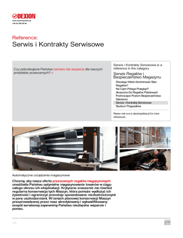 www.dexionpolska.pl +48 22 295 08 00 Reference: Serwis i Kontrakty Serwisowe Czy potrzebujecie Państwo serwisu lub wsparcia dla naszych produktów przesuwnych? » Serwis i Kontrakty Serwisowe is a reference in the category Serwis Regałów i Bezpieczeństwo Magazynu Dlaczego Warto Kontrolować Stan Regałów? Na Czym Polega Przegląd? Akcesoria Do Regałów Paletowych Podnoszące Poziom Bezpieczeństwa Szkolenia Serwis i Kontrakty Serwisowe Studium Przypadków Please visit www.dexionpolska.pl for more references. Automatyczne urządzenia magazynowe Chcemy, aby nasza oferta przesuwnych regałów magazynowych umożliwiła Państwu optymalne magazynowanie towarów w ciągu całego okresu ich eksploatacji. Krytyczne znaczenie ma również regularna konserwacja tych Maszyn, która pomoże wydłużyć ich żywotność i ograniczyć przestoje spowodowane niedostrzeżonymi w porę uszkodzeniami. W ramach planowej konserwacji Maszyn przeprowadzanej przez nasz akredytowany i wykwalifikowany zespół serwisowy zapewnimy Państwu niezbędne wsparcie i pomoc. 1/2 www.dexionpolska.pl +48 22 295 08 00 Zdajemy sobie sprawę ze znaczenia ciągłej sprawności Państwa Maszyn, dlatego w razie ich awarii potrzebować będziecie Państwo gwarancji jak najszybszego przywrócenia ich pełnej sprawności. Nasze zdalne centrum serwisowe jest gotowe do natychmiastowej reakcji i może od razu podjąć próbę rozwiązania Państwa problemów. Przez 24 godziny na dobę i przez 7 dni w tygodniu oferujemy Państwu usługi naszego zespołu wykwalifikowanych inżynierów, którzy pomogą w ograniczaniu do minimum ewentualnych przestojów. 95% problemów można rozwiązać zdalnie, a w przypadku pozostałych 5% problemów wyślemy do Państwa w możliwie najkrótszym terminie naszego specjalistę. Aby dowiedzieć się więcej na temat poziomu obsługi serwisowej, jaki możemy Państwu zaoferować, prosimy o kontakt z nami. Prosimy o kontakt telefoniczny, na numer 22 295 08 00 lub e-mailowy, na adres [email protected] Regały jezdne Jezdne Systemy Regałów Paletowych MOVO mają bardzo wiele zalet, a firmy inwestujące w to rozwiązanie rozumieją oferowane przez to rozwiązanie korzyści. Naszym celem jest pomóc Państwu w zabezpieczeniu inwestycji i w utrzymywaniu urządzeń w optymalnym stanie i sprawności oraz jak najwyższego poziomu ich bezpieczeństwa. Specjaliści firmy Dexion posiadają bogate doświadczenia i wysokie kwalifikacje w zakresie serwisu i kontroli Regałów Jezdnych MOVO. Przesuwne systemy regałowe wymagają regularnego serwisowania urządzeń elektrycznych oraz corocznych kontroli konstrukcji regałów paletowych. Dzięki ścisłej współpracy z Państwem możemy zaoferować Państwu wsparcie w ciągu całego cyklu użytkowania regałów. Aby dowiedzieć się więcej na temat zalet usług serwisowych Dexion, prosimy o kontakt z nami. Prosimy o kontakt z nami na numer telefonu 22 295 08 00 lub przez e-mail, na adres [email protected] 2/2
