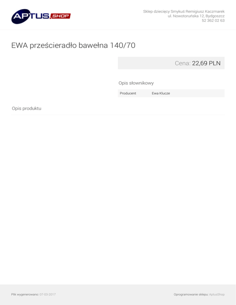 Sklep dziecięcy Smykuś Remigiusz Kaczmarek ul. Nowotoruńska 12, Bydgoszcz 52 362 02 63 EWA prześcieradło bawełna 140/70 Cena: 22,69 PLN Opis słownikowy Producent Ewa Klucze Opis produktu Plik wygenerowano: 07-03-2017 Powered by TCPDF (www.tcpdf.org) Oprogramowanie sklepu: AptusShop
