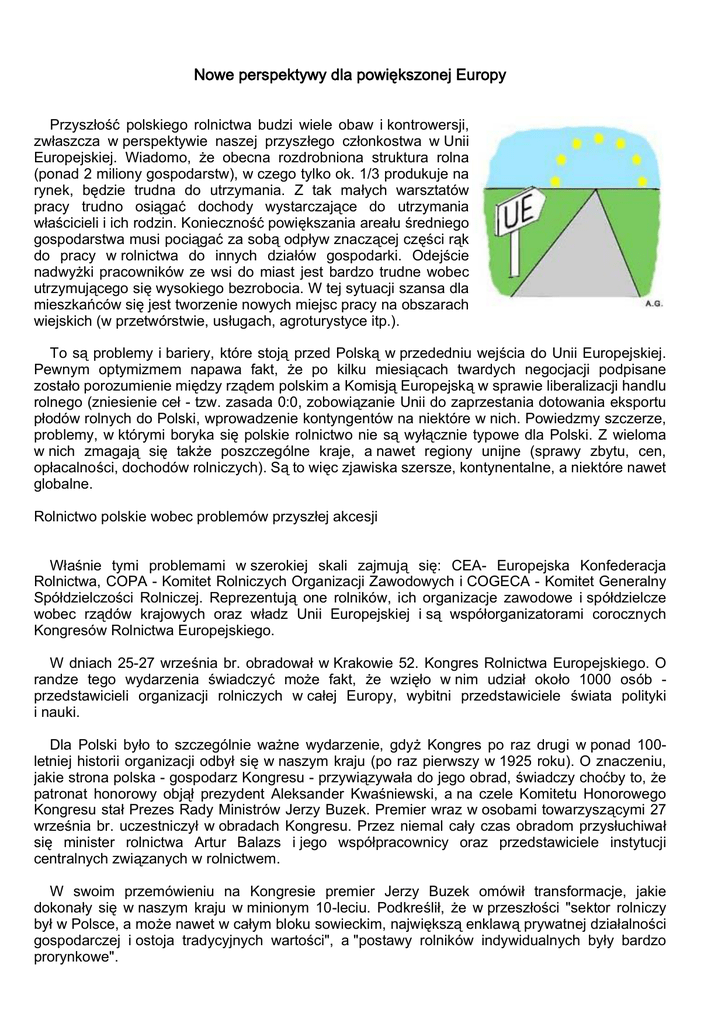 Nowe perspektywy dla powiększonej Europy Przyszłość polskiego rolnictwa budzi wiele obaw i kontrowersji, zwłaszcza w perspektywie naszej przyszłego członkostwa w Unii Europejskiej. Wiadomo, że obecna rozdrobniona struktura rolna (ponad 2 miliony gospodarstw), w czego tylko ok. 1/3 produkuje na rynek, będzie trudna do utrzymania. Z tak małych warsztatów pracy trudno osiągać dochody wystarczające do utrzymania właścicieli i ich rodzin. Konieczność powiększania areału średniego gospodarstwa musi pociągać za sobą odpływ znaczącej części rąk do pracy w rolnictwa do innych działów gospodarki. Odejście nadwyżki pracowników ze wsi do miast jest bardzo trudne wobec utrzymującego się wysokiego bezrobocia. W tej sytuacji szansa dla mieszkańców się jest tworzenie nowych miejsc pracy na obszarach wiejskich (w przetwórstwie, usługach, agroturystyce itp.). To są problemy i bariery, które stoją przed Polską w przededniu wejścia do Unii Europejskiej. Pewnym optymizmem napawa fakt, że po kilku miesiącach twardych negocjacji podpisane zostało porozumienie między rządem polskim a Komisją Europejską w sprawie liberalizacji handlu rolnego (zniesienie ceł  tzw. zasada 0:0, zobowiązanie Unii do zaprzestania dotowania eksportu płodów rolnych do Polski, wprowadzenie kontyngentów na niektóre w nich. Powiedzmy szczerze, problemy, w którymi boryka się polskie rolnictwo nie są wyłącznie typowe dla Polski. Z wieloma w nich zmagają się także poszczególne kraje, a nawet regiony unijne (sprawy zbytu, cen, opłacalności, dochodów rolniczych). Są to więc zjawiska szersze, kontynentalne, a niektóre nawet globalne. Rolnictwo polskie wobec problemów przyszłej akcesji Właśnie tymi problemami w szerokiej skali zajmują się: CEA Europejska Konfederacja Rolnictwa, COPA  Komitet Rolniczych Organizacji Zawodowych i COGECA  Komitet Generalny Spółdzielczości Rolniczej. Reprezentują one rolników, ich organizacje zawodowe i spółdzielcze wobec rządów krajowych oraz władz Unii Europejskiej i są współorganizatorami corocznych Kongresów Rolnictwa Europejskiego. W dniach 2527 września br. obradował w Krakowie 52. Kongres Rolnictwa Europejskiego. O randze tego wydarzenia świadczyć może fakt, że wzięło w nim udział około 1000 osób  przedstawicieli organizacji rolniczych w całej Europy, wybitni przedstawiciele świata polityki i nauki. Dla Polski było to szczególnie ważne wydarzenie, gdyż Kongres po raz drugi w ponad 100 letniej historii organizacji odbył się w naszym kraju (po raz pierwszy w 1925 roku). O znaczeniu, jakie strona polska  gospodarz Kongresu  przywiązywała do jego obrad, świadczy choćby to, że patronat honorowy objął prezydent Aleksander Kwaśniewski, a na czele Komitetu Honorowego Kongresu stał Prezes Rady Ministrów Jerzy Buzek. Premier wraz w osobami towarzyszącymi 27 września br. uczestniczył w obradach Kongresu. Przez niemal cały czas obradom przysłuchiwał się minister rolnictwa Artur Balazs i jego współpracownicy oraz przedstawiciele instytucji centralnych związanych w rolnictwem. W swoim przemówieniu na Kongresie premier Jerzy Buzek omówił transformacje, jakie dokonały się w naszym kraju w minionym 10leciu. Podkreślił, że w przeszłości "sektor rolniczy był w Polsce, a może nawet w całym bloku sowieckim, największą enklawą prywatnej działalności gospodarczej i ostoja tradycyjnych wartości", a "postawy rolników indywidualnych były bardzo prorynkowe". Nawiązując do wyzwań stojących przed Polską i rolnictwem, premier powiedział: " Postępujące prace nad modernizacją i restrukturyzacją rolnictwa są wkomponowane w całość przygotowań polski do członkostwa w UE. Przygotowanie polskiego rolnictwa, gospodarki żywnościowej i obszarów wiejskich w integracji ze strukturami Unii Europejskiej jest jednym w podstawowych celów polityki rolnej, zawartej w Średniookresowej strategii rozwoju rolnictwa i obszarów wiejskich w 1998 roku, Spójnej polityki strukturalnej rozwoju obszarów wiejskich i rolnictwa w 1999 roku oraz Pakcie dla rolnictwa w obecnego roku. Powodzenie przekształceń w polskim rolnictwie zależy także od postawy strony unijnej. [...] Uważam, że po rozszerzeniu, polscy rolnicy wypełniając wszystkie obowiązki, powinni korzystać ze wszystkich praw wynikających ze wspólnej polityki rolnej. Brak jasności kwestii dopłat bezpośrednich stanowi zasadniczą przeszkodę w sprostaniu konkurencji wspólnotowej i ustaleniu limitów produkcyjnych dla wszystkich istotnych produktów". Właśnie problemy związane w wejściem Polski i niektórych innych państw Europy Środkowo Wschodniej do Unii Europejskiej, skutki dla rolnictwa były wiodącymi podczas obrad Kongresu. Zarówno w przemówieniach oficjalnych, w dyskusjach plenarnych, jak i rozmowach toczonych w ramach grup roboczych. Samo hasło 52.Kongresu "Nowe perspektywy dla powiększonej Europy" dobrze charakteryzuje przewodni temat obrad. W dyskusji przedstawiciele różnych krajów, regionów i organizacji kładli nacisk na wyrównywanie dysproporcji, na zagwarantowanie opłacalności produkcji i godziwych dochodów właścicielom gospodarstw rolnych. Bardzo silnie akcentowano potrzebę aktywności organizacji zawodowych rolników i organizacji spółdzielczych w zakresie planowania produkcji, organizowania rynków zbytu i zaopatrzenia. Dominowało przekonanie, że rolnictwo nie może być zupełnie puszczone na żywioł rynku, że niezbędne jest sterowanie w skali poszczególnych krajów i regionów, że konieczny jest rozsądny interwencjonizm rządów i Komisji Europejskiej. Starania rządu o nowoczesne polskie rolnictwo Jako gospodarz strona polska może być zadowolona w przebiegu imprezy. Organizacja spotkała się w uznaniem gości, wyniki obrad stanowią ważny wkład do rozwiązywania problemów rolnictwa w skali całej Europy. Polskie problemy i stanowisko prezentowane przez naszych przedstaw