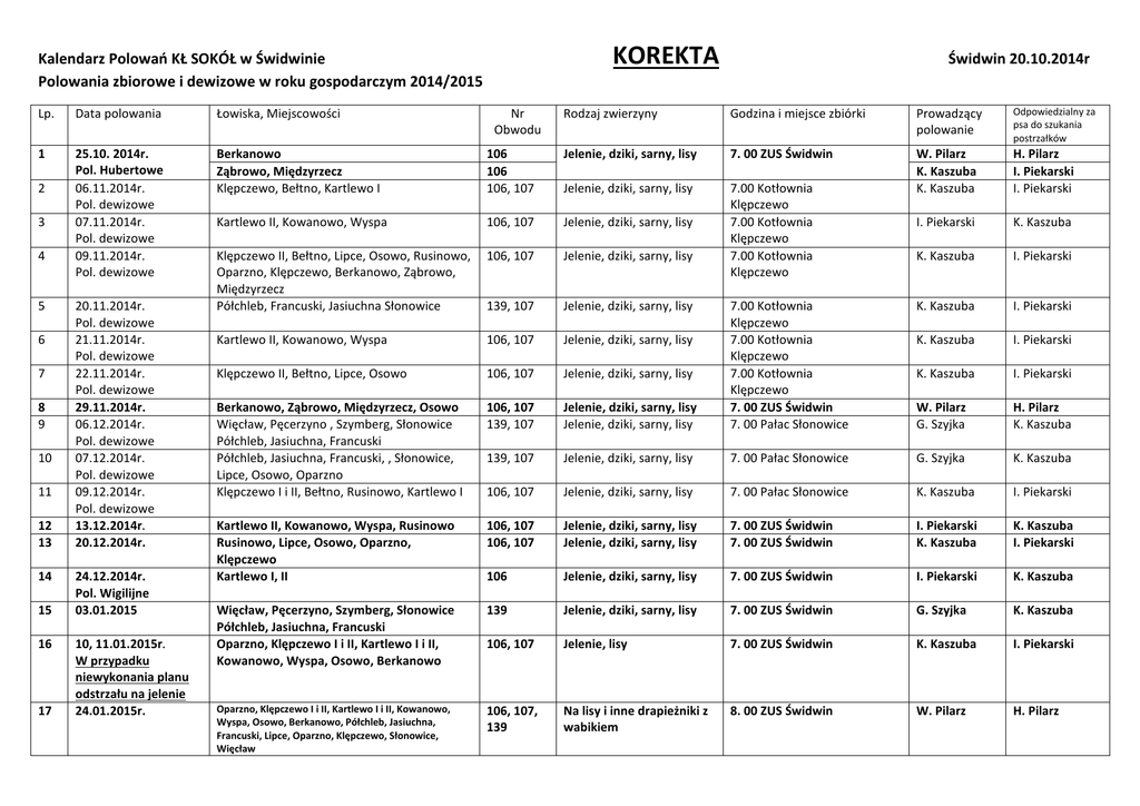 KOREKTA Kalendarz Polowań KŁ SOKÓŁ w Świdwinie Polowania zbiorowe i dewizowe w roku gospodarczym 2014/2015 Rodzaj zwierzyny Godzina i miejsce zbiórki Prowadzący polowanie Odpowiedzialny za psa do szukania postrzałków 106 106 106, 107 Jelenie, dziki, sarny, lisy 7. 00 ZUS Świdwin Jelenie, dziki, sarny, lisy H. Pilarz I. Piekarski I. Piekarski Kartlewo II, Kowanowo, Wyspa 106, 107 Jelenie, dziki, sarny, lisy I. Piekarski K. Kaszuba Klępczewo II, Bełtno, Lipce, Osowo, Rusinowo, Oparzno, Klępczewo, Berkanowo, Ząbrowo, Międzyrzecz Półchleb, Francuski, Jasiuchna Słonowice 106, 107 Jelenie, dziki, sarny, lisy 7.00 Kotłownia Klępczewo 7.00 Kotłownia Klępczewo 7.00 Kotłownia Klępczewo W. Pilarz K. Kaszuba K. Kaszuba K. Kaszuba I. Piekarski 139, 107 Jelenie, dziki, sarny, lisy K. Kaszuba I. Piekarski Kartlewo II, Kowanowo, Wyspa 106, 107 Jelenie, dziki, sarny, lisy K. Kaszuba I. Piekarski Klępczewo II, Bełtno, Lipce, Osowo 106, 107 Jelenie, dziki, sarny, lisy Berkanowo, Ząbrowo, Międzyrzecz, Osowo Więcław, Pęcerzyno , Szymberg, Słonowice Półchleb, Jasiuchna, Francuski Półchleb, Jasiuchna, Francuski, , Słonowice, Lipce, Osowo, Oparzno Klępczewo I i II, Bełtno, Rusinowo, Kartlewo I 106, 107 139, 107 Kartlewo II, Kowanowo, Wyspa, Rusinowo Rusinowo, Lipce, Osowo, Oparzno, Klępczewo Kartlewo I, II Lp. Data polowania Łowiska, Miejscowości 1 25.10. 2014r. Pol. Hubertowe 06.11.2014r. Pol. dewizowe 07.11.2014r. Pol. dewizowe 09.11.2014r. Pol. dewizowe Berkanowo Ząbrowo, Międzyrzecz Klępczewo, Bełtno, Kartlewo I 2 3 4 5 6 7 8 9 10 11 12 13 14 15 16 17 20.11.2014r. Pol. dewizowe 21.11.2014r. Pol. dewizowe 22.11.2014r. Pol. dewizowe 29.11.2014r. 06.12.2014r. Pol. dewizowe 07.12.2014r. Pol. dewizowe 09.12.2014r. Pol. dewizowe 13.12.2014r. 20.12.2014r. 24.12.2014r. Pol. Wigilijne 03.01.2015 10, 11.01.2015r. W przypadku niewykonania planu odstrzału na jelenie 24.01.2015r. Świdwin 20.10.2014r Więcław, Pęcerzyno, Szymberg, Słonowice Półchleb, Jasiuchna, Francuski Oparzno, Klępczewo I i II, Kartlewo I i II, Kowanowo, Wyspa, Osowo, Berkanowo Oparzno, Klępczewo I i II, Kartlewo I i II, Kowanowo, Wyspa, Osowo, Berkanowo, Półchleb, Jasiuchna, Francuski, Lipce, Oparzno, Klępczewo, Słonowice, Więcław Nr Obwodu K. Kaszuba I. Piekarski Jelenie, dziki, sarny, lisy Jelenie, dziki, sarny, lisy 7.00 Kotłownia Klępczewo 7.00 Kotłownia Klępczewo 7.00 Kotłownia Klępczewo 7. 00 ZUS Świdwin 7. 00 Pałac Słonowice W. Pilarz G. Szyjka H. Pilarz K. Kaszuba 139, 107 Jelenie, dziki, sarny, lisy 7. 00 Pałac Słonowice G. Szyjka K. Kaszuba 106, 107 Jelenie, dziki, sarny, lisy 7. 00 Pałac Słonowice K. Kaszuba I. Piekarski 106, 107 106, 107 Jelenie, dziki, sarny, lisy Jelenie, dziki, sarny, lisy 7. 00 ZUS Świdwin 7. 00 ZUS Świdwin I. Piekarski K. Kaszuba K. Kaszuba I. Piekarski 106 Jelenie, dziki, sarny, lisy 7. 00 ZUS Świdwin I. Piekarski K. Kaszuba 139 Jelenie, dziki, sarny, lisy 7. 00 ZUS Świdwin G. Szyjka K. Kaszuba 106, 107 Jelenie, lisy 7. 00 ZUS Świdwin K. Kaszuba I. Piekarski 106, 107, 139 Na lisy i inne drapieżniki z wabikiem 8. 00 ZUS Świdwin W. Pilarz H. Pilarz 18 25.01.2015r. 19 14.02.2015r. 20 15.02.2015r. Oparzno, Klępczewo I i II, Kartlewo I i II, Kowanowo, Wyspa, Osowo, Berkanowo, Półchleb, Jasiuchna, Francuski, Lipce, Oparzno, Klępczewo, Słonowice, Więcław Oparzno, Klępczewo I i II, Kartlewo I i II, Kowanowo, Wyspa, Osowo, Berkanowo, Półchleb, Jasiuchna, Francuski, Lipce, Oparzno, Klępczewo, Słonowice, Więcław Oparzno, Klępczewo I i II, Kartlewo I i II, Kowanowo, Wyspa, Osowo, Berkanowo, Półchleb, Jasiuchna, Francuski, Lipce, Oparzno, Klępczewo, Słonowice, Więcław Otrzymują: 1. Nadleśnictwo Świdwin 2. ZO PZŁ w Koszalinie 3. Zarząd Gminy Świdwin i Brzeżno 106, 107, 139 Na lisy i inne drapieżniki z wabikiem 8. 00 ZUS Świdwin W. Pilarz H. Pilarz 106, 107, 139 Na lisy i inne drapieżniki z wabikiem 8. 00 ZUS Świdwin G. Szyjka K. Kaszuba 106, 107, 139 Na lisy i inne drapieżniki z wabikiem 8. 00 ZUS Świdwin G. Szyjka K. Kaszuba Z poważaniem Łowczy Koła AndrzejWędziński
