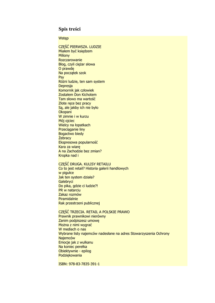 Spis treści Wstęp CZĘŚĆ PIERWSZA. LUDZIE Miałem być księdzem Miliony Rozczarowanie Blog, czyli ciężar słowa O prawdę Na początek szok Psy Różni ludzie, ten sam system Depresja Komornik jak człowiek Zostałem Don Kichotem Tam słowo ma wartość Złote ręce bez pracy Są, ale jakby ich nie było Okopani W zimnie i w kurzu Mój ojciec Wielcy na łopatkach Przeciąganie liny Bogactwo biedy Żebracy Ekspresowa popularność Kara za wiarę A na Zachodzie bez zmian? Kropka nad i CZĘŚĆ DRUGA. KULISY RETAILU Co to jest retail? Historia galerii handlowych w pigułce Jak ten system działa? Galebryci Do pika, gdzie ci ludzie?! PR w natarciu Zakaz rozmów Piramidalnie Rak przestrzeni publicznej CZĘŚĆ TRZECIA. RETAIL A POLSKIE PRAWO Prawnik prawnikowi nierówny Zanim podpiszesz umowę Można z nimi wygrać W mediach o nas Wybrane listy najemców nadesłane na adres Stowarzyszenia Ochrony Najemców Emocje jak z wulkanu Na koniec perełka Obiektywnie - epilog Podziękowania ISBN: 978-83-7835-391-1