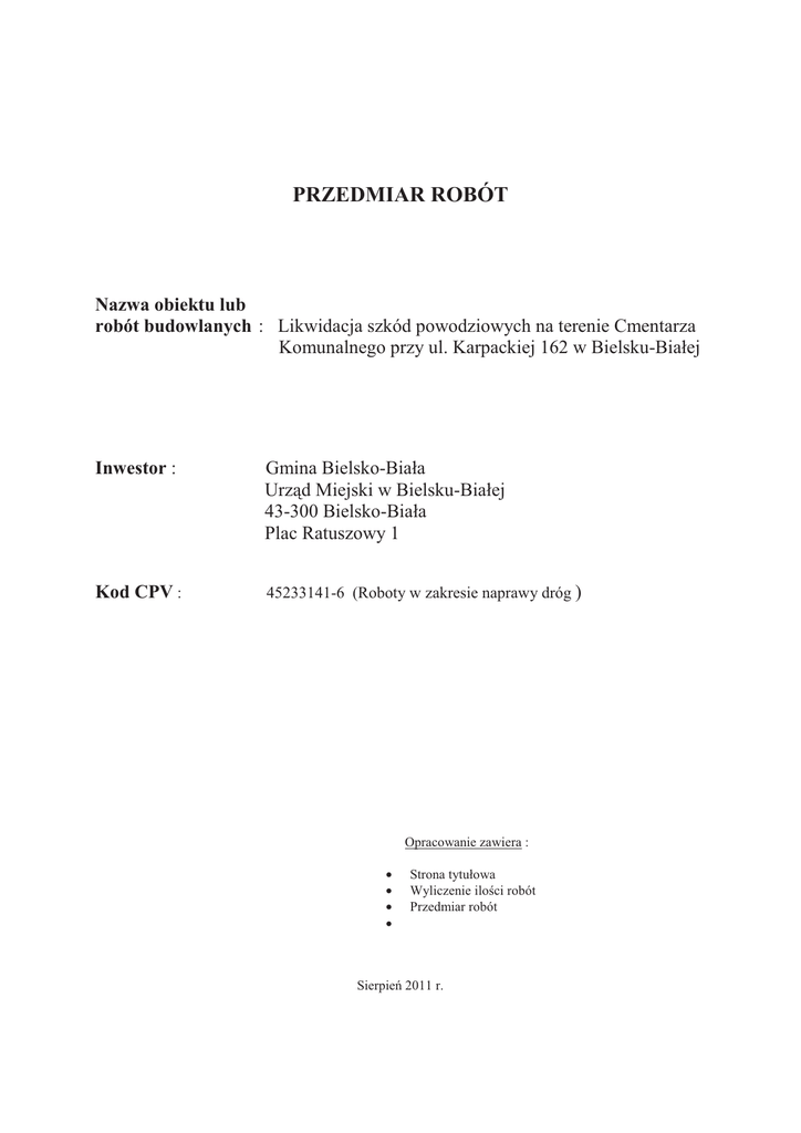 PRZEDMIAR ROBÓT Nazwa obiektu lub robót budowlanych : Likwidacja szkód powodziowych na terenie Cmentarza Komunalnego przy ul. Karpackiej 162 w Bielsku-Białej Inwestor : Gmina Bielsko-Biała Urząd Miejski w Bielsku-Białej 43-300 Bielsko-Biała Plac Ratuszowy 1 Kod CPV : 45233141-6 (Roboty w zakresie naprawy dróg ) Opracowanie zawiera : • • • • Strona tytułowa Wyliczenie iloĞci robót Przedmiar robót SierpieĔ 2011 r. cmentarz szkody Zuzia (C) DataComp 1994-2006(lic. 2458) strona nr: 2 Wyliczenie ilości robót Podstawa nakładu, opis pozycji, wyliczenie ilości robót Ilość Krot. Jedn. 1 Remont alejki brukowanej pom. sektorem G kw. 59 - 63 i 54-48 /grupa 452 - CPV/ 1 KNNR 6/804/2 Rozebranie nawierzchni z kostki brukowej betonowej ,na podsypce cementowo-piaskowej /SST 001/ 5,0*2,0+32,0*3,0 = 106,0 106,0 ~106,0 m2 2 KNNR 6/103/1 Profilowanie i zagęszczanie podłoża pod warstwy konstrukcyjne 106,0 m2 nawierzchni, wykonywane ręcznie, kategoria gruntu II-IV /SST 002/ 3 KNNR 6/107/1 Wyrównanie istniejącej podbudowy (zagęszczenie mechaniczne), klińcem kamiennym ,warstwa po zagęszczeniu do 10 cm /SST 002/ 106,0*0,05*50% = 2,65 2,65 ~2,65 m3 4 KNNR 6/502/3 (1) Chodniki z kostki brukowej betonowej, grubość 8·cm, podsypka cementowo-piaskowa z wypełnieniem spoin piaskiem, kostka szara /90% kostki z odzysku/ /SST 002/ 106,0 m2 2 Remont alejki brukowanej pom. sektorem G kw. 1 /grupa 452 - CPV/ 5 KNNR 6/804/2 Rozebranie nawierzchni z kostki brukowej betonowej na podsypce cementowo-piaskowej /SST 001/ 25,0*3,0 = 75,0 75,0 ~75,0 m2 6 KNNR 6/103/1 Profilowanie i zagęszczanie podłoża pod warstwy konstrukcyjne nawierzchni, wykonywane ręcznie, kategoria gruntu II-IV /SST 002/ 75,0 m2 7 KNNR 6/107/1 Wyrównanie istniejącej podbudowy (zagęszczenie mechaniczne), tłuczniem sortowanym, warstwa po zagęszczeniu do /SST 002/ 75,0*0,05*50% = 1,875 1,875 ~1,9 m3 8 KNNR 6/502/3 (1) Chodniki z kostki brukowej betonowej, grubość 8·cm, podsypka cementowo-piaskowa z wypełnieniem spoin piaskiem, kostka szara - 90% kostki z odzysku /SST 002/ 75,0 m2 3 Remont schodów terenowych z płyt chodnikowych w sektorze A kw.2 /grupa 4542 - CPV/ 9 KNNR 6/805/6 Rozebranie nawierzchni z płyt betonowych, chodniki, na podsypce piaskowej, płyty 50x50x7·cm /SST 001/ 1,0*0,50*2 = 1,0 1,0*0,50*4 = 2,0 1,0*0,50*6*2 = 6,0 9,0 ~9,0 m2 10 KNR 231/810/3 Rozebranie nawierzchni, z betonu, ręczne, grubość nawierzchni 12·cm /SST 001/ 1,0*0,60*4 = 2,4 2,4 ~2,40 m2 11 KNNR 6/806/8 Obrzeża trawnikowe 8x30·cm na podsypce piaskowej - rozebranie /SST 001/ 1,0*3+1,80*2 = 6,6 1,0*4+3,0*2 = 10,0 1,0*6*2+4,20*2*2 = 28,8 45,4 ~45,4 m 12 KNR 231/101/7 Koryta wykonywane na całej szerokości jezdni i chodników, ręcznie, grunt kategorii III-VI, na głębokości 20·cm /SST 003/ (1,50+3,0+4,20*2)*1,20 = 15,48 15,48 ~15,48 m2 13 KNR 231/101/8 Koryta wykonywane na całej szerokości jezdni i chodników, ręcznie, grunt kategorii III-VI, dodatek za każde dalsze 5·cm głębokości , krotność 2 /SST 003/ 15,48 2,00 m2 14 KNNR 6/104/1 (1) Warstwy z piasku o frakcji ziaren do 2 mm , grubość po zagęszczeniu 10·cm /SST 003/ 15,48 m2 15 KNR 231/104/4 J.w. lecz dodatek za każdy 1·cm , krotnośc 5 /SST 003/ 15,48 5,00 m2 16 KNNR 2/1201/1 (2) Podkłady, betonowe, beton zwykły, B10 /SST 003/ 15,48*0,15 = 2,322 2,322 ~2,32 m3 17 KNNR 6/404/5 Obrzeża betonowe, 30x8·cm, podsypka cementowo-piaskowa, wypełnienie spoin zaprawą cementową /SST 003/ 45,40 m Likwidacja szkód powodziowych na terenie Cmentarza Komunalnego przy ul. Karpackiej 162 w Bielsku-Białej cmentarz szkody Zuzia (C) DataComp 1994-2006(lic. 2458) strona nr: 3 Podstawa nakładu, opis pozycji, wyliczenie ilości robót Ilość Krot. Jedn. 18 KNNR 6/502/3 (1) Chodniki z kostki brukowej betonowej, grubość 8·cm, podsypka cementowo-piaskowa z wypełnieniem spoin piaskiem, kostka szara /SST 003/ 2,40+1,0*0,42*(2+6+6*2) = 10,8 10,8 ~10,80 m2 19 KNR 401/108/11 Wywóz gruzu spryzmowanego samochodami samowyładowczymi do 1·km /SST 001/ 9,0*0,07+2,40*0,12+ 45,40*0,30*0,08 = 2,0076 2,0076 ~2,01 m3 20 KNR 401/108/12 Wywóz gruzu spryzmowanego samochodami samowyładowczymi na każdy następny 1·km , krotność 9 /SST 001/ 2,01 9,00 m3 21 KNR 401/108/7 Wywóz samochodami samowyładowczymi do 1·km, grunt kategorii IV /SST 001/ 15,48*0,30 = 4,644 4,644 ~4,64 m3 22 KNR 401/108/8 Wywóz samochodami samowyładowczymi, ziemia, dodatek za każdy 4,64 9,00 m3 następny 1·km, krotność 9 /ASST 001/ 23 Analiza.Opłata za składowanie materiałów z rozbiórki i ziemi /SST 001/ 2,01+4,64 = 6,65 6,65 ~6,65 m3 4 Remont nawierzchni asfaltowej pom. sektorem B , a parkingiem /grupa 452 - CPV/ 24 KNNR 6/1108/1 (1) Remonty cząstkowe nawierzchni bitumicznych mieszankami mineralno-bitumicznymi, lepiszcze: asfalt, ręczne obcinanie krawędzi, masa grysowa /SST 004/ (132,0*0,50+8,0*5,0)* 0,04*2,50 = 10,6 10,6 ~10,60 t 25 KNR 231/107/4 Wyrównanie istniejącej podbudowy, mieszanką betonową, zagęszczenie ręczne, średnia grubość warstwy po zagęszczeniu ponad 5·cm /SST 004/ 132,0*0,50*0,10*50% = 3,3 3,3 ~3,30 m3 26 KNNR 6/107/1 Wyrównanie istniejącej podbudowy (zagęszczenie mechaniczne), klińcem kamiennym ,warstwa po zagęszczeniu do 10 cm /SST 004/ 8,0*5,0*0,05*50% = 1,0 1,0 ~1,0 m3 27 KNR 401/108/11 Wywóz gruzu spryzmowanego samochodami samowyładowczymi do 1·km /SST 001/ (132,0*0,50+8,0*5,0)* 0,04*50% = 2,12 2,12 ~2,12 m3 28 KNR 401/108/12 Wywóz gruzu spryzmowanego samochodami samowyładowczymi na każdy następny 1·km , krotność 9 /SST 001/ 2,12 9,00 m3 29 Analiza.Opłata za składowanie materiałów z rozbiórki /SST 001/ 2,12 m3 5 Remont nawierzchni brukowanych w rejonie studni drenażowych /grupa 452 - CPV/ 30 KNNR 6/804/2 Rozebranie nawierzchni z kostki brukowej betonowej na podsypce cementowo-piaskowej /SST 001/ 34*15,0 = 510,0 510,0 ~510,0 m2 31 KNR 231/1406/3 Regulacja pionowa studzienek dla urządzeń podziemnych, włazy 34 szt kanałowe /SST 002/ 32 KN