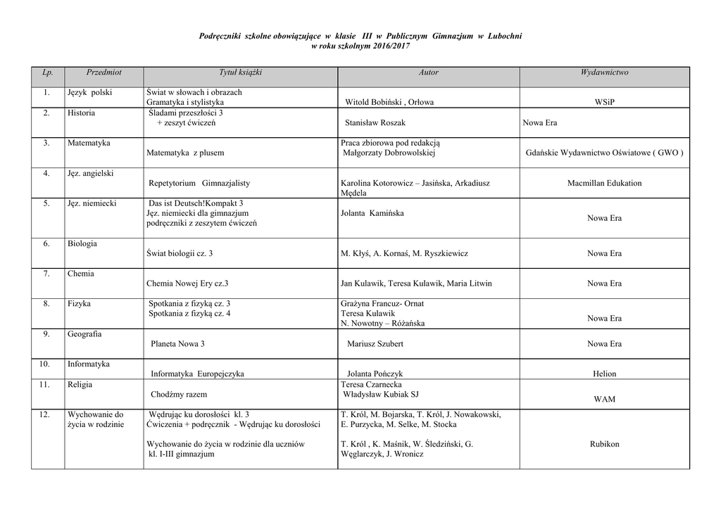 Podręczniki szkolne obowiązujące w klasie III w Publicznym Gimnazjum w Lubochni w roku szkolnym 2016/2017 Lp. Tytuł książki Przedmiot Autor Wydawnictwo 1. . Język polski 2. 2Historia . Świat w słowach i obrazach Gramatyka i stylistyka Śladami przeszłości 3 + zeszyt ćwiczeń 6Matematyka . Matematyka z plusem 7Jęz. angielski . Repetytorium Gimnazjalisty Karolina Kotorowicz – Jasińska, Arkadiusz Mędela Das ist Deutsch!Kompakt 3 Jęz. niemiecki dla gimnazjum podręczniki z zeszytem ćwiczeń Jolanta Kamińska Świat biologii cz. 3 M. Kłyś, A. Kornaś, M. Ryszkiewicz Nowa Era Chemia Nowej Ery cz.3 Jan Kulawik, Teresa Kulawik, Maria Litwin Nowa Era Spotkania z fizyką cz. 3 Spotkania z fizyką cz. 4 Grażyna Francuz- Ornat Teresa Kulawik N. Nowotny – Różańska 3. 4. 5. 6. 7. 8. 9. 10. 11. 12. 8Jęz. niemiecki . 9Biologia . 1Chemia 0 . 1Fizyka 1 . 1Geografia 2 . 1Informatyka 3 1Religia 5 Wychowanie do życia w rodzinie Planeta Nowa 3 Informatyka Europejczyka Chodźmy razem Witold Bobiński , Orłowa Stanisław Roszak Praca zbiorowa pod redakcją Małgorzaty Dobrowolskiej Mariusz Szubert Jolanta Pończyk Teresa Czarnecka Władysław Kubiak SJ Wędrując ku dorosłości kl. 3 Ćwiczenia + podręcznik - Wędrując ku dorosłości T. Król, M. Bojarska, T. Król, J. Nowakowski, E. Purzycka, M. Selke, M. Stocka Wychowanie do życia w rodzinie dla uczniów kl. I-III gimnazjum T. Król , K. Maśnik, W. Śledziński, G. Węglarczyk, J. Wronicz WSiP Nowa Era Gdańskie Wydawnictwo Oświatowe ( GWO ) Macmillan Edukation Nowa Era Nowa Era Nowa Era Helion WAM Rubikon 13. 14. Muzyka Muzyczny Świat Teresa Wójcik Edukacja dla bezpieczeństwa Edukacja dla bezpieczeństwa Bezpieczeństwo na co dzień Mariusz Goniewicz, Anna W. Nowak – Kowal Zbigniew Smutek Zajęcia techniczne Technika w praktyce Zajęcia elektryczno –elektroniczne Waldemar Czyżewski 15. MAC Edukacja OPERON Nowa Era Klasy I i II otrzymają podręczniki bezpłatnie na początku roku szkolnego
