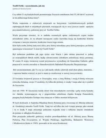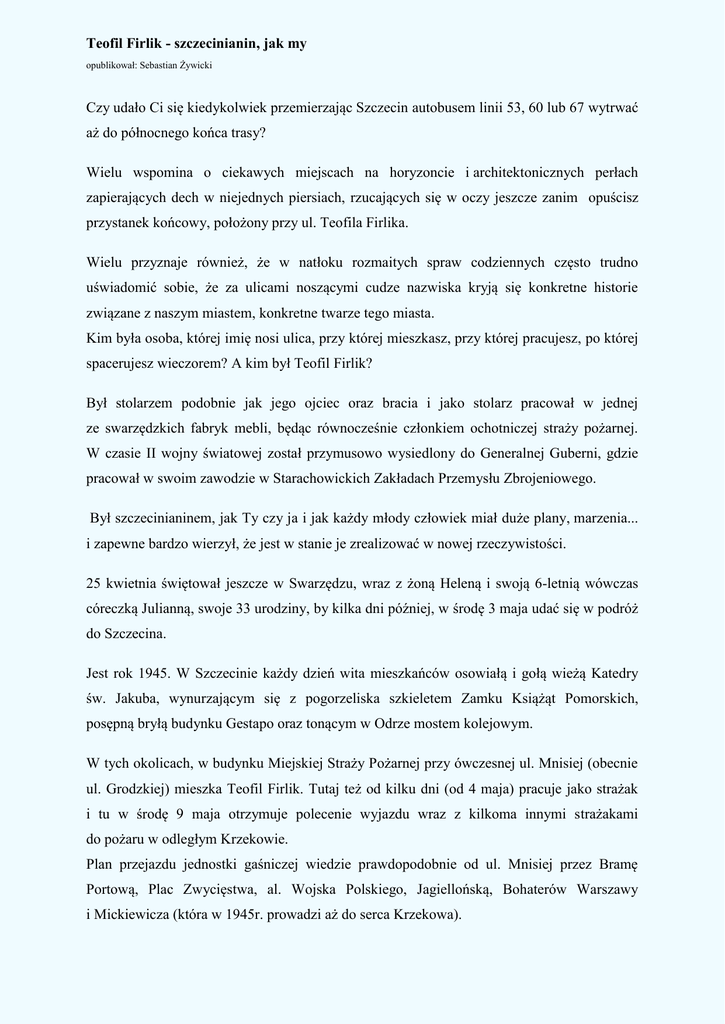 Teofil Firlik - szczecinianin, jak my opublikował: Sebastian Żywicki Czy udało Ci się kiedykolwiek przemierzając Szczecin autobusem linii 53, 60 lub 67 wytrwać aż do północnego końca trasy? Wielu wspomina o ciekawych miejscach na horyzoncie i architektonicznych perłach zapierających dech w niejednych piersiach, rzucających się w oczy jeszcze zanim opuścisz przystanek końcowy, położony przy ul. Teofila Firlika. Wielu przyznaje również, że w natłoku rozmaitych spraw codziennych często trudno uświadomić sobie, że za ulicami noszącymi cudze nazwiska kryją się konkretne historie związane z naszym miastem, konkretne twarze tego miasta. Kim była osoba, której imię nosi ulica, przy której mieszkasz, przy której pracujesz, po której spacerujesz wieczorem? A kim był Teofil Firlik? Był stolarzem podobnie jak jego ojciec oraz bracia i jako stolarz pracował w jednej ze swarzędzkich fabryk mebli, będąc równocześnie członkiem ochotniczej straży pożarnej. W czasie II wojny światowej został przymusowo wysiedlony do Generalnej Guberni, gdzie pracował w swoim zawodzie w Starachowickich Zakładach Przemysłu Zbrojeniowego. Był szczecinianinem, jak Ty czy ja i jak każdy młody człowiek miał duże plany, marzenia... i zapewne bardzo wierzył, że jest w stanie je zrealizować w nowej rzeczywistości. 25 kwietnia świętował jeszcze w Swarzędzu, wraz z żoną Heleną i swoją 6-letnią wówczas córeczką Julianną, swoje 33 urodziny, by kilka dni później, w środę 3 maja udać się w podróż do Szczecina. Jest rok 1945. W Szczecinie każdy dzień wita mieszkańców osowiałą i gołą wieżą Katedry św. Jakuba, wynurzającym się z pogorzeliska szkieletem Zamku Książąt Pomorskich, posępną bryłą budynku Gestapo oraz tonącym w Odrze mostem kolejowym. W tych okolicach, w budynku Miejskiej Straży Pożarnej przy ówczesnej ul. Mnisiej (obecnie ul. Grodzkiej) mieszka Teofil Firlik. Tutaj też od kilku dni (od 4 maja) pracuje jako strażak i tu w środę 9 maja otrzymuje polecenie wyjazdu wraz z kilkoma innymi strażakami do pożaru w odległym Krzekowie. Plan przejazdu jednostki gaśniczej wiedzie prawdopodobnie od ul. Mnisiej przez Bramę Portową, Plac Zwycięstwa, al. Wojska Polskiego, Jagiellońską, Bohaterów Warszawy i Mickiewicza (która w 1945r. prowadzi aż do serca Krzekowa). Do zdarzenia grupa ta jednak nigdy nie dojedzie ponieważ na skrzyżowaniu ulicy Jagiellońskiej z aleją Piastów w wóz strażacki wbija się z impetem rosyjska wojskowa ciężarówka, prowadzona przez nietrzeźwego rosyjskiego żołnierza, zabijając jednego ze strażaków a dwóch innych ciężko raniąc. Teofil Firlik zostaje pochowany w pośpiechu, w dwa dni później, w piątek 11 maja na przykościelnym terenie przy ul. Bogurodzicy, w tajemnicy przed najbliższymi - by całe wydarzenie nie zakłócało spokoju budowy młodej ludowej ojczyzny, powstającej na żyznym gruncie rosyjsko-polskiej przyjaźni. Tym, którzy znali Strażaka oraz wielu innym, zamiatanie pod dywan cynizmu i obojętności zwyczajnych - niczym niezawinionych - ludzkich tragedii, wydało się kolejną dotkliwą niesprawiedliwością. Ostatnia droga Teofila Firlika, stanowiła dla nich wszystkich najlepszą okazję do manifestacji swojego żywego niezadowolenia... a już kilka miesięcy później imieniem Teofila Firlika nazwano ulicę Mnisią (obecna ul. Grodzka), która nazywała się tak aż do kolejnej zmiany nazw ulic (przypadającej na lata 50`). Wówczas to, położona w centrum miasta ul. Teofila Firlika staje się ul. Grodzką, podczas gdy położona w obrębie Grabowa ul. Mosiężna zmienia nazwę na ul. Teofila Firlika. W roku 1974 dokonano ekshumacji... Teofil Firlik spoczywa dzisiaj na Cmentarzu Centralnym - kwatera 50, II rząd, m. 5. Jest Pionierem Szczecina. Jego nazwisko, na kamiennych tablicach pod pomnikiem Pionierów Szczecina, rozpoczyna długą listę osób, które w tragicznych okolicznościach straciły życie w pierwszych kilku latach życia polskiego Szczecina. W napisaniu tej historii pomogło mi odnalezienie i życzliwa rozmowa z: Panią Julianną Maciejewską z d. Firlik, córką tragicznie zmarłego Panią Danutą Andrzejewską z Urzędu Miasta i Gminy w Swarzędzu Panią Katarzyną z Komendy Wojewódzkiej Państwowej Straży Pożarnej w Szczecinie Niniejszy materiał podlega dalszemu opracowaniu dla potrzeb tworzenia skrzynki Geocaching Teofil Firlik http://www.geocaching.pl/ http://opencaching.pl/