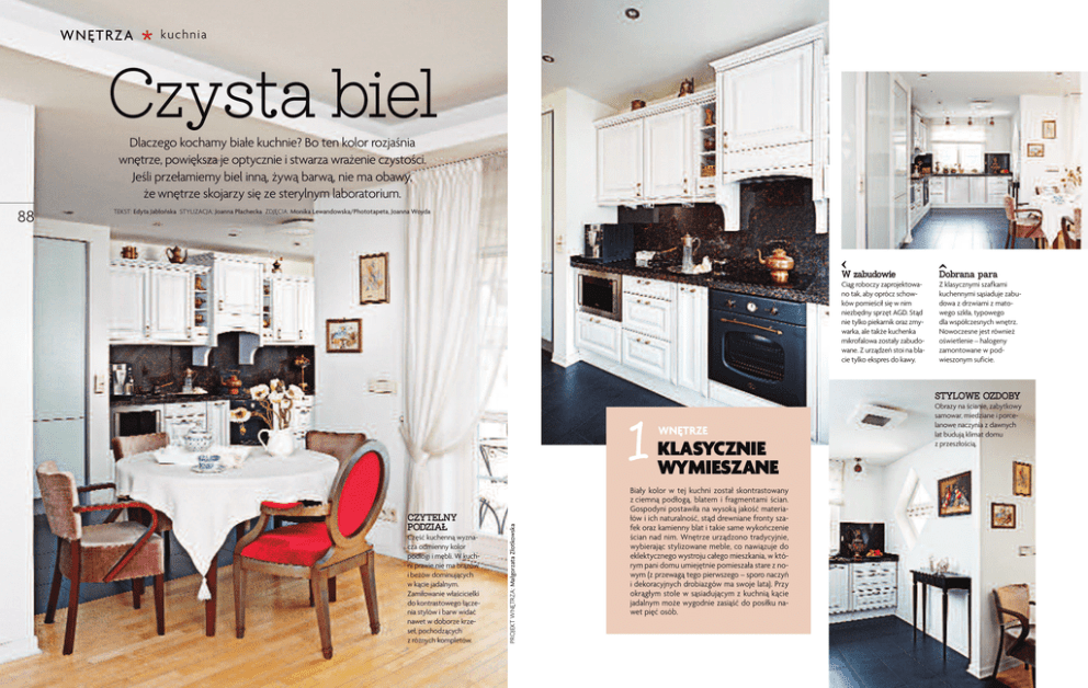 WNĘTRZA kuchnia Czysta biel Dlaczego kochamy białe kuchnie? Bo ten kolor rozjaśnia wnętrze, powiększa je optycznie i stwarza wrażenie czystości. Jeśli przełamiemy biel inną, żywą barwą, nie ma obawy, że wnętrze skojarzy się ze sterylnym laboratorium. TEKST: Edyta Jabłońska STYLIZACJA: Joanna Płachecka ZDJĘCIA: Monika Lewandowska/Phototapeta, Joanna Woyda W zabudowie Dobrana para Ciąg roboczy zaprojektowano tak, aby oprócz schowków pomieścił się w nim niezbędny sprzęt AGD. Stąd nie tylko piekarnik oraz zmywarka, ale także kuchenka mikrofalowa zostały zabudowane. Z urządzeń stoi na blacie tylko ekspres do kawy. Z klasycznymi szafkami kuchennymi sąsiaduje zabudowa z drzwiami z matowego szkła, typowego dla współczesnych wnętrz. Nowoczesne jest również oświetlenie – halogeny zamontowane w podwieszonym suficie. STYLOWE OZDOBY 1 CZYTELNY PODZIAŁ Część kuchenną wyznacza odmienny kolor podłogi i mebli. W kuchni prawie nie ma brązów i beżów dominujących w kącie jadalnym. Zamiłowanie właścicielki do kontrastowego łączenia stylów i barw widać nawet w doborze krzeseł, pochodzących z różnych kompletów. PROJEKT WNĘTRZA: Małgorzata Złotkowska 88 WNĘTRZE KLASYCZNIE WYMIESZANE Biały kolor w tej kuchni został skontrastowany z ciemną podłogą, blatem i fragmentami ścian. Gospodyni postawiła na wysoką jakość materiałów i ich naturalność, stąd drewniane fronty szafek oraz kamienny blat i takie same wykończenie ścian nad nim. Wnętrze urządzono tradycyjnie, wybierając stylizowane meble, co nawiązuje do eklektycznego wystroju całego mieszkania, w którym pani domu umiejętnie pomieszała stare z nowym (z przewagą tego pierwszego – sporo naczyń i dekoracyjnych drobiazgów ma swoje lata). Przy okrągłym stole w sąsiadującym z kuchnią kącie jadalnym może wygodnie zasiąść do posiłku nawet pięć osób. Obrazy na ścianie, zabytkowy samowar, miedziane i porcelanowe naczynia z dawnych lat budują klimat domu z przeszłością. kuchnia Pion wodno-kanalizacyjny w narożniku kuchni został zabudowany płytą gipsowo-kartonową. Z niej zrobiono również podwieszony sufit, w którym ukryto instalację wentylacyjną oraz zamontowano halogenowe oświetlenie. Z przesłoną Odcinek blatu roboczego ze zlewozmywakiem osłania niewysoka ścianka, naczynia czekające na umycie nie są więc widoczne z pokoju. Wspólnym elementem całej części dziennej jest podłoga z olejowanych desek dębowych w ciepłym jasnobrązowym odcieniu. Nastrojowo 2 Część jadalną optycznie wyznacza ścianka z wnękami na dekoracyjne drobiazgi, do której przylega stół. Nad nim wisi duża lampa z zamontowanym w abażurze dotykowym ściemniaczem – to bardzo wygodne rozwiązanie, zwłaszcza podczas romantycznych kolacji. WNĘTRZE BLASK NOWOCZESNOŚCI Po wyprowadzeniu się dorosłych dzieci rodzice postanowili przeprowadzić generalny remont mieszkania. Wyburzono ścianę między pokojem dziennym a kuchnią, wymieniono wszystkie meble. Domownicy chcieli mieć kuchnię nowoczesną i jasną; biały kolor wydał się więc najodpowiedniejszy, chociaż i w tym wnętrzu został on przełamany ciemnymi barwami – głębokim fioletem w odcieniu bakłażana oraz grafitem. Zgodnie z założeniem projektantki wybrano połyskliwe materiały wykończeniowe: fronty szafek są z lakierowanej płyty MDF, a ścianę nad blatem chronią tafle szkła. Błyszczy też sprzęt AGD, zwłaszcza okap – również szklany. Właściciele są koneserami wina i w kuchni musiało się znaleźć miejsce na przechowywanie tego trunku. Zaprojektowano więc specjalną wysoką półkę w mocnym odcieniu fioletu. czterykaty.pl Ukryte rury PROJEKT WNĘTRZA: Anna Krzystowska/Akadomo WNĘTRZA 91
