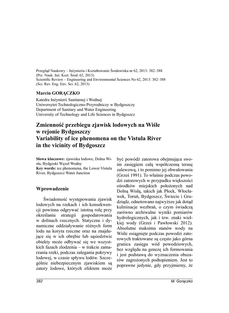 Przegląd Naukowy – Inżynieria i Kształtowanie Środowiska nr 62, 2013: 382–388 (Prz. Nauk. Inż. Kszt. Środ. 62, 2013) Scientific Review – Engineering and Environmental Sciences No 62, 2013: 382–388 (Sci. Rev. Eng. Env. Sci. 62, 2013) Marcin GORĄCZKO Katedra Inżynierii Sanitarnej i Wodnej Uniwersytet Technologiczno-Przyrodniczy w Bydgoszczy Department of Sanitary and Water Engineering University of Technology and Life Sciences in Bydgoszcz Zmienność przebiegu zjawisk lodowych na Wiśle w rejonie Bydgoszczy Variability of ice phenomena on the Vistula River in the vicinity of Bydgoszcz Słowa kluczowe: zjawiska lodowe, Dolna Wisła, Bydgoski Węzeł Wodny Key words: ice phenomena, the Lower Vistula River, Bydgoszcz Water Junction Wprowadzenie Świadomość występowania zjawisk lodowych na rzekach i ich konsekwencji powinna odgrywać istotną rolę przy określaniu strategii gospodarowania w dolinach rzecznych. Statyczne i dynamiczne oddziaływanie różnych form lodu na koryta rzeczne oraz na znajdujące się w ich obrębie lub sąsiedztwie obiekty może odbywać się we wszystkich fazach zlodzenia – w trakcie zamarzania rzeki, podczas zalegania pokrywy lodowej, w czasie spływu lodów. Szczególnie niebezpiecznym zjawiskiem są zatory lodowe, których efektem może 382 być powódź zatorowa obejmująca swoim zasięgiem całą współczesną terasę zalewową, i to pomimo jej obwałowania (Grześ 1991). To właśnie podczas powodzi zatorowych w przypadku większości ośrodków miejskich położonych nad Dolną Wisłą, takich jak Płock, Włocławek, Toruń, Bydgoszcz, Świecie i Grudziądz, odnotowano najwyższe jak dotąd kulminacje wezbrań, o czym świadczą zarówno archiwalne wyniki pomiarów hydrologicznych, jak i tzw. znaki wielkiej wody (Grześ i Pawłowski 2012). Absolutne maksima stanów wody na Wiśle osiągnięte podczas powodzi zatorowych traktowane są często jako górna granica zasięgu wód powodziowych, bez względu na genezę ich formowania i jest podstawą do wyznaczenia obszarów zagrożonych podtopieniem. Jest to poprawne jedynie, gdy przyjmiemy, że M. Gorączko w rozpatrywanej zlewni nie doszło do istotnych zmian warunków formowania się zjawisk lodowych spowodowanych czynnikami naturalnymi oraz antropogenicznymi. Celem badań było określenie w jaki sposób współcześnie kształtuje się dynamika przebiegu zjawisk lodowych na Dolnej Wiśle w rejonie Bydgoszczy, a także ustalenie, czy podlegała ona wieloletnim zmianom ilościowym. Materiał i metodyka badań W pracy wykorzystano wyniki codziennych obserwacji zjawisk lodowych na Wiśle, wykonywanych na posterunku wodowskazowym Bydgoszcz-Fordon przez państwową służbę hydrologiczno-meteorologiczną (PIHM, IMGW, IMGW PIB) w okresie od 20 listopada 1946 do 8 maja 2012 roku (łącznie 66 sezonów obserwacyjnych). Przekrój wodowskazowy położony jest w 775 km biegu Wisły. Znajduje się on poniżej miejsca, w którym rzeka opuszczając Pradolinę Toruńsko-Eberswaldzką, wpływa do makroregionu Doliny Dolnej Wisły, gwałtownie zmieniając kierunek płynięcia z północno-zachodniego na północno-wschodni. Obserwacje zjawisk lodowych, prowadzone podczas terminowych obserwacji stanów wody (Pasławski 1973), obejmowały zlodzenie częściowe (śryż, lód brzegowy), całkowite (pokrywę lodową), krę oraz zatory. Ustalenie tendencji zmian przebiegu zjawisk lodowych na Wiśle w rejonie Bydgoszczy w rozpatrywanym wieloleciu nastąpiło poprzez zestawienie terminów występowania określonych form zlodzenia w poszczególnych sezonach zimowych, tzn. dat początku i zakończe- nia wszystkich zjawisk lodowych oraz czasu ich trwania. Wyniki badań Analizowane wielolecie 1947–2012 podzielono na dwa okresy, rozgraniczone przez 1970 rok, w którym zakończono budowę stopnia wodnego we Włocławku obiektu, który w istotnym stopniu zaburzył naturalny reżim hydrologiczny Wisły w jej dolnym biegu. W latach 1947–1970 zjawiska lodowe na Wiśle, w rejonie Bydgoszczy, pojawiały się co roku, przeciętnie od 15 grudnia, a zanikały 19 marca, trwając średnio 83 dni (tab. 1). Najwcześniej wystąpiły one w sezonie zimowym 1956/1957, bo już 11 listopada. Z kolei pięć lat wcześniej zanotowano je po raz pierwszy dopiero 20 stycznia. Najwięcej dni ze zjawiskami lodowymi wystąpiło w sezonie 1963/1964, aż 123 (rys. 1). Średni czas utrzymywania się pokrywy lodowej wyniósł 43 dni, przy czym przeciętnie do jej utworzenia dochodziło na początku stycznia, a ruszenie lodów następowało w trzeciej dekadzie lutego. W rekordowym pod tym względem 1947 roku Wisła była nieprzerwanie zlodzona przez blisko trzy miesiące (rys. 2). W ciągu jedenastu sezonów zimowych faza całkowitego zlodzenia rzeki nie wystąpiła w ogóle, co oznacza brak pokrywy lodowej w przybliżeniu raz na dwa lata. Wyraźnie dominującymi formami zlodzenia po 1970 roku na rozpatrywanym odcinku Wisły w fazie zamarzania stały się śryż i lód brzegowy. Pełen cykl zlodzenia rzeki, obejmujący wykształcenie i utrzymanie pokrywy lodowej, Zmienność przebiegu zjawisk lodowych na Wiśle w rejonie Bydgoszczy 383 TABELA 1. Charakterystyka zjawisk lodowych w analizowanych okresach TABLE 1. Characteristic of ice phenomena in analyzed periods 1946/1947–1969/1970 Wyszczególnienie/ /Specification Najwcześniej/ /Earliest Najpóźniej/ /Latest 1970/1971–2011/2012 Przeciętnie/ /Average Najwcześniej/ /Earliest Najpóźniej/ Przeciętnie/ /Latest /Average Zjawiska lodowe/Ice phenomena Data początku/ /Start Date Data końca/ /End Date 28.01 15.11 (1987/1988, (1993/1994) 2011/2012) 18.12 28.03 (1988/1989) (1995/1996) 11.11 23.01 (1956/1957) (1951/1952) 15.12 20.02 4.04 (1960/1961) (1963/1964) 19.03 Czas trwania/ 34 dni 123 dni /Duration (1960/1961) (1963/1964) 83 dni 3 dni 115 dni (2006/2007) (2005/2006) 20.12 21.02 44 dni Pokrywa lodowa/Ice cover Data początku/ /Start Date 20.11 (1965/1966) 1.02 1955/1956) 4.01 30.12 5.02