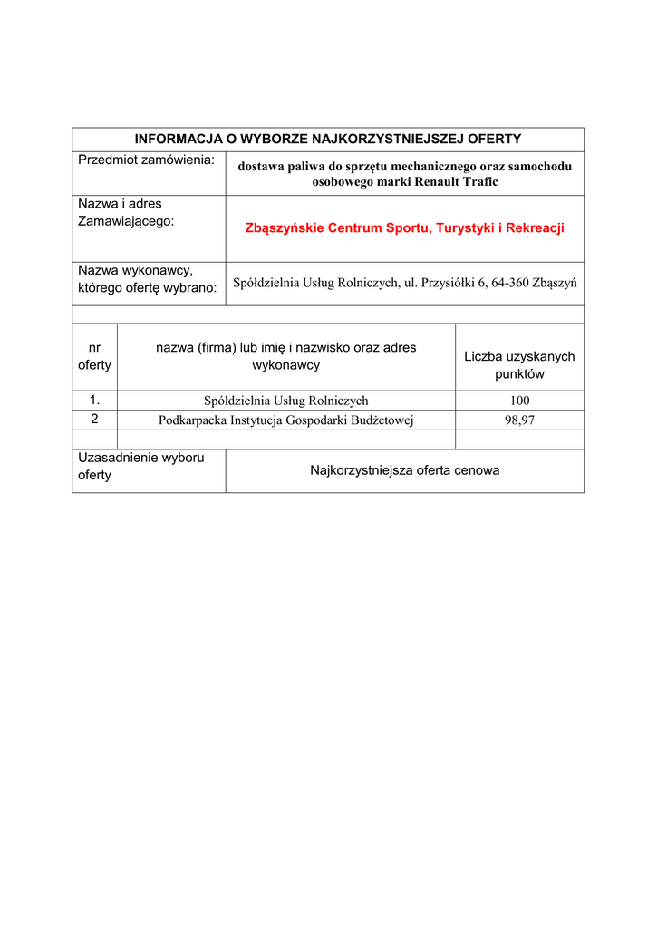 INFORMACJA O WYBORZE NAJKORZYSTNIEJSZEJ OFERTY Przedmiot zamówienia: Nazwa i adres Zamawiającego: Nazwa wykonawcy, którego ofertę wybrano: dostawa paliwa do sprzętu mechanicznego oraz samochodu osobowego marki Renault Trafic Zbąszyńskie Centrum Sportu, Turystyki i Rekreacji Spółdzielnia Usług Rolniczych, ul. Przysiółki 6, 64-360 Zbąszyń nr oferty nazwa (firma) lub imię i nazwisko oraz adres wykonawcy 1. 2 Spółdzielnia Usług Rolniczych Podkarpacka Instytucja Gospodarki Budżetowej Uzasadnienie wyboru oferty Liczba uzyskanych punktów Najkorzystniejsza oferta cenowa 100 98,97