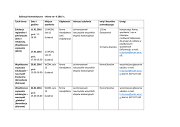 Edukacja humanistyczna ‐ oferta na I‐II 2016 r.: Tytuł formy Data i godzina Miejsce spotkania Odpłatność Adresaci szkolenia Imię i Nazwisko prowadzącego Uwagi Edukacja regionalna i patriotyczna dzieci i młodzieży. Współczesne wyzwania (HST4) 11.01.2016 1/ WCDN, sala 11 zainteresowani forma nieodpłatna nauczyciele wszystkich etapów edukacyjnych (sieć współpracy) 1/ Ewa Skrzywanek kontynuacja formy, spotkania 1 raz w miesiącu; możliwość dołączenia do grupy lub udziału w pojedynczych spotkaniach (informacje: e‐mail: [email protected]. pl); godz. 17‐ 18.30 (I piętro) 2/ Hanna Staniów 17.02.2016 2/ WCDN, sala 11 godz. 17.00‐18.30 (I piętro) Współczesne wyzwania edukacyjne – nauczyciel kreatywny (konsultacje zbiorowe) 20.01.2016 Współczesne wyzwania edukacyjne – nauczyciel „globalny” (konsultacje zbiorowe) 24.02.2016 WCDN, sala 12 godz. 15.00‐18.00 (I piętro) forma zainteresowani nieodpłatna nauczyciele wszystkich etapów edukacyjnych Hanna Staniów wcześniejsze zgłoszenie udziału: e‐mail: [email protected]. pl lub tel. 607 327 410 forma zainteresowani nieodpłatna nauczyciele wszystkich etapów edukacyjnych Hanna Staniów wcześniejsze zgłoszenie udziału: e‐mail: [email protected]. pl lub tel. 607 327 410 WCDN, sala 12 godz. 15.00‐18.00 (I piętro) JST4 12.01.16 WCDN eTwinning‐ współpraca europejska przez Internet godz. Sala 11, 16.00 – 19.15 I piętro (informator Bezpłatne warsztaty nauczyciele każdej specjalności Joanna Stefańska Bezpłatne warsztaty nauczyciele języków obcych na II etapie edukacyjnym Joanna Stefańska Bezpłatne warsztaty nauczyciele każdej specjalności Joanna Stefańska (4h) s.214) JST5 14.01.16 WCDN Jak przygotować ucznia do sprawdzianu szóstoklasisty z języka obcego godz. Sala 1, 15.00 – 19.00 I piętro (5h) JST4 23.02.16 WCDN eTwinning‐ współpraca europejska przez Internet godz. Sala 11, 16.00 – 19.15 I piętro (informator s.214) (4h) Zacznij z hukiem‐ sposoby na dobry początek lekcji bezpłatna 11.01.2016 SP nr 107 godz.16.30 ul. Prusa 64 Nauczyciele j. polskiego Agata Wodzińska Zgłoszenie elektroniczne na adres [email protected] oc.pl Analiza tekstów kultury 11 stycznia godz.15.00‐ 18.00 WCDN bezpłatna Nauczyciele języka polskiego Bożena Święch, Ewa Obara Grączwska Maturalne wymagania dotyczące nauki o języku 27 stycznia godz. 15‐ 18.00 WCDN bezpłatna Nauczyciele języka polskiego IV etapu edukacji Bożena Święch, Ewa Obara Grączwska bezpłatnie 19 stycznia Szkoła Konsultacje 2016 Podstawowa dla nauczycieli w Godz. 11.00 Nr 68 ul. ramach Szczęśliwa projektu 28 „Czytajmy razem”‐ nowe działania, nowe pomysły Nauczyciele SP: Lidia Zyga 74,95,64,107,9,68,85,ZSP 13, ZSP 3 Konsultacje zbiorowe dla nauczycieli Nauczyciele bibliotekarze 28 stycznia 2016 r. WCDN sala 12 bezpłatnie Lidia Zyga Proszę o zgłoszenia meilowe [email protected] do 25 bibliotekarzy – projekt MEN „ Narodowy Program Rozwoju Czytelnictwa ” Godz. 12.00 I piętro Konferencja dla Liderów akcji „Cały Wrocław czyta” 26 stycznia 2016 r. Warsztaty: „Bibliotekarz e szkolni promują czytelnictwo” 20 godzin Doskonalenie warsztatu pracy w oparciu o sześć podstawowy ch zasad właściwego nauczania Gimnazjum stycznia 2016 bezpłatnie Lidia Zyga, Liderzy akcji, inni nauczyciele Małgorzata zainteresowani promocją Olewińska‐ Syta czytelnictwa 200 zł od uczestnika Nauczyciele bibliotekarze, inni zainteresowani nauczyciele Lidia Zyga Proszę o zgłoszenia meilowe na adres [email protected] do 22 lutego 2016 r. bezpłatna Nauczyciele języka polskiego w gimnazjach Elżbieta Kielman zgłoszenia: [email protected]. pl Nr 18 , ul. Godz. 13.00 Kłodnicka 36 25 luty 2016 Gimnazjum 12.01.2016 r. WCDN Nr 18, ul. Godz.13.00 Kłodnicka 36 godz. 16:00 – 19:00 Rekomendowane tematy rad pedagogicznych na styczeń‐luty 2016. Tytuł rady pedagogicznej Ilość godzin Coaching czytelniczy, czyli metody na promocję 3 czytelnictwa „ Gry i zabawy czytelnicze początkiem podróży 3 w krainę wyobraźni” Adresaci szkolenia Nazwisko prowadzącego Szkoły i przedszkola Wrocławia Lidia Zyga, Małgorzata Olewińska‐ Syta Lidia Zyga, Małgorzata Olewińska‐ Syta Szkoły i przedszkola Wrocławia Uwagi