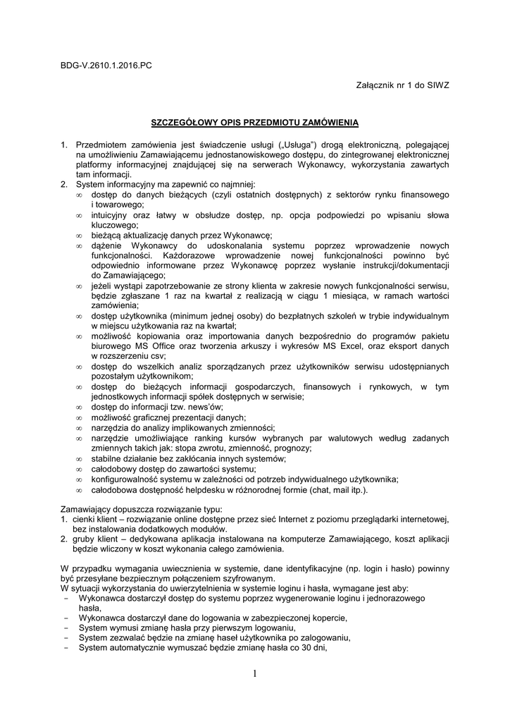 BDG-V.2610.1.2016.PC Załącznik nr 1 do SIWZ SZCZEGÓŁOWY OPIS PRZEDMIOTU ZAMÓWIENIA 1. Przedmiotem zamówienia jest świadczenie usługi („Usługa”) drogą elektroniczną, polegającej na umożliwieniu Zamawiającemu jednostanowiskowego dostępu, do zintegrowanej elektronicznej platformy informacyjnej znajdującej się na serwerach Wykonawcy, wykorzystania zawartych tam informacji. 2. System informacyjny ma zapewnić co najmniej: • dostęp do danych bieżących (czyli ostatnich dostępnych) z sektorów rynku finansowego i towarowego; • intuicyjny oraz łatwy w obsłudze dostęp, np. opcja podpowiedzi po wpisaniu słowa kluczowego; • bieżącą aktualizację danych przez Wykonawcę; • dążenie Wykonawcy do udoskonalania systemu poprzez wprowadzenie nowych funkcjonalności. Każdorazowe wprowadzenie nowej funkcjonalności powinno być odpowiednio informowane przez Wykonawcę poprzez wysłanie instrukcji/dokumentacji do Zamawiającego; • jeżeli wystąpi zapotrzebowanie ze strony klienta w zakresie nowych funkcjonalności serwisu, będzie zgłaszane 1 raz na kwartał z realizacją w ciągu 1 miesiąca, w ramach wartości zamówienia; • dostęp użytkownika (minimum jednej osoby) do bezpłatnych szkoleń w trybie indywidualnym w miejscu użytkowania raz na kwartał; • możliwość kopiowania oraz importowania danych bezpośrednio do programów pakietu biurowego MS Office oraz tworzenia arkuszy i wykresów MS Excel, oraz eksport danych w rozszerzeniu csv; • dostęp do wszelkich analiz sporządzanych przez użytkowników serwisu udostępnianych pozostałym użytkownikom; • dostęp do bieżących informacji gospodarczych, finansowych i rynkowych, w tym jednostkowych informacji spółek dostępnych w serwisie; • dostęp do informacji tzw. news’ów; • możliwość graficznej prezentacji danych; • narzędzia do analizy implikowanych zmienności; • narzędzie umożliwiające ranking kursów wybranych par walutowych według zadanych zmiennych takich jak: stopa zwrotu, zmienność, prognozy; • stabilne działanie bez zakłócania innych systemów; • całodobowy dostęp do zawartości systemu; • konfigurowalność systemu w zależności od potrzeb indywidualnego użytkownika; • całodobowa dostępność helpdesku w różnorodnej formie (chat, mail itp.). Zamawiający dopuszcza rozwiązanie typu: 1. cienki klient – rozwiązanie online dostępne przez sieć Internet z poziomu przeglądarki internetowej, bez instalowania dodatkowych modułów. 2. gruby klient – dedykowana aplikacja instalowana na komputerze Zamawiającego, koszt aplikacji będzie wliczony w koszt wykonania całego zamówienia. W przypadku wymagania uwiecznienia w systemie, dane identyfikacyjne (np. login i hasło) powinny być przesyłane bezpiecznym połączeniem szyfrowanym. W sytuacji wykorzystania do uwierzytelnienia w systemie loginu i hasła, wymagane jest aby: - Wykonawca dostarczył dostęp do systemu poprzez wygenerowanie loginu i jednorazowego hasła, - Wykonawca dostarczył dane do logowania w zabezpieczonej kopercie, - System wymusi zmianę hasła przy pierwszym logowaniu, - System zezwalać będzie na zmianę haseł użytkownika po zalogowaniu, - System automatycznie wymuszać będzie zmianę hasła co 30 dni, 1 - Wykonawca zapewnił warunki dotyczące złożoności haseł (tj. 8 znaków, cyfry 0-9, znak specjalny, małe i duże litery). Wykonawca za przedstawienie poszerzonego zakresu historycznego danych zawartych w serwisie oraz prognoz otrzyma dodatkową punktację zgodnie z kryterium jakości danych. Zamawiający wymaga, aby Wykonawca wraz z dostarczeniem oferty udostępnił hasło dostępu do zintegrowanej elektronicznej platformy informacyjnej na okres od terminu złożenia oferty do dnia ogłoszenia o wyborze najkorzystniejszej oferty, w celu weryfikacji zgodności oferty z warunkami przetargu i oceny jakości określonych danych. 3. Zamawiający przewiduje możliwość udzielenia zamówienia, o którym mowa w art. 67 ust. 1 pkt 6 ustawy, o wartości do 146.315,12,00 zł brutto. Zamówienie to będzie polegało na powtórzeniu usług, o których mowa w Szczegółowym Opisie Przedmiotu Zamówienia (Załączniku nr 1 do SIWZ). 2