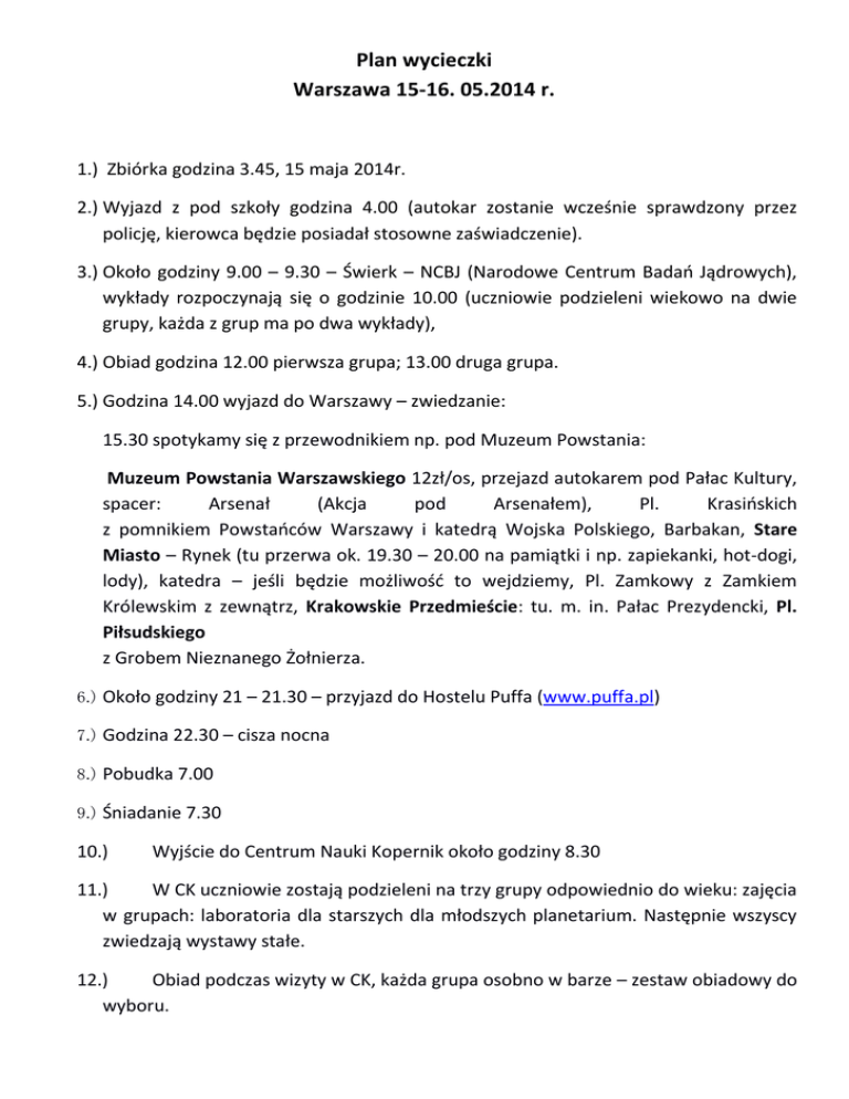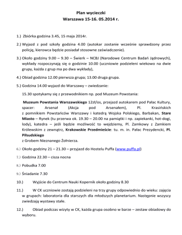 Plan wycieczki Warszawa 15-16. 05.2014 r. 1.) Zbiórka godzina 3.45, 15 maja 2014r. 2.) Wyjazd z pod szkoły godzina 4.00 (autokar zostanie wcześnie sprawdzony przez policję, kierowca będzie posiadał stosowne zaświadczenie). 3.) Około godziny 9.00 – 9.30 – Świerk – NCBJ (Narodowe Centrum Badań Jądrowych), wykłady rozpoczynają się o godzinie 10.00 (uczniowie podzieleni wiekowo na dwie grupy, każda z grup ma po dwa wykłady), 4.) Obiad godzina 12.00 pierwsza grupa; 13.00 druga grupa. 5.) Godzina 14.00 wyjazd do Warszawy – zwiedzanie: 15.30 spotykamy się z przewodnikiem np. pod Muzeum Powstania: Muzeum Powstania Warszawskiego 12zł/os, przejazd autokarem pod Pałac Kultury, spacer: Arsenał (Akcja pod Arsenałem), Pl. Krasińskich z pomnikiem Powstańców Warszawy i katedrą Wojska Polskiego, Barbakan, Stare Miasto – Rynek (tu przerwa ok. 19.30 – 20.00 na pamiątki i np. zapiekanki, hot-dogi, lody), katedra – jeśli będzie możliwość to wejdziemy, Pl. Zamkowy z Zamkiem Królewskim z zewnątrz, Krakowskie Przedmieście: tu. m. in. Pałac Prezydencki, Pl. Piłsudskiego z Grobem Nieznanego Żołnierza. 6.) Około godziny 21 – 21.30 – przyjazd do Hostelu Puffa (www.puffa.pl) 7.) Godzina 22.30 – cisza nocna 8.) Pobudka 7.00 9.) Śniadanie 7.30 10.) Wyjście do Centrum Nauki Kopernik około godziny 8.30 11.) W CK uczniowie zostają podzieleni na trzy grupy odpowiednio do wieku: zajęcia w grupach: laboratoria dla starszych dla młodszych planetarium. Następnie wszyscy zwiedzają wystawy stałe. 12.) Obiad podczas wizyty w CK, każda grupa osobno w barze – zestaw obiadowy do wyboru. 13.) Około godziny 15 – 15.30 wyjazd z pod CK Godzina 16.00 – 16.30 spotkanie z przewodnikiem dalszy ciąg zwiedzania Warszawy: Powązki Wojskowe: tu m. in. pomnik ofiar katastrofy smoleńskiej, aleja zasłużonych, groby Szarych Szeregów Sejm z zewnątrz, przejazd autokarem pod Park Łazienkowski Łazienki Królewskie + wnętrza Pałacu na Wyspie (bezpłatnie 19.00-20.00), Belweder z zewnątrz 14.) Wyjazd do domu około godziny 19.30, 15.) Przyjazd pod szkołę w Palikówce około 24.30 Plan wycieczki może ulec zmianie ze względu na np. korki w Warszawie, nieprzewidziane okoliczności.