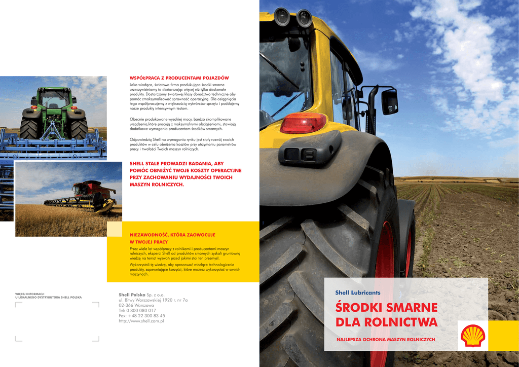 WSPÓŁPRACA Z PRODUCENTAMI POJAZDÓW Jako wiodąca, światowa firma produkująca środki smarne urzeczywistniamy to dostarczając więcej niż tylko doskonałe produkty. Dostarczamy światowej klasy doradztwo techniczne aby pomóc zmaksymalizować sprawność operacyjną. Dla osiągnięcia tego współpracujemy z większością wytwórców sprzętu i poddajemy nasze produkty intensywnym testom. Obecnie produkowane wysokiej mocy, bardzo skomplikowane urządzenia,które pracują z maksymalnymi obciążeniami, stawiają dodatkowe wymagania producentom środków smarnych. Odpowiedzią Shell na wymagania rynku jest stały rozwój swoich produktów w celu obniżenia kosztów przy utrzymaniu parametrów pracy i trwałości Twoich maszyn rolniczych. SHELL STALE PROWADZI BADANIA, ABY POMÓC OBNIŻYĆ TWOJE KOSZTY OPERACYJNE PRZY ZACHOWANIU WYDAJNOŚCI TWOICH MASZYN ROLNICZYCH. NIEZAWODNOŚĆ, KTÓRA ZAOWOCUJE W TWOJEJ PRACY Przez wiele lat współpracy z rolnikami i producentami maszyn rolniczych, eksperci Shell od produktów smarnych zyskali gruntowną wiedzę na temat wyzwań przed jakimi stoi ten przemysł. Wykorzystali tę wiedzę, aby opracować wiodące technologicznie produkty, zapewniające korzyści, które możesz wykorzystać w swoich maszynach. WIĘCEJ INFORMACJI U LOKALNEGO DYSTRYBUTORA SHELL POLSKA Shell Polska Sp. z o.o. ul. Bitwy Warszawskiej 1920 r. nr 7a 02-366 Warszawa Tel: 0 800 080 017 Fax: +48 22 300 83 45 http://www.shell.com.pl Shell Lubricants ŚRODKI SMARNE DLA ROLNICTWA NAJLEPSZA OCHRONA MASZYN ROLNICZYCH PRZEWODNIK PO PRODUKTACH TECHNOLOGIA, KTÓRA PRACUJE DLA CIEBIE Technologia opracowana przez Shell w celu dostarczenia korzyści, które dają rozwiązanie dla takich wyzwań jak oszczędność energii i długotrwała praca środka smarnego bez utraty parametrów. To wymaga znacznych inwestycji każdego roku w badania i rozwój nowych produktów smarnych w nowoczesnych laboratoriach w Europie, Ameryce Północnej i Azji. Wszystkie produkty Shell przechodzą rygorystyczne badania, jak również są rozwijane w ścisłej współpracy pomiędzy Shell, a producentami pojazdów, w celu uzyskania aprobat lub aby jak najlepiej spełniały te wymagania. Korzyści ze stosowania środków smarnych Shell są potwierdzane w pracujących pojazdach na całym świecie. OD OLEJÓW DO SILNIKÓW O DUŻEJ MOCY PO SPECJALISTYCZNE OLEJE DO PODZESPOŁÓW NAPĘDOWYCH - SHELL OFERUJE SZEROKĄ OFERTĘ INNOWACYJNYCH PRODUKTÓW, WSPIERANYCH PRZEZ MIĘDZYNARODOWYCH EKSPERTÓW. OLEJE DO SILNIKÓW DIESLA OLEJE PRZEKŁADNIOWOHYDRAULICZNE (UTTO) PROFESJONALNE Shell Rimula R5 LE Shell Spirax S6 TXME SYNTETYCZNE SYNTETYCZNE PREMIUM Shell Rimula R4 X OLEJE UNIWERSALNE (STOU)* OLEJE DO PRZEKŁADNI I OSI DLA KOMBAJNÓW Shell Spirax S4 TX Shell Spirax S3 AX OLEJ HYDRAULICZNY DO KOMBAJNÓW SMARY Shell Rimula R4 L LINIA GŁÓWNA Aby zapewnić sobie rentowność pracy maszyn rolniczych, musisz polegać na nowoczesnych, zaawansowanych maszynach, a te wymagają stosowania wysokiej jakości środków smarnych o wyjątkowych parametrach. Musisz zabezpieczyć wysokowydajne maszyny, w każdych warunkach i przy maksymalnych obciążeniach. Rozumiemy potrzebę zapewnienia niezawodności, zwłaszcza w czasie największego nasilenia wiosennych prac polowych i w czasie żniw. Począwszy od olejów do bardzo obciążonych silników aż do olejów do zwolnic, Shell dostarcza szeroką gamę nowoczesnych produktów i usług wspieranych przez międzynarodowych ekspertów. Nasze środki smarne stosowane w okresie gwarancyjnym zapewniają pełne bezpieczeństwo dlatego, że spełniają specyfikacje i normy producentów maszyn i pozwalają na bezawaryjne wydłużenie czasu eksploatacji maszyn, obniżenie kosztów napraw i przeglądów oraz emisji gazów, a co najważniejsze stałą gotowość do pracy, co jest podstawą do uzyskania maksymalnej wydajności i zysku. CORAZ LEPSZE ZABEZPIECZENIE OPRACOWANE ABY PODNIEŚĆ ZYSKOWNOŚĆ Shell Spirax S4 TXM Wielofunkcyjny Shell Gadus S3 V220C; Shell Spirax S3 ALS 80W90 Shell Spirax S2 TQ Shell Spirax S3 T Shell Spirax S2 ALS Shell Tellus S2 V Wielofunkcyjny Shell Gadus S2 V220AC Shell Gadus S2 V220 Sworznie i łożyska Shell Gadus S2 V220AD *Olej silnikowy klasy API CF-4 ZABEZPIECZENIE SILNIKA PEŁNA OFERTA SHELL Oleje Shell Rimula do silników diesla zapewniają zabezpieczenie w trzech krytycznych obszarach, które najbardziej obciążają urządzenie. Shell oferuję pełną gamę produktów, które zostały opracowane tak, aby w prosty sposób wybrać odpowiedni środek smarny dla Twojego urządzenia, w tym: ■■ olej do silników Diesla dużej mocy; ■■ olej przekładniowo-hydrauliczny (UTTO); ■■ uniwersalny olej do ciągników (STOU); ■■ oleje przekładniowe i do osi napędowych; ■■ oleje hydrauliczne; ■■ smary. Zużycie mechaniczne. Jeśli olej silnikowy nie jest w stanie zabezpieczyć ruchomych części przed zwiększonym tarciem, może to doprowadzić do przegrzania i zużycia. Cząsteczki o własnościach przeciwzużyciowych, które znajdują się w oleju Shell Rimula tworzą film smarny w najbardziej obciążonych punktach, co chroni powierzchnię metalową przed nadmiernym tarciem i w ten sposób przed zużyciem. Osady. Nadmierne osady na tłoku mogą przyczyniać się do zużycia cylindrów i zakleszczenia tłoka. Obniżenie sprawności silnika powoduje zwiększenie zużycia oleju. Aktywne cząsteczki oleju Shell Rimula zrywają wiązania między cząsteczkami i w ten sposób zabezpieczają przed powstaniem osadów. Korozja. Kwaśne związki, które tworzą się w trakcie spalania oleju napędowego mogą przedostać się do oleju i powodować korozję łożysk, co w konsekwencji powoduje uszkodzenie silnika. Oleje Shell Rimula zawierają wysokowydajne związki neutralizujące, które zabezpieczają silnik przed działaniem kwasów. NAJWYŻSZEJ JAKOŚCI USŁUGI Usługa monitorowania stanu oleju Shell LubeAnalyst jest również oferowana jako metoda do o