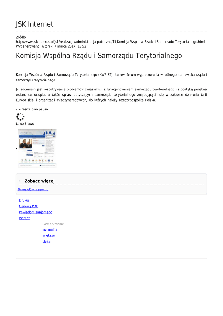 JSK Internet Źródło: http://www.jskinternet.pl/jsk/realizacje/administracja-publiczna/41,Komisja-Wspolna-Rzadu-i-Samorzadu-Terytorialnego.html Wygenerowano: Wtorek, 7 marca 2017, 13:52 Komisja Wspólna Rządu i Samorządu Terytorialnego Komisja Wspólna Rządu i Samorządu Terytorialnego (KWRiST) stanowi forum wypracowania wspólnego stanowiska rządu i samorządu terytorialnego. Jej zadaniem jest rozpatrywanie problemów związanych z funkcjonowaniem samorządu terytorialnego i z polityką państwa wobec samorządu, a także spraw dotyczących samorządu terytorialnego znajdujących się w zakresie działania Unii Europejskiej i organizacji międzynarodowych, do których należy Rzeczypospolita Polska. « » resize play pauza Lewo Prawo ● Zobacz więcej Strona główna serwisu Drukuj Generuj PDF Powiadom znajomego Wstecz Rozmiar czcionki: normalna większa duża