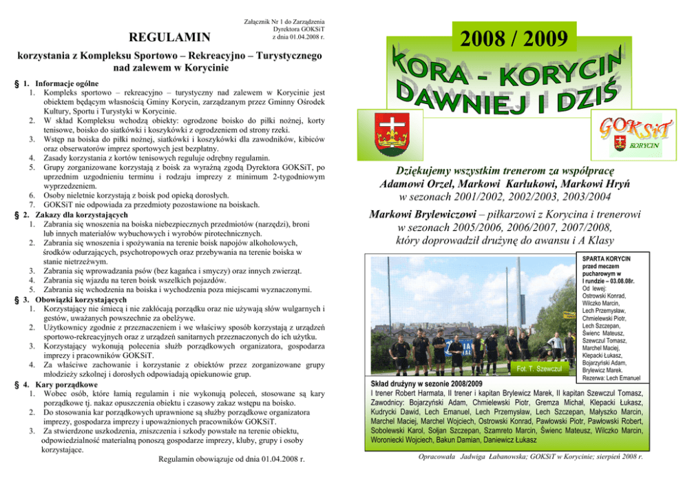REGULAMIN Załącznik Nr 1 do Zarządzenia Dyrektora GOKSiT z dnia 01.04.2008 r. 2008 / 2009 korzystania z Kompleksu Sportowo – Rekreacyjno – Turystycznego nad zalewem w Korycinie § 1. Informacje ogólne 1. Kompleks sportowo – rekreacyjno – turystyczny nad zalewem w Korycinie jest obiektem będącym własnością Gminy Korycin, zarządzanym przez Gminny Ośrodek Kultury, Sportu i Turystyki w Korycinie. 2. W skład Kompleksu wchodzą obiekty: ogrodzone boisko do piłki noŜnej, korty tenisowe, boisko do siatkówki i koszykówki z ogrodzeniem od strony rzeki. 3. Wstęp na boiska do piłki noŜnej, siatkówki i koszykówki dla zawodników, kibiców oraz obserwatorów imprez sportowych jest bezpłatny. 4. Zasady korzystania z kortów tenisowych reguluje odrębny regulamin. 5. Grupy zorganizowane korzystają z boisk za wyraźną zgodą Dyrektora GOKSiT, po uprzednim uzgodnieniu terminu i rodzaju imprezy z minimum 2-tygodniowym wyprzedzeniem. 6. Osoby nieletnie korzystają z boisk pod opieką dorosłych. 7. GOKSiT nie odpowiada za przedmioty pozostawione na boiskach. § 2. Zakazy dla korzystających 1. Zabrania się wnoszenia na boiska niebezpiecznych przedmiotów (narzędzi), broni lub innych materiałów wybuchowych i wyrobów pirotechnicznych. 2. Zabrania się wnoszenia i spoŜywania na terenie boisk napojów alkoholowych, środków odurzających, psychotropowych oraz przebywania na terenie boiska w stanie nietrzeźwym. 3. Zabrania się wprowadzania psów (bez kagańca i smyczy) oraz innych zwierząt. 4. Zabrania się wjazdu na teren boisk wszelkich pojazdów. 5. Zabrania się wchodzenia na boiska i wychodzenia poza miejscami wyznaczonymi. § 3. Obowiązki korzystających 1. Korzystający nie śmiecą i nie zakłócają porządku oraz nie uŜywają słów wulgarnych i gestów, uwaŜanych powszechnie za obelŜywe. 2. UŜytkownicy zgodnie z przeznaczeniem i we właściwy sposób korzystają z urządzeń sportowo-rekreacyjnych oraz z urządzeń sanitarnych przeznaczonych do ich uŜytku. 3. Korzystający wykonują polecenia słuŜb porządkowych organizatora, gospodarza imprezy i pracowników GOKSiT. 4. Za właściwe zachowanie i korzystanie z obiektów przez zorganizowane grupy młodzieŜy szkolnej i dorosłych odpowiadają opiekunowie grup. § 4. Kary porządkowe 1. Wobec osób, które łamią regulamin i nie wykonują poleceń, stosowane są kary porządkowe tj. nakaz opuszczenia obiektu i czasowy zakaz wstępu na boisko. 2. Do stosowania kar porządkowych uprawnione są słuŜby porządkowe organizatora imprezy, gospodarza imprezy i upowaŜnionych pracowników GOKSiT. 3. Za stwierdzone uszkodzenia, zniszczenia i szkody powstałe na terenie obiektu, odpowiedzialność materialną ponoszą gospodarze imprezy, kluby, grupy i osoby korzystające. Regulamin obowiązuje od dnia 01.04.2008 r. Dziękujemy wszystkim trenerom za współpracę Adamowi Orzel, Markowi Karłukowi, Markowi Hryń w sezonach 2001/2002, 2002/2003, 2003/2004 Markowi Brylewiczowi – piłkarzowi z Korycina i trenerowi w sezonach 2005/2006, 2006/2007, 2007/2008, który doprowadził druŜynę do awansu i A Klasy Fot. T. Szewczul SPARTA KORYCIN przed meczem pucharowym w I rundzie – 03.08.08r. Od lewej: Ostrowski Konrad, Wilczko Marcin, Lech Przemysław, Chmielewski Piotr, Lech Szczepan, Świenc Mateusz, Szewczul Tomasz, Marchel Maciej, Klepacki Łukasz, Bojarzyński Adam, Brylewicz Marek. Rezerwa: Lech Emanuel Skład druŜyny w sezonie 2008/2009 I trener Robert Harmata, II trener i kapitan Brylewicz Marek, II kapitan Szewczul Tomasz, Zawodnicy: Bojarzyński Adam, Chmielewski Piotr, Gremza Michał, Klepacki Łukasz, Kudrycki Dawid, Lech Emanuel, Lech Przemysław, Lech Szczepan, Małyszko Marcin, Marchel Maciej, Marchel Wojciech, Ostrowski Konrad, Pawłowski Piotr, Pawłowski Robert, Sobolewski Karol, Sołjan Szczepan, Szamreto Marcin, Świenc Mateusz, Wilczko Marcin, Woroniecki Wojciech, Bakun Damian, Daniewicz Łukasz Opracowała Jadwiga Łabanowska; GOKSiT w Korycinie; sierpień 2008 r.