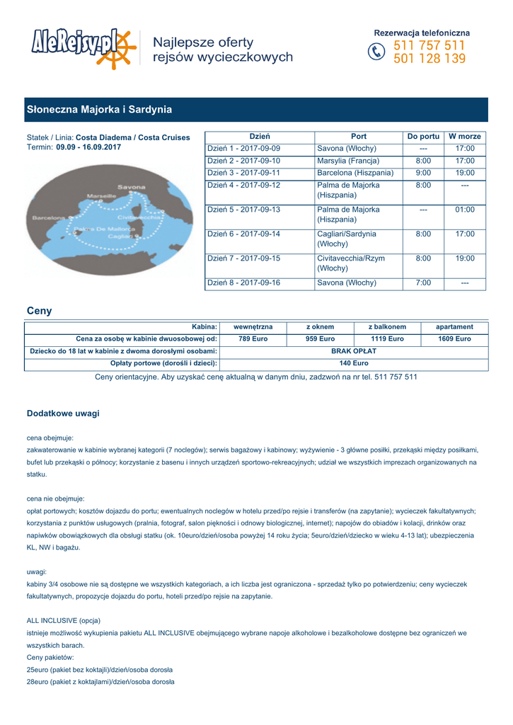 Słoneczna Majorka i Sardynia Statek / Linia: Costa Diadema / Costa Cruises Termin: 09.09 - 16.09.2017 Do portu W morze Dzień 1 - 2017-09-09 Dzień Savona (Włochy) Port --- 17:00 Dzień 2 - 2017-09-10 Marsylia (Francja) 8:00 17:00 Dzień 3 - 2017-09-11 Barcelona (Hiszpania) 9:00 19:00 Dzień 4 - 2017-09-12 Palma de Majorka (Hiszpania) 8:00 --- Dzień 5 - 2017-09-13 Palma de Majorka (Hiszpania) --- 01:00 Dzień 6 - 2017-09-14 Cagliari/Sardynia (Włochy) 8:00 17:00 Dzień 7 - 2017-09-15 Civitavecchia/Rzym (Włochy) 8:00 19:00 Dzień 8 - 2017-09-16 Savona (Włochy) 7:00 --- Ceny Kabina: Cena za osobę w kabinie dwuosobowej od: wewnętrzna z oknem z balkonem apartament 789 Euro 959 Euro 1119 Euro 1609 Euro Dziecko do 18 lat w kabinie z dwoma dorosłymi osobami: Opłaty portowe (dorośli i dzieci): BRAK OPŁAT 140 Euro Ceny orientacyjne. Aby uzyskać cenę aktualną w danym dniu, zadzwoń na nr tel. 511 757 511 Dodatkowe uwagi cena obejmuje: zakwaterowanie w kabinie wybranej kategorii (7 noclegów); serwis bagażowy i kabinowy; wyżywienie - 3 główne posiłki, przekąski między posiłkami, bufet lub przekąski o północy; korzystanie z basenu i innych urządzeń sportowo-rekreacyjnych; udział we wszystkich imprezach organizowanych na statku. cena nie obejmuje: opłat portowych; kosztów dojazdu do portu; ewentualnych noclegów w hotelu przed/po rejsie i transferów (na zapytanie); wycieczek fakultatywnych; korzystania z punktów usługowych (pralnia, fotograf, salon piękności i odnowy biologicznej, internet); napojów do obiadów i kolacji, drinków oraz napiwków obowiązkowych dla obsługi statku (ok. 10euro/dzień/osoba powyżej 14 roku życia; 5euro/dzień/dziecko w wieku 4-13 lat); ubezpieczenia KL, NW i bagażu. uwagi: kabiny 3/4 osobowe nie są dostępne we wszystkich kategoriach, a ich liczba jest ograniczona - sprzedaż tylko po potwierdzeniu; ceny wycieczek fakultatywnych, propozycje dojazdu do portu, hoteli przed/po rejsie na zapytanie. ALL INCLUSIVE (opcja) istnieje możliwość wykupienia pakietu ALL INCLUSIVE obejmującego wybrane napoje alkoholowe i bezalkoholowe dostępne bez ograniczeń we wszystkich barach. Ceny pakietów: 25euro (pakiet bez koktajli)/dzień/osoba dorosła 28euro (pakiet z koktajlami)/dzień/osoba dorosła 16euro/dzień/dziecko Warunkiem skorzystania z pakietu all inclusive jest wykupienie pakietu przez wszystkich pasażerów w kabinie na czas całego rejsu. Costa Diadema ****+Linia: COSTA CRUISESTonaż: 132.500 ton, Długość: 306 m, Szerokość: 37,5 m, Wysokość: 61,45 m, Szybkość: 22,5 węzłów, Pokłady pasażerskie: 20, Załoga: 1.253, Pasażerowie: 4.947, Basen: 2 (samsara spa), Waluta: EURO, Rok produkcji: 2014, Do dyspozycji: Kabiny: 1.854 w tym 838 kabiny z balkonem, 75 apartamentów, wszystkie z prywatnym balkonem z widokiem na morze, 254 kabiny zewnętrzne z widokiem na morze, 687 kabiny wewnętrzne.