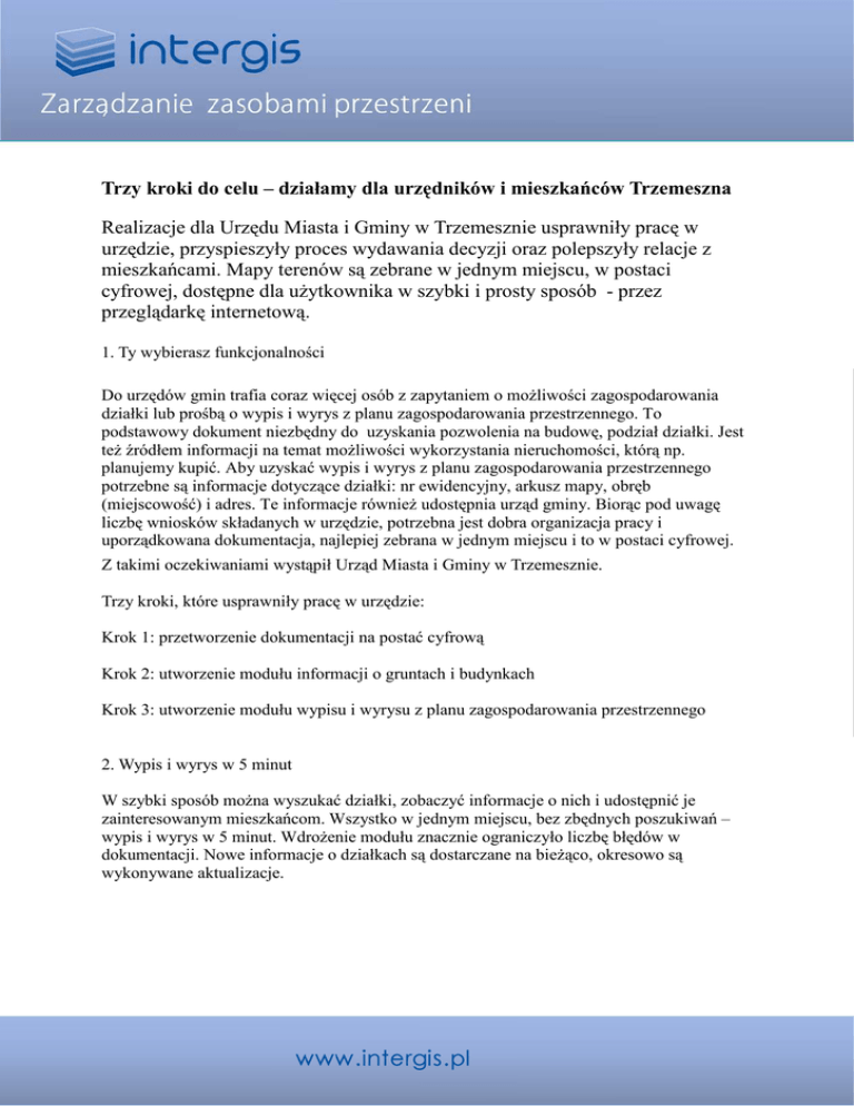 Trzy kroki do celu – działamy dla urzędników i mieszkańców Trzemeszna Realizacje dla Urzędu Miasta i Gminy w Trzemesznie usprawniły pracę w urzędzie, przyspieszyły proces wydawania decyzji oraz polepszyły relacje z mieszkańcami. Mapy terenów są zebrane w jednym miejscu, w postaci cyfrowej, dostępne dla uŜytkownika w szybki i prosty sposób - przez przeglądarkę internetową. 1. Ty wybierasz funkcjonalności Do urzędów gmin trafia coraz więcej osób z zapytaniem o moŜliwości zagospodarowania działki lub prośbą o wypis i wyrys z planu zagospodarowania przestrzennego. To podstawowy dokument niezbędny do uzyskania pozwolenia na budowę, podział działki. Jest teŜ źródłem informacji na temat moŜliwości wykorzystania nieruchomości, którą np. planujemy kupić. Aby uzyskać wypis i wyrys z planu zagospodarowania przestrzennego potrzebne są informacje dotyczące działki: nr ewidencyjny, arkusz mapy, obręb (miejscowość) i adres. Te informacje równieŜ udostępnia urząd gminy. Biorąc pod uwagę liczbę wniosków składanych w urzędzie, potrzebna jest dobra organizacja pracy i uporządkowana dokumentacja, najlepiej zebrana w jednym miejscu i to w postaci cyfrowej. Z takimi oczekiwaniami wystąpił Urząd Miasta i Gminy w Trzemesznie. Trzy kroki, które usprawniły pracę w urzędzie: Krok 1: przetworzenie dokumentacji na postać cyfrową Krok 2: utworzenie modułu informacji o gruntach i budynkach Krok 3: utworzenie modułu wypisu i wyrysu z planu zagospodarowania przestrzennego 2. Wypis i wyrys w 5 minut W szybki sposób moŜna wyszukać działki, zobaczyć informacje o nich i udostępnić je zainteresowanym mieszkańcom. Wszystko w jednym miejscu, bez zbędnych poszukiwań – wypis i wyrys w 5 minut. WdroŜenie modułu znacznie ograniczyło liczbę błędów w dokumentacji. Nowe informacje o działkach są dostarczane na bieŜąco, okresowo są wykonywane aktualizacje. Rys. 1 Informacje o gruntach i budynkach – wyszukiwanie działek Rys. 2 Informacje o gruntach i budynkach – wyszukiwanie adresów Rys. 3 Plan zagospodarowania przestrzennego – rejestr wniosków o wypis i wyrys z planu Rys. 4 Wypis i wyrys z planu zagospodarowania przestrzennego miasta Korzyści z 3 kroków: 1. szybki dostęp do informacji 2. usprawnienie procesu podejmowania decyzji 3. eliminacja błędów 4. optymalizacja czasu pracy 5. lepsza komunikacja z mieszkańcami i potencjalnymi inwestorami Nasze rozwiązania w urzędzie ułatwiły sprawne zarządzanie, przeprowadzanie analiz oraz pozyskiwanie rzetelnych danych. Informacje są pełne, jednoznaczne i szybko dostępne. Konieczność stałej aktualizacji danych zapewnia ich wysoką wartość dla uŜytkowników. Uzyskaliśmy rozwiązanie w pełni funkcjonalne, a jednocześnie stanowiące fundament do rozszerzania zakresu działań, dodawania nowych warstw tematycznych itd. Mechanizm rozwiązania jest taki sam niezaleŜnie od wielkości miasta, zasięgu działania, liczby mieszkańców – ten sam poziom profesjonalizmu oraz wysokiej jakości narzędzia dopasowane do specyfiki pracy w urzędzie. © 2010 CADExpert sp. z o.o., Wszelkie prawa zastrzeŜone
