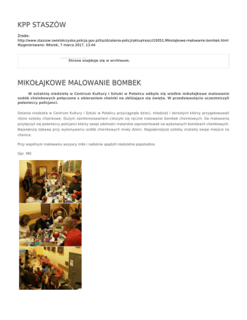 KPP STASZÓW Źródło: http://www.staszow.swietokrzyska.policja.gov.pl/tsz/dzialania-policji/aktualnosci/10051,Mikolajkowe-malowanie-bombek.html Wygenerowano: Wtorek, 7 marca 2017, 13:44 Strona znajduje się w archiwum. MIKOŁAJKOWE MALOWANIE BOMBEK W ostatnią niedzielę w Centrum Kultury i Sztuki w Połańcu odbyło się wielkie mikołajkowe malowanie ozdób choinkowych połączone z ubieraniem choinki na zbliżające się święta. W przedsięwzięciu uczestniczyli połanieccy policjanci. Ostania niedziela w Centrum Kultury i Sztuki w Połańcu przyciągnęła dzieci, młodzież i dorosłych którzy przygotowywali różne ozdoby choinkowe. Dużym zainteresowaniem cieszyło się ręczne malowanie bombek choinkowych. Do malowania przyłączyli się połanieccy policjanci którzy swoje zdolności malarskie zaprezentowali na wykonanych bombkach choinkowych. Największą zabawę przy wykonywaniu ozdób choinkowych miały dzieci. Najpiękniejsze ozdoby znalazły swoje miejsce na choince. Przy wspólnym malowaniu wszyscy miło i radośnie spędzili niedzielne popołudnie. Opr. MD Ocena: 0/5 (0) Tweetnij
