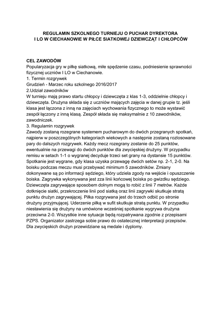 REGULAMIN SZKOLNEGO TURNIEJU O PUCHAR DYREKTORA I LO W CIECHANOWIE W PIŁCE SIATKOWEJ DZIEWCZĄT I CHŁOPCÓW CEL ZAWODÓW Popularyzacja gry w piłkę siatkową, miłe spędzenie czasu, podniesienie sprawności fizycznej uczniów I LO w Ciechanowie. 1. Termin rozgrywek Grudzień - Marzec roku szkolnego 2016/2017 2.Udział zawodników W turnieju mają prawo startu chłopcy i dziewczęta z klas 1-3, oddzielnie chłopcy i dziewczęta. Drużyna składa się z uczniów mających zajęcia w danej grupie tz. jeśli klasa jest łączona z inną na zajęciach wychowania fizycznego to może wystawić zespół łączony z inną klasą. Zespół składa się maksymalnie z 10 zawodników, zawodniczek. 3. Regulamin rozgrywek Zawody zostaną rozegrane systemem pucharowym do dwóch przegranych spotkań, najpierw w poszczególnych kategoriach wiekowych a następnie zostaną rozlosowane pary do dalszych rozgrywek. Każdy mecz rozegrany zostanie do 25 punktów, ewentualnie na przewagi do dwóch punktów dla zwycięskiej drużyny. W przypadku remisu w setach 1-1 o wygranej decyduje trzeci set grany na dystansie 15 punktów. Spotkanie jest wygrane, gdy klasa uzyska przewagę dwóch setów np. 2-1, 2-0. Na boisku podczas meczu musi przebywać minimum 5 zawodników. Zmiany dokonywane są po informacji sędziego, który udziela zgody na wejście i opuszczenie boiska. Zagrywka wykonywana jest zza linii końcowej boiska po gwizdku sędziego. Dziewczęta zagrywające sposobem dolnym mogą to robić z linii 7 metrów. Każde dotknięcie siatki, przekroczenie linii pod siatką oraz linii zagrywki skutkuje stratą punktu drużyn zagrywającej. Piłka rozgrywana jest do trzech odbić po stronie drużyny przyjmującej. Uderzenie piłką w sufit skutkuje stratą punktu. W przypadku niestawienia się drużyny na umówione wcześniej spotkanie wygrywa drużyna przeciwna 2-0. Wszystkie inne sytuacje będą rozpatrywana zgodnie z przepisami PZPS. Organizator zastrzega sobie prawo do ostatecznej interpretacji przepisów. Dla zwycięskich drużyn przewidziane są medale i dyplomy.