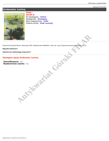 Informacje o wydawnictwie Utworzono 07-03-2017 Grobowiec Lenina. Cena : 50,40 zł LA R Nr katalogowy : 41612 Dostępność : Dostępny Stan magazynowy : niski Średnia ocena : brak recenzji Tłumaczył Krzysztof Obłucki. Warszawa 1997. Wydawnictwo MAGNUM. s.630. opr. oryg. kartonowa twarda lakierowana. 24 cm. FI Nagroda Pulitzera!!! sk i Ostatnie dni radzieckiego imperium!!! Dostępne opcje Grobowiec Lenina. An ty k w ar ia t G ór Zweryfikowane: Tak. Wydawnictwo zwarte: Tak. Wygenerowano w programie www.oscGold.com