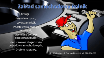 Usługi : -Wymiana opon, -Wyważanie kół, -Podstawowa obsługa motocykli, -Wymiana płynów eksploatacyjnych, -Podstawowa diagnostyka pojazdów samochodowych, -Drobne naprawy. 14-100 Ostróda Ul. Czarnieckiego 69 tel. 516-284-688
