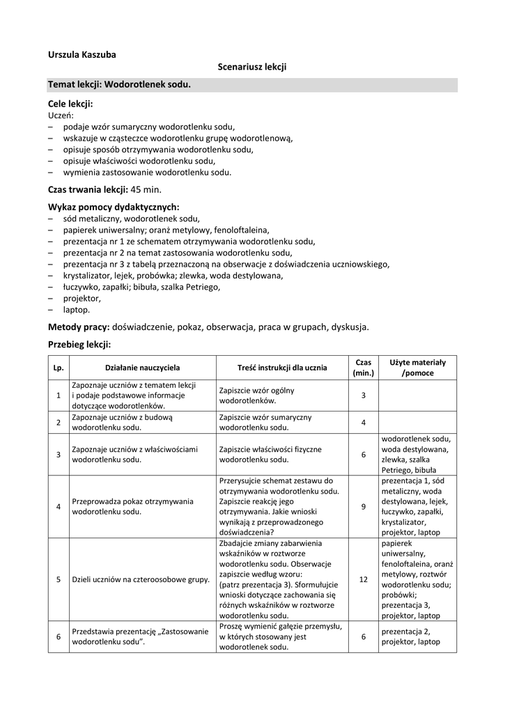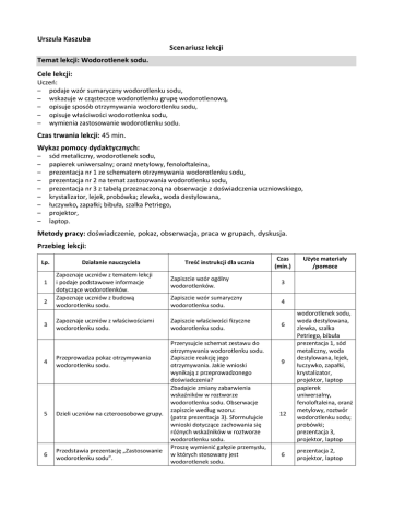 Urszula Kaszuba Scenariusz lekcji Temat lekcji: Wodorotlenek sodu